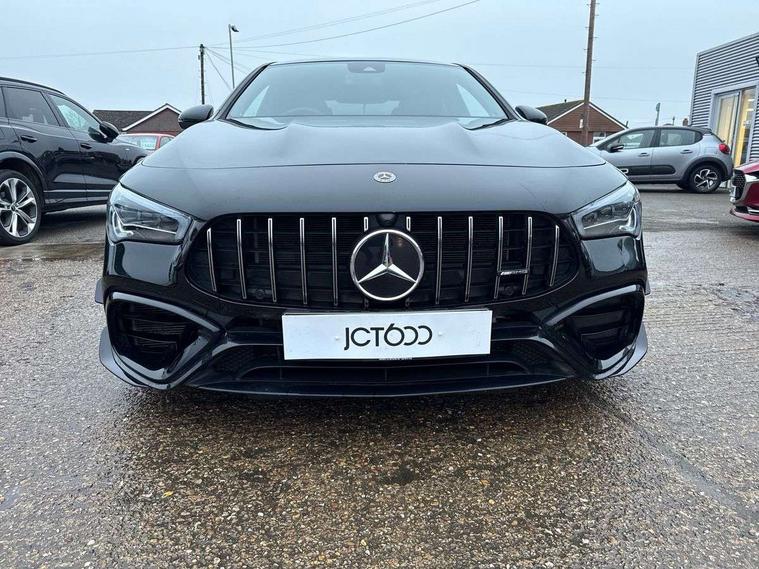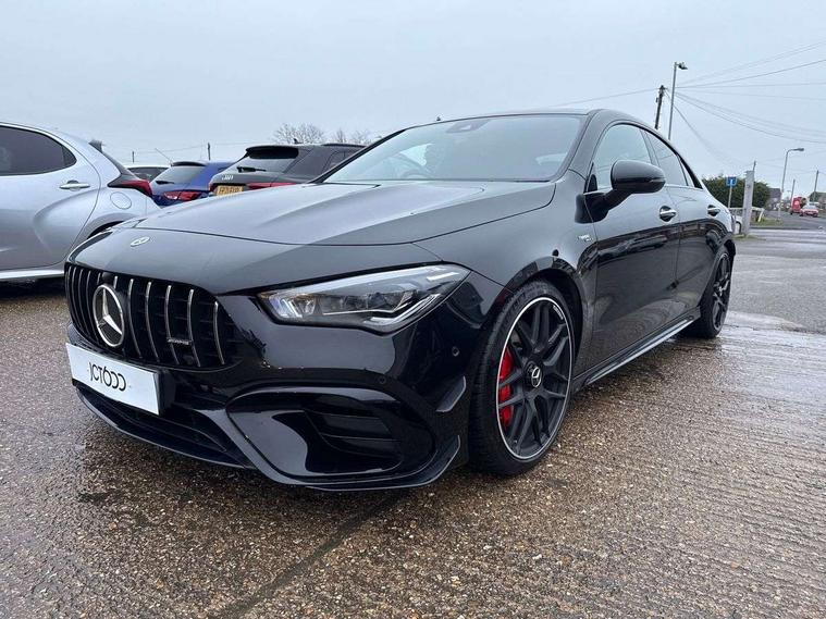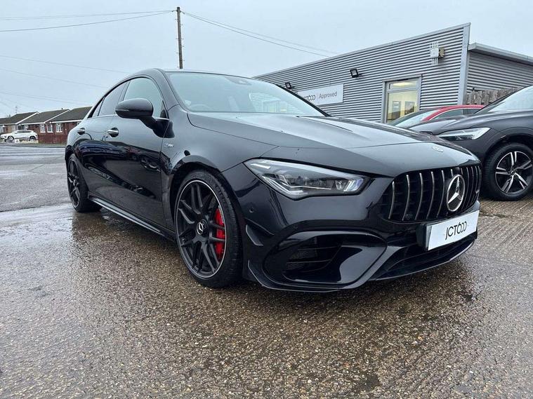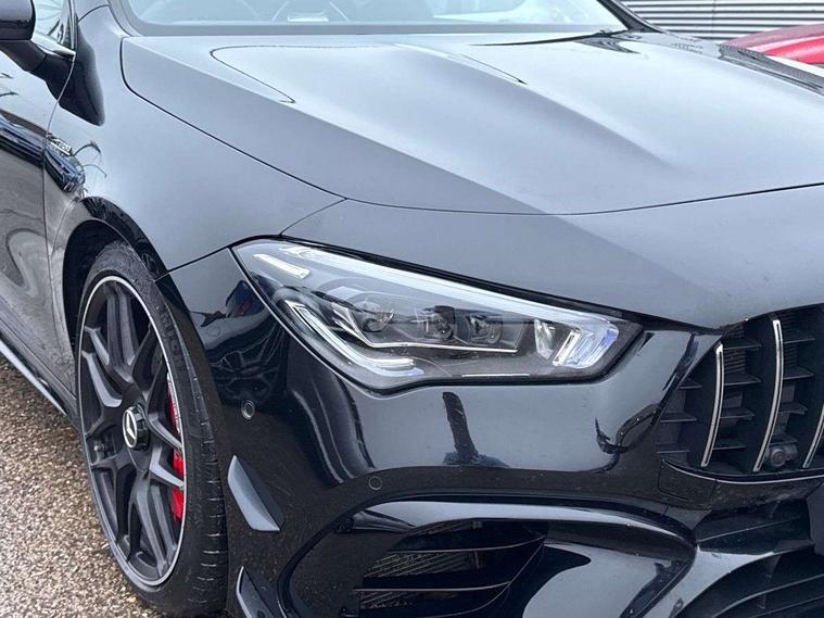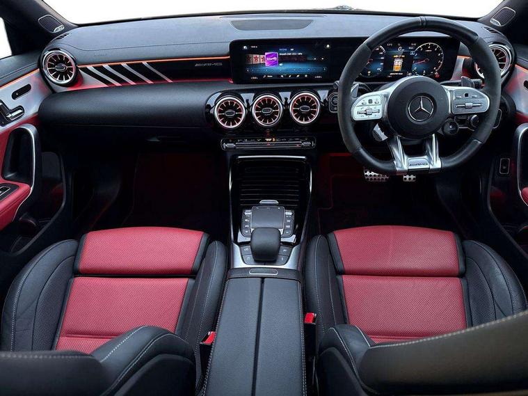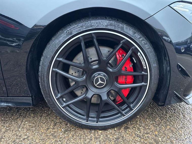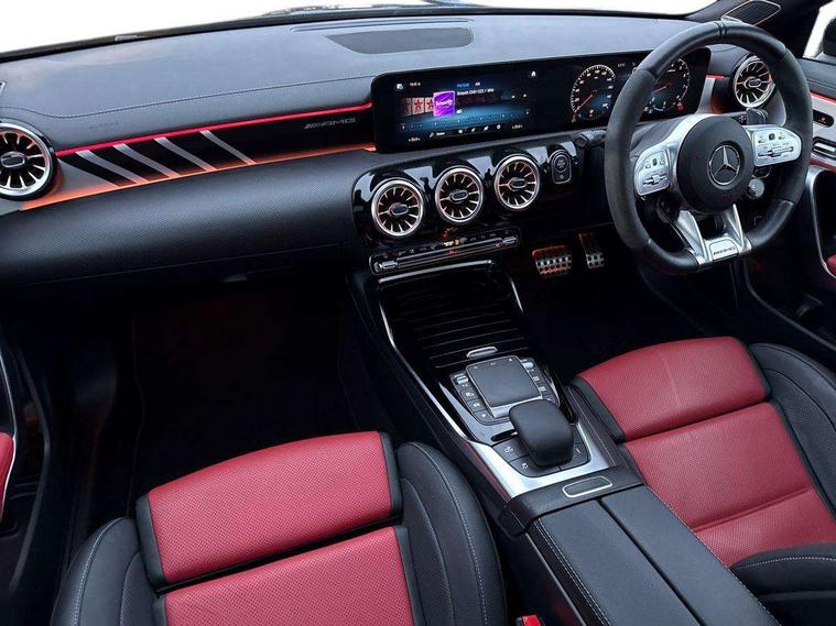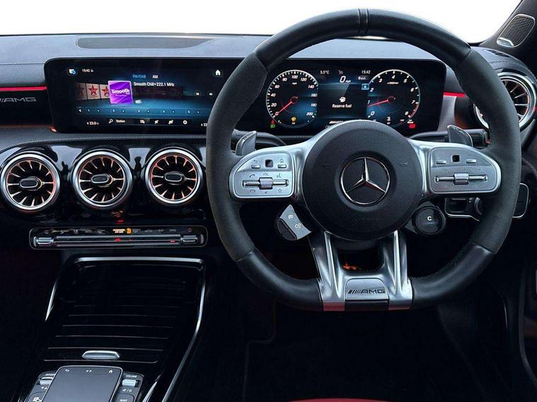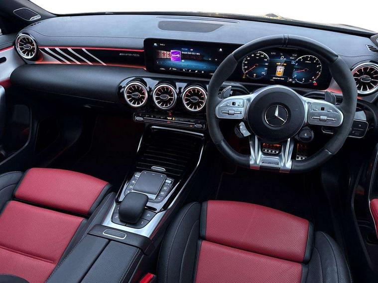 10.25 inch Instrument display with digital cockpit, 10.25 inch touchscreen central media display with AMG specific, AMG start up logo, visualisation of the AMG drive programs, vehicle and engine data, Active lane keeping assist, AMG DYNAMIC SELECT with drive programs Slippery, Comfort, Sport, Sport+, Individual and RACE including Drift mode activated + RACE START function, AMG menu with sporty additional information - Gear indicator with yellow M symbol manual mode, Warm Up menu and Set Up menu, Attention assist - Monitors steering behaviour and long journey fatigue, Blind spot assist, Bluetooth connection, Car wash mode, Cruise control with limiter, Direct steer system with AMG speed sensitive power steering with two sets of steering characteristics, ECO start/stop function, Fluid level warning indicator for fuel, oil, coolant and washer fluid, Hard-disk navigation, Hey Mercedes Voice activation, Lamp failure indicator, Mercedes me connect including emergency call system, accident recovery, breakdown management and maintenance, Mercedes me remote services, Outside temperature gauge, Owners manual and service booklet in English, Pre-installation of private car share, Preinstallation for Mercedes Benz link, Radio aerial integrated into front and rear windshields, Service indicator (ASSYST), Smartphone integration with Apple CarPlay and Android auto, Speed limit assist, Traffic sign assist, Trip computer in multifunction display with current consumption indicator, AMG performance 4MATIC+ with torque control distribution, Rear axle multi-link, Suspension with adaptive damping system, DAB digital radio tuner, MBUX multimedia system, Mid-range sound system, USB (type C) ports (2) in stowage compartment and 1 in front of centre console, Adaptive brake lights, AMG body styling specific front apron, AMG side sill panels, AMG rear apron, AMG roof spoiler lip, Specific S labelling boot lid + front apron CLA 45, AMG specific radiator grille in high gloss chrome with AMG lettering, AMG specific radiator grille with a wider lower contour and twelve vertical louvres, AMG spoiler lip in body colour, AMG wider side skirts, Automatically controlled exhaust flap, Beltline strips in High gloss Black, Body colour bumpers, Body colour door handles, Chrome weather strip, Diffuser with two vertical twin fins, Electric panoramic sunroof with automatic tilt and convenience closing fuinctions, rain sensor auto closing and electronic roller sunblind, Electric windows, Electrically adjustable and heated door mirrors with integrated LED indicators, Exhaust system with AMG Real Performance Sound (Balanced or Powerful settings), Front apron with horizontal fins in the outer air inlets and stretched lower air inlet, Headlamp assist automatic headlamp activation, Heated glass rear windscreen + timer control, High level LED third brake light, Integrated LED daytime running lights, Interior mirror with black reading lamps and frameless, LED tail lamp, Multibeam LED headlamps with adaptive highbeam assist plus, Privacy glass with dark tinting on rear side windows and rear window, Rain sensing windscreen wipers with two sensitivity settings, Rear boot, Rear fog lamp, Rear side wing doors, Two round twin tailpipe trim elements each measuring 90 mm in diameter and AMG lettering plus ribbing on the inside of the pipe, Valve control dependent on drive program, Variable front intermittent wipers, Window line trim strip in high gloss black, 3 seat bench in 2nd row, 3 spoke flattened lower sporty design AMG Performance steering wheel with Nappa/MICROCUT microfiber, grip area, 12 clock mark +AMG letter silver chrome, 40:20:40 split folding rear seats with backrest, Air conditioning - Two zone thermotronic luxury automatic climate control with display, Air vents with surround in silver chrome, AMG brushed stainless steel sports pedals with rubber studs, AMG centre console decidedly sporty with raised front section, AMG centre console finished with trim in silver chrome, AMG Performance sportily shaped seats with power adjustable front seats, special seat cushions + AMG badge backrests, AMG Steering wheel touch control buttons, Automatic child seat recognition sensor, Black roof lining, Electrically adjustable front memory seats including lumbar support, Fixed head restraints, Floor mats with stitched AMG lettering, Front centre armrest with stowage, Heated front seats, Illuminated front door sills with changeable cover, Illuminated glove compartment stowage, Interior lighting - 64 colour Ambient lighting, Manually height and reach adjustable steering column, Rear armrest with two integral cup holders for drinks, Silver coloured aluminium gear shift paddles on steering wheel, Single front passenger seat, Stowage compartment in centre console with retractable cover, Sunvisors with illuminated vanity mirrors, Touchpad on center console, Twin front cupholders, Two outer rear seat isofix and top tether child seat fixing points, Aerodynamics pack - CLA, AMG driver's package - CLA, AMG Multi contour seat pack - CLA, AMG Night package - CLA 35/45, AMG performance seat pack (High End) - CLA 45 S 4Matic+ Plus, Keyless go comfort pack - CLA, Light and sight pack - CLA, Mirror pack - CLA, Parking package - CLA, Seat comfort pack - CLA, Active bonnet pedestrain safety measure which detects an impact and raises bonnet by 65mm, Active brake assist includes forward collision warning system with autonomous braking, Adaptive brake assist with hold function and hill start assist, AMG high performance brake system with red painted brake callipers and black AMG lettering at the front, ventilated and perforated brake discs, Anti lock braking system (ABS) with brake assist, Black seat belts, Bonnet with power domes, Brake pad wear warning indicator, Childproof locks manually operated for rear doors and electrically operated for rear power windows, Crash responsive emergency lighting, Driver and front passenger head and sidebags, Driver and front passenger