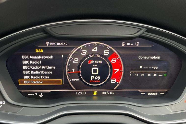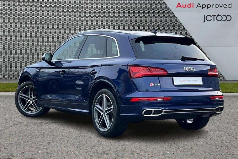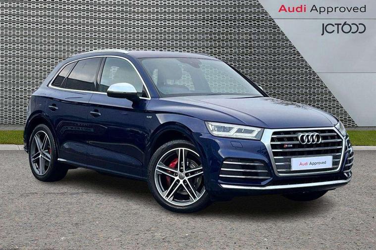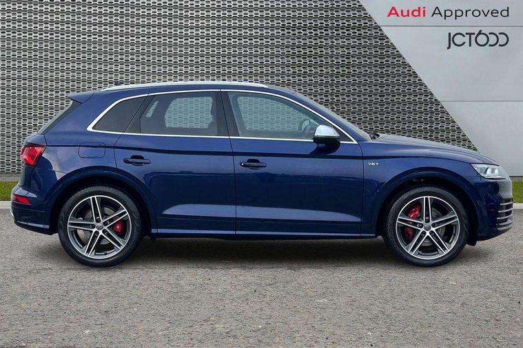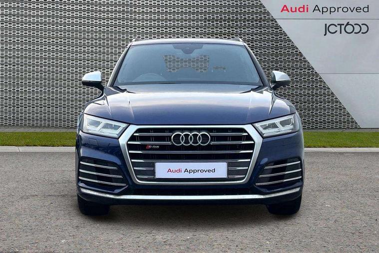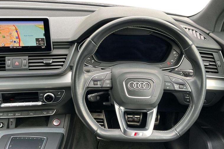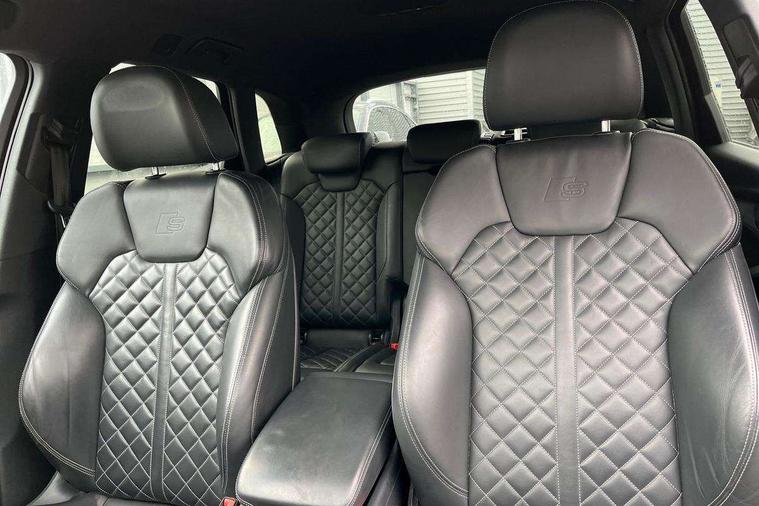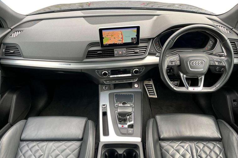 Fine Nappa leather with diamond pattern stitching, Extended interior upholstery pack - Q5, Non Smokers pack, Keyless Go access/ignition system, Locking wheel bolts, Remote central locking, Thatcham category 1 alarm + immobiliser, 2 USB ports, 2x SD card slot, Audi sound system, Auxiliary input socket, CD player, DAB Digital radio, MMI radio plus with 7" colour MMI screen and MMI controller, 3 point seatbelts on all seats, ABS, Curtain airbags, Driver and passenger airbags, Driver and passenger side airbags, Electromechanical parking brake, ESC with ASR, ESP, First aid kit, Front passenger airbag deactivation, Hill descent control, Seat belt force limiter, Seatbelt warning lamp, Traction control, Tyre pressure monitor, Warning triangle, Acoustic windscreen, Aluminium roof rails, Aluminium sill plates, Auto dimming rear view mirror, Black high gloss front air inlet in matt aluminium effect, Body colour bumpers, Body colour door mirrors, Body colour rear diffuser insert, Chrome exhaust tailpipe, Electric headlight adjustment, Electrically adjustable and heated door mirrors, Front and rear electric windows, Front fog lights, Headlight range control, Headlight washers, High beam assistant, Honeycomb side air inlet in titan black, Light and rain sensor for auto activation of lights and windscreen wipers, Loading sill protector in stainless steel, Privacy glass with front acoustic glazing, Rear diffuser strip in matt aluminium silver, Rear spoiler, Rear wiper, S Line side skirts, Selenite silver underbody guard, Twilight grey matt radiator grille with matt aluminium horizontal chrome struts, 3 rear headrests, 3 zone climate control, 4 way electric lumbar support for driver and front passenger, 40:20:40 split folding rear seat, Black cloth headlining, Fine Nappa leather upholstery, Front centre armrest with 12v socket, Front sports seats, Front/rear floor mats, Height adjustable driver's seat, Height adjustable front head restraints, Illuminated door sills, Isofix front passenger and rear seat preparation, Jack and tool kit, Load compartment cover, Luggage compartment carpet, Matt selenite silver door inserts, Perforated leather gearknob, Reach + rake adjustable steering column, Rear seat bench plus with through load+rear centre armrest+cupholders, Removable luggage compartment floor, Removable net partition, Roller blind loadspace cover, Stainless steel pedals, Sunvisors with vanity mirrors, Audi connect, Audi drive select, Audi smartphone interface, Driver information centre with colour display in instrument panel, MMI Navigation plus, Power tailgate, Remote electric boot opening/closing, Service interval indicator, Voice control system,