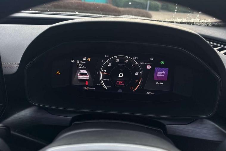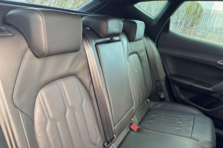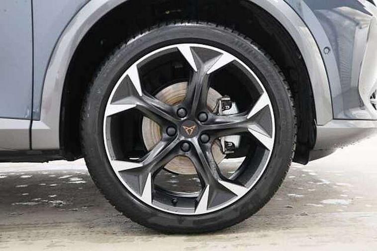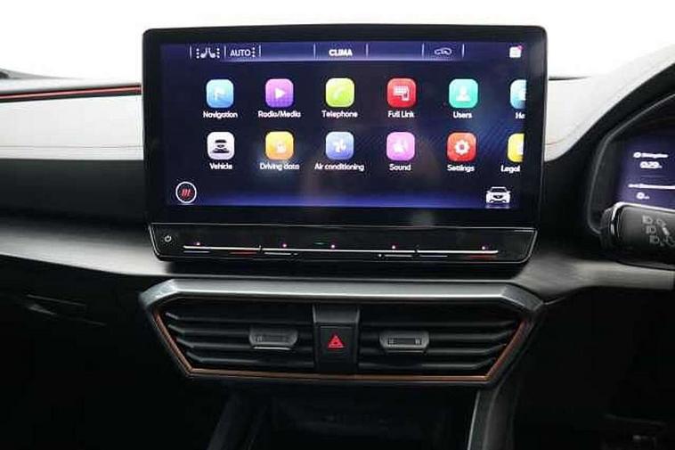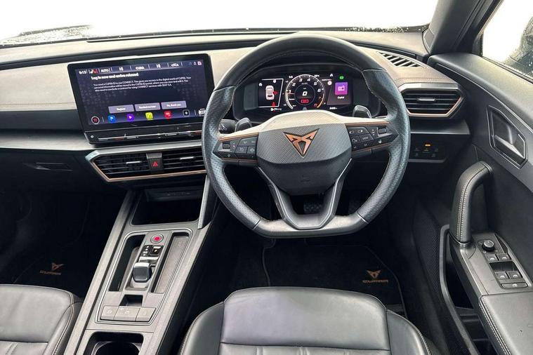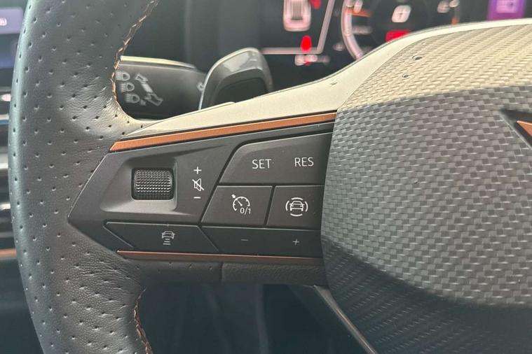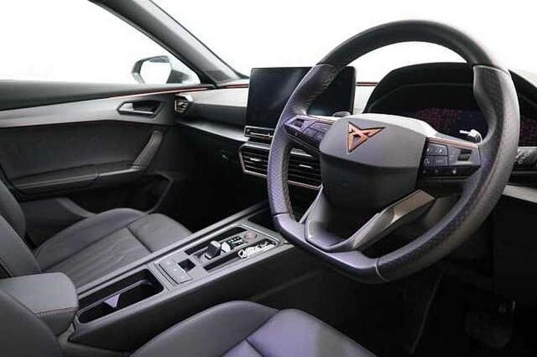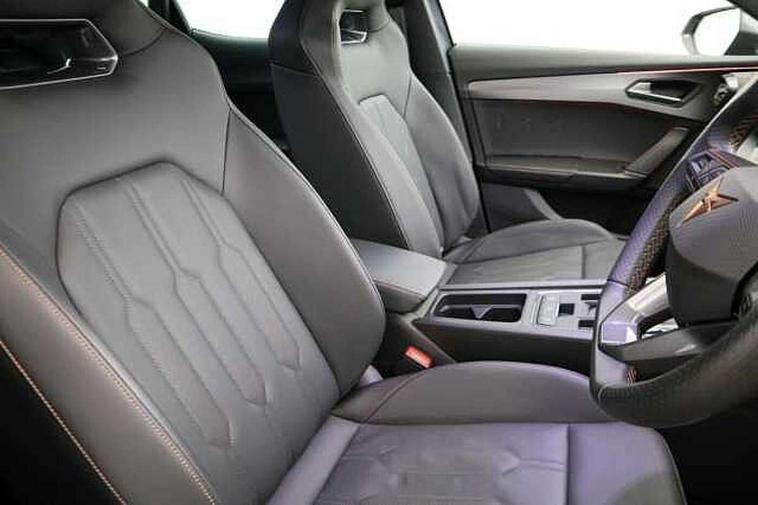 Digital cockpit and configurable dashboard, Driver alert system, Driving profile selection, Forward collision warning with automatic braking, Lane assist, Navigation system with 12'' Touchscreen Display, Park assist (inc front/rear parking sensors), PAS, Predictive adaptive cruise control with speed limiter, Rear view camera, RPM, trip computer, outside temp gauge, instrument light brightness, low fuel warning light, lights on reminder, gearshift indicator, Service interval indicator, Start/stop system with regenerative braking, Voice control system, Wireless apple carplay, Wireless phone charger, Electronic locking differential and dynamic traction support, Standard suspension, 2 front and 2 rear USB type C sockets, Auxiliary input socket, DAB radio, Auto dimming rear view mirror, Body colour door handles, Body coloured bumpers, Dark grey wing mirror, Daytime running light with automatic headlight control and coming home feature, Dynamic headlight range control, Electric front/rear windows, Electrically adjustable heated and folding door mirrors with memory function, Front fog lamps with cornering function, Gloss black roof rails and window surrounds, LED Headlights, LED Taillights with dynamic indicator, Rain sensing wipers, Rear diffuser with black simulated exhaust pipes, Rear side wing doors, Rear wash/wipe, Third brake light, Tinted rear windows, Welcome lights, 12v power supply in centre console, 12V socket, 12v socket in loadspace, 2 front and 2 rear reading lights, 230V socket, 3 seat bench in 2nd row, 60/40 split rear bench seat with armrest and mechanical seat release, Black headlining, Dust/pollen filter, Front and rear head restraints, Front centre armrest, Height/reach adjust steering wheel, Illuminated interior front door sills, Illuminated sunvisor with mirror, Isofix, Leather multi function heated steering wheel with gear shift paddles, Luggage tie-down hooks, Single front passenger seat, Three zone climate control with control panel in rear, Variable luggage/load compartment floor, Wraparound lighting, Genuine Nappa leather Pack - Cupra, 3 point seatbelts on all rear seats, ABS, Brake control system - ESC and brake booster, Child proof door locks, Driver and front passenger airbags with front passenger airbag de-activation, Electronic parking brake, Front and rear disc brakes, Front side curtain airbags, Hill hold control, Public e-call, Seat belt reminder for front and rear seats, Tyre pressure monitoring system, Anti theft alarm system, Keyless entry and start system (KESSY), Locking wheel bolts, Copper and aluminium interior detailing, 19" 'Exclusive' machined sport matte black and silver alloy wheels,