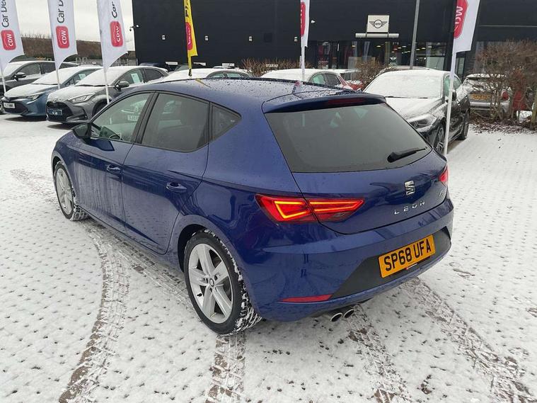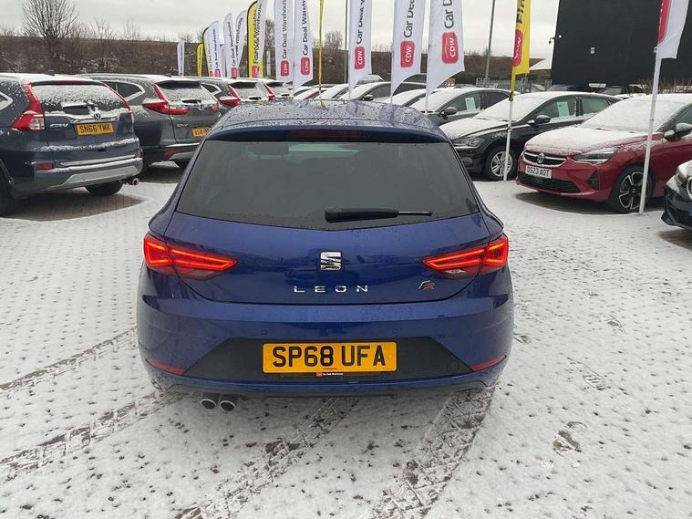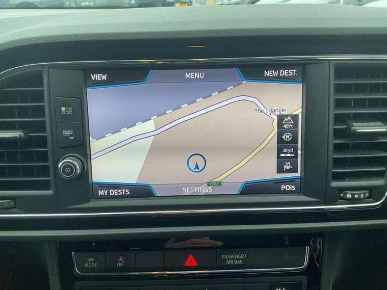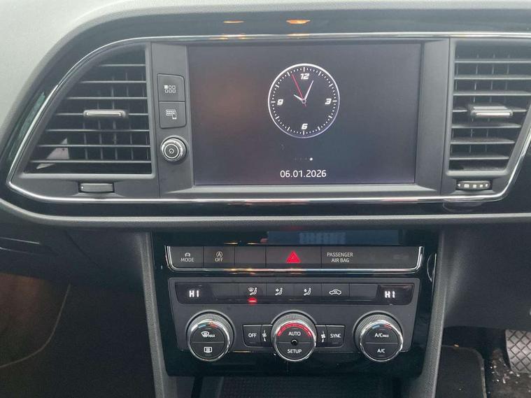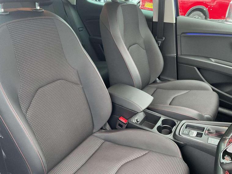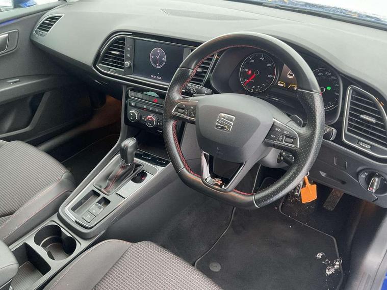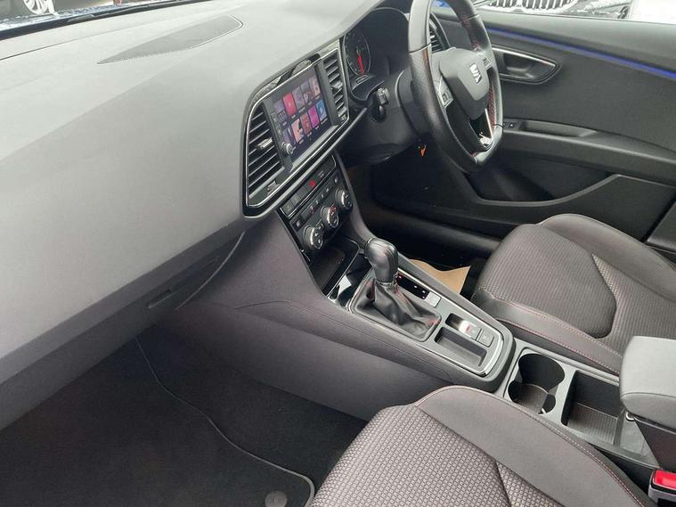 'Lights On' Reminder warning buzzer, 8" touch screen, Bluetooth Handsfree Phone Connection, Low fuel warning light, Outside temperature gauge, Rear parking sensors, Remote fuel flap release, SEAT Drive profile, SEAT logo boot release, Service interval indicator, Trip computer, Voice control system, XDS electronic differential lock, 2 USB ports, 2 USB sockets in rear, 2x SD card slot, Auxiliary input socket, Bluetooth audio streaming, DAB Digital radio, Radio/CD + MP3, Steering wheel mounted audio/phone controls, Aluminium front door sills, Black grille with chrome surround, Body colour door handles, Body coloured bumpers, Body coloured door mirrors, Dark tinted rear windows, Electric adjustable/heated/folding door mirrors, Electric front/rear windows with one touch/auto up/down, Electric headlamp adjustment, High gloss black finish B and C pillars, LED daytime running lights, LED front fog lights, LED Headlights, LED indicators in door mirrors, LED number plate light, LED tail lights, Rear wash/wipe, Reverse activated kerb-view adjustment on passenger's door mirror, Twin exhaust pipes, 12v power point in centre console, 3 height adjustable rear headrests, 60/40 split folding rear seat, Active head restraints, Additional heating and ventilation outlet in rear of centre console, Boot net, Driver seat height adjust, Driver seat lumbar adjustment, Driver/passenger sunvisors with illuminated vanity mirrors, Dual zone climate control, Dust/pollen filter, Front adjustable head restraints, Front armrest with storage box, Front cupholders x 2, Front seat and rear pockets, Front sports seats, Front/rear floor mats, Height/reach adjust steering wheel, Illuminated boot, Illuminated door sills, Illuminated glovebox, Illuminated rear centre console, Instrument lighting with brightness control, Leather handbrake, Luggage tie-down hooks, Passenger seat height adjuster, Passenger seat lumbar adjust, Perforated leather steering wheel with red stitching + gear knob, Rear top tether child seat ISOFIX attachment, Steering wheel gearshift paddles, Storage boxes under front seats, 3 point seatbelts on all rear seats, ABS + traction control, Active pedestrian safety system, Child proof door locks, Collision mitigation braking system, Curtain airbags, Driver/Front Passenger airbags, Drivers knee airbag, Electronic parking brake with auto hold, ESP+EBA, Front assist including city emergency braking, Front seatbelt pretensioners, Front Seatbelt warning, Front side airbags, Hill hold control, Manual passenger airbag deactivation function, Tyre pressure monitoring system, 2 folding remote keys with window open/close function, Engine immobiliser, Locking wheel bolts, Remote central locking + deadlocks, Volumetric alarm with back up horn, Chrome interior trim,
