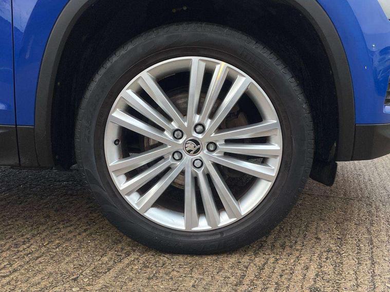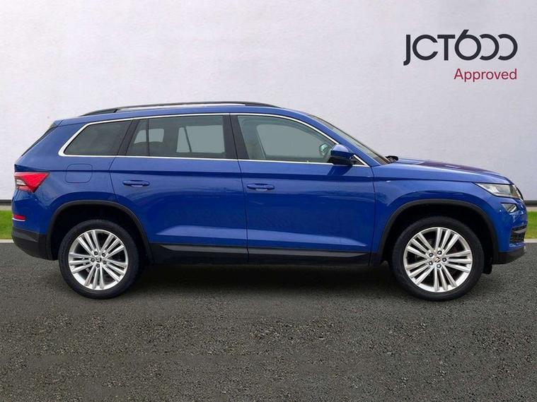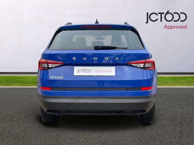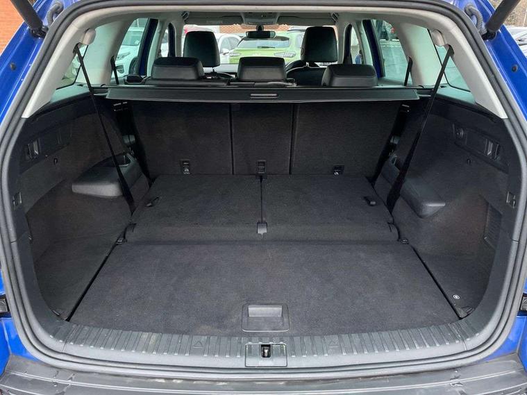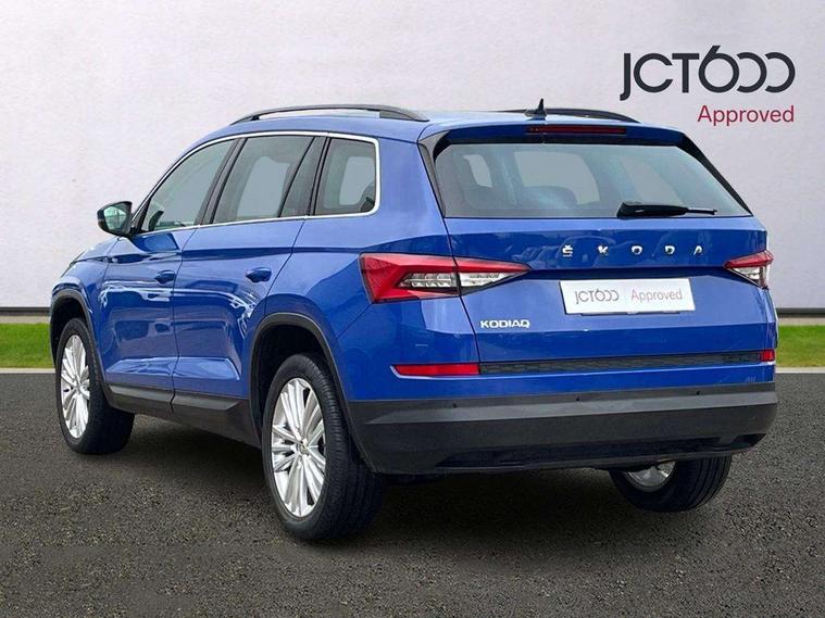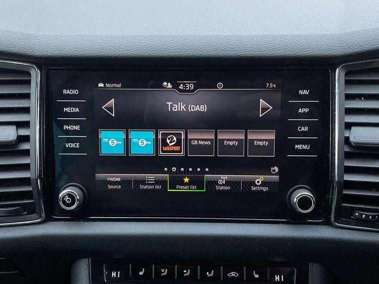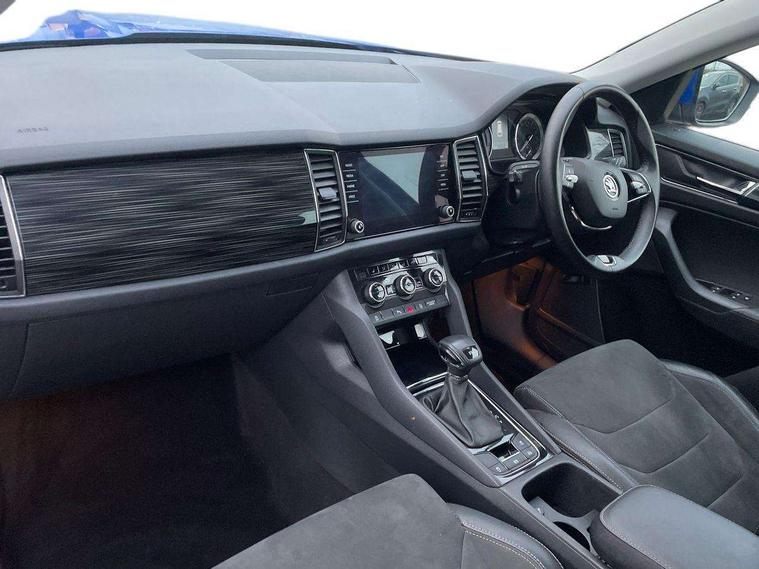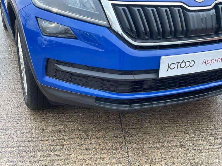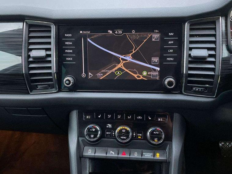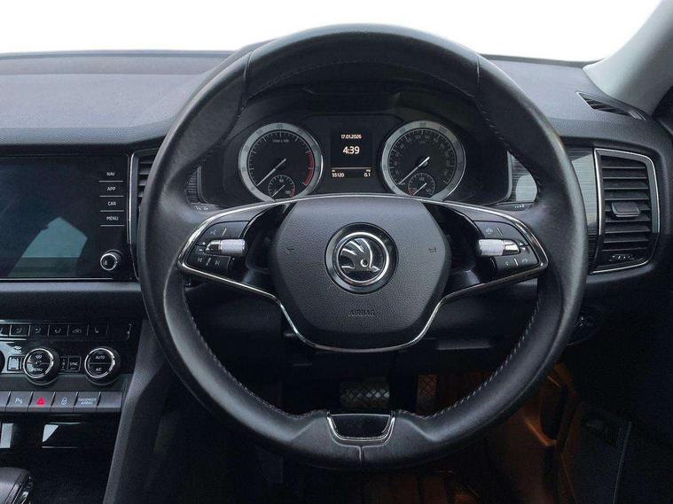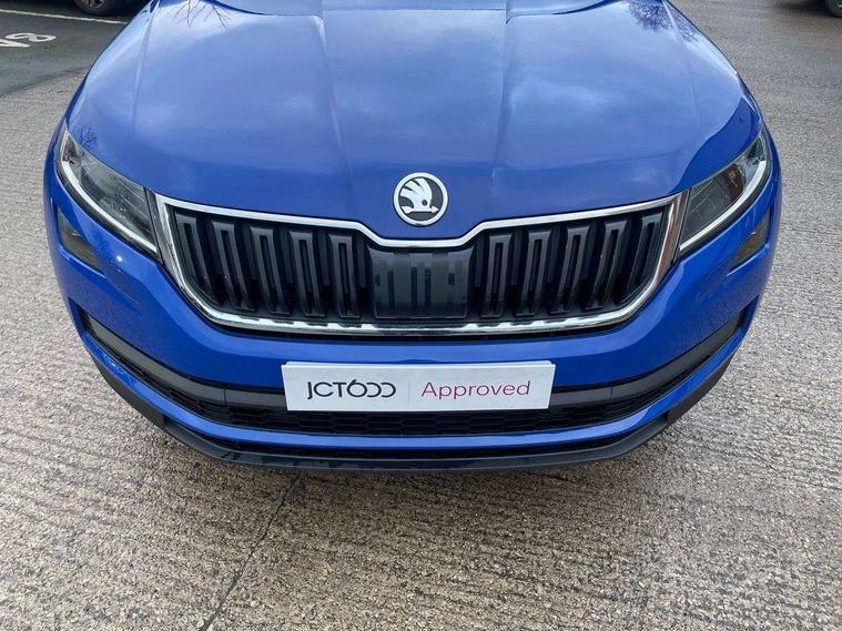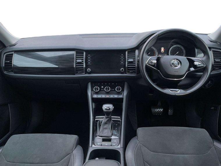 Bluetooth system, Digital voice enhancement, ECO Stop/start function, Exterior temperature indicator, Map care, Smartlink wireless for apple carplay and wired for android auto, Speed limiter, Tailgate unlocking from outside, USB C Port x 2 in front centre console, DAB Digital radio, Aero front windscreen wipers with intermittent function, Aero rear window wiper, Auto dimming rear view mirror, Automatic activation of hazard warning lights, Black electric window control buttons, Black wheel arch surrounds, Body colour bumpers, Body colour door mirrors and handles, Electric adjustable heated door mirrors with integrated indicators, Electric front and rear windows, Electrically folding and auto dimming door mirrors, Front and Rear door steps, Full LED Headlights with adaptive front light system and LED daytime running lights, Headlight washers, Heated rear window, Invisible tailpipe, LED front fog lights with static cornering light function, LED rear fog light, LED third brake light in rear spoiler, Light assistant (coming home/tunnel light), Radiator grille frame in matt black with chrome strip, Rain and light sensors, Rear spoiler, Safety reflectors on front and rear doors, Sunset privacy glass, 12V socket in boot, 2 rails with 2 hooks including 4 hooks for net programme, 4 foldable roof handles with rear coat hooks, 4 lashing points on luggage floor, 60:40 foldable rear seat with sliding adjustment and backrest angle adjustment, Bottle holders in door panel in the 1.5 litre front and 1 litre rear, Cargo storage compartments, Centre console with open storage box, cup holder and 12V socket, Chrome headlight control button, Chrome interior door handles, Coat hooks on B pillar, Covered storage compartment on driver side, Front and rear door armrest with black adductor trim, Front and rear height adjustable headrests, Front centre armrest with storage compartment, cup holder and 12V socket, Front courtesy lights, Gear shift lever with chrome frame and black gloss insert, Illuminated and cooled glovebox, Illuminated luggage compartment, Isofix child seat fittings in outer rear seats with top tether, Manually adjustable steering column, Net programme in boot (1x horizontal Net, 2x vertical Nets), Overhead glasses storage compartment, Pollen filter, Rear centre armrest with cupholders, Roll up luggage compartment cover with intermediate position, Small Bags on the inner sides of the front backrests, Storage compartment in lower middle instrument panel with closing, Three rear height adjustable headrests, Ticket holder on A Pillar, Umbrella in door panel, Chrome pack - Kodiaq, Auto door release and activation of warning lights in the event of an accident, Driver and passenger airbags, Electronic parking brake with hill hold control, Emergency rear braking signal, ESC (incl. ABS+MSR+ASR+EDS+HBA+DSR+RBS+MKB), Front and rear three point safety belt on all seats, Front assist includes AEB city/urban, Front passenger airbag deactivation switch, Front side airbags, Fuel cut off safety device, Head and knee airbags, Rear disc brakes, Safety vest holder in door, Seat belt reminder for all seats, Two tone horn, Tyre pressure monitor, Warning lights in front doors, Alarm with interior monitoring and tilt sensor with safe function, Immobiliser, Keyless entry and start system (KESSY), Remote central locking,