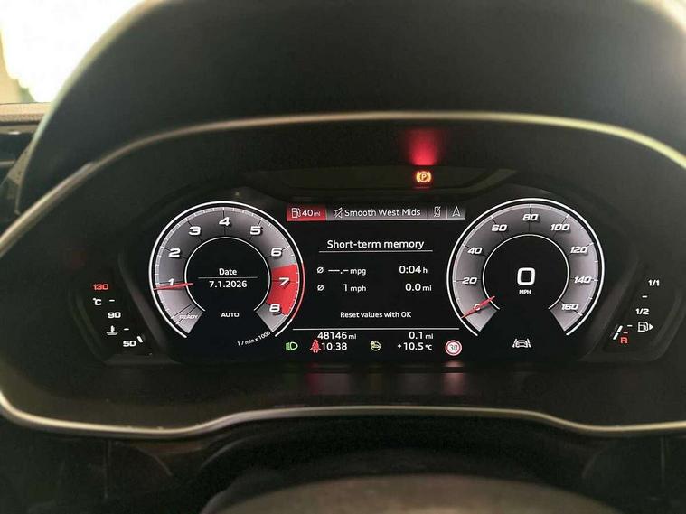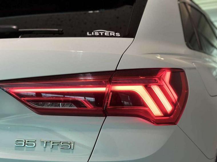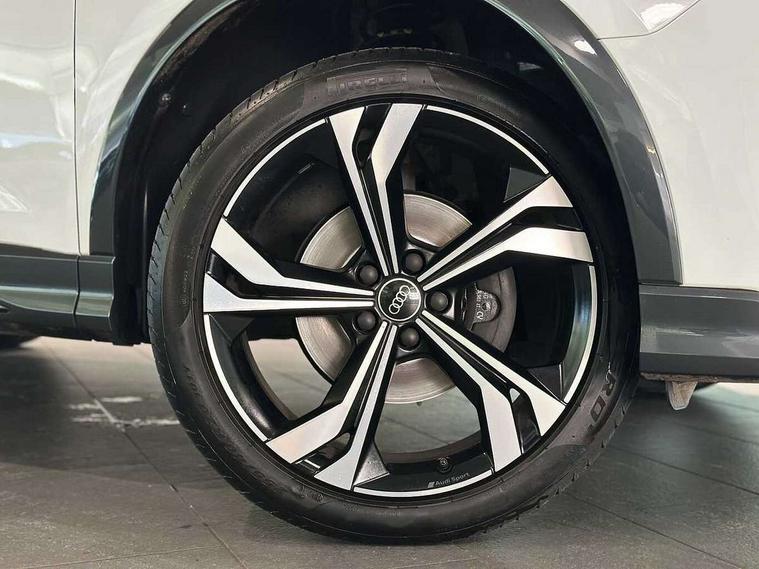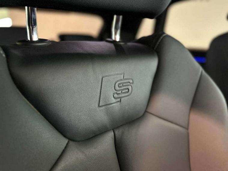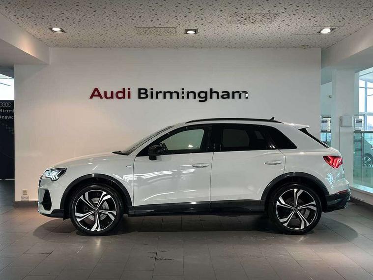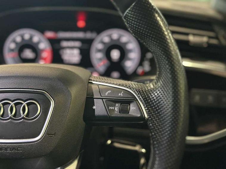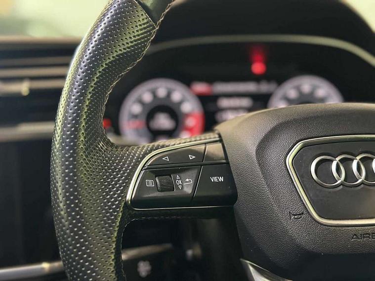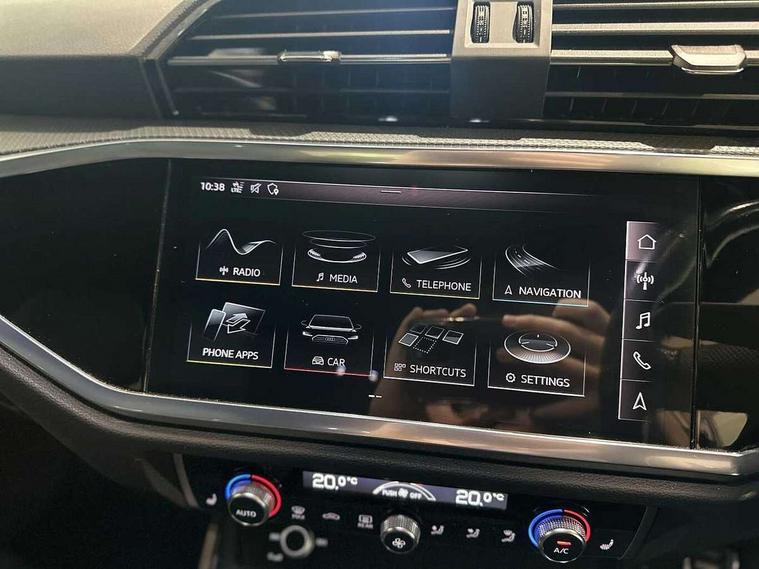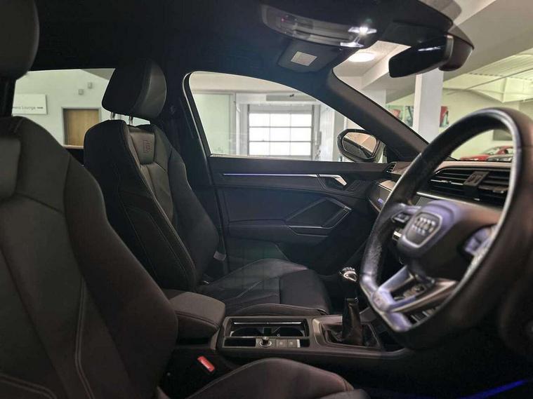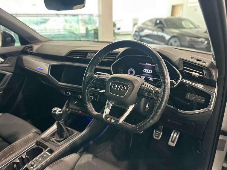 Dark matt brushed aluminium inlay, Leatherette door armrest, MMI touch colour display in glass look, black with surround in aluminium look, Black styling pack - Q3, Multi coloured extended ambient interior lighting pack - Q3, Non smoking pack - Q3, 3x3 point rear seatbelts, 6 airbags - Driver, front passenger, curtain and side windows, Electrically operated child locks on rear doors, Electromechanical parking brake, Electronic stabilisation control including ABS, ASR and EDL, Hill descent control, Hill hold assist, Pre sense basic, Seatbelt monitoring, Tyre pressure warning, Warning triangle and first aid kit, Anti theft alarm, Anti theft wheel bolts, Audi pre-sense front with pedestrain and cyclist recognition, Remote central locking, Sports suspension, 1 x USB type C and 1 USB type A charging points, 6 passive loudspeakers, DAB digital radio module, Acoustic windscreen, Audi Beam uses LEDs to project the Audi Sport logo, Auto dimming frameless rear view mirror, Black roof rails, Electrically folding, adjustable and heated door mirrors with integrated LED side indicators and kerb view function for passenger side, Front and rear electric windows, Front fog lights, Front spoiler blade in matt platinum grey, Grille vertical bars in aluminium silver/Matt, Headlight washers, High gloss black finish B and C pillars, Matrix LED headlights with LED rear lights and dynamic front and rear indicator, Privacy glass dark tinted rear and rear-side windows (from B-pillar backwards), Rain and light sensors, Rear diffuser strip in matt titanium black, S line bumpers in contrasting Manhattan grey, Side skirt insert in matt Platinium grey, Silver chrome grille surround, 12V socket in rear centre console, 3 spoke flat bottomed multi-function leather sport steering wheel, 4 way electric lumbar support for driver and front passenger, 40:20:40 folding with manual adjustment for 60:40 forwards/backwards position and backrest angle, Adjustable rear seat bench/backrest with centre armrest and cupholder, Black cloth headlining, Dual zone electronic climate control, Electrically adjustable front seats, Front and rear black floor mats with contrast stitching in rock grey, Front and rear headrests, Front and rear roof module including reading lights, Front centre armrest, Glove compartment lighting, Heated front seats, Height and reach adjustable steering wheel, Illuminated door sill trims with S logo, ISOFIX child seat mounting for front passenger with airbag deactivation and outer rear seat including top tether attachment point for outer rear seats, Luggage compartment light, Perforated leather gearknob, Stainless steel luggage compartment sill finisher, Stainless steel pedals, Audi connect safety and service (e-call), Audi drive select, Audi lane departure warning, Audi side assist, Audi smartphone interface includes wireless Apple carplay/Android Auto, Audi virtual cockpit plus, Bluetooth interface, Camera based traffic sign recognition, Cruise control + speed limiter, MMI Navigation Plus with high resolution 10.1 inch touchscreen colour display, Power operated tailgate, Progressive steering, Rear parking sensors, Service interval indicator, Start stop system with recuperation, Voice control system with natural language interaction,