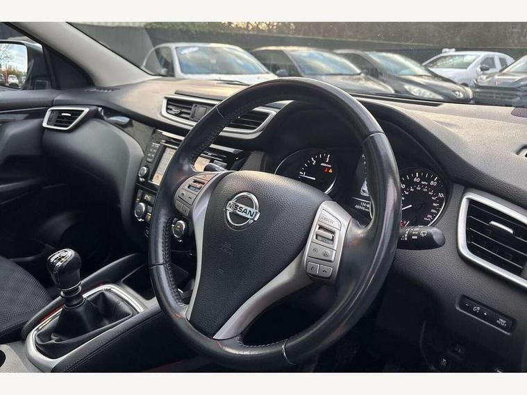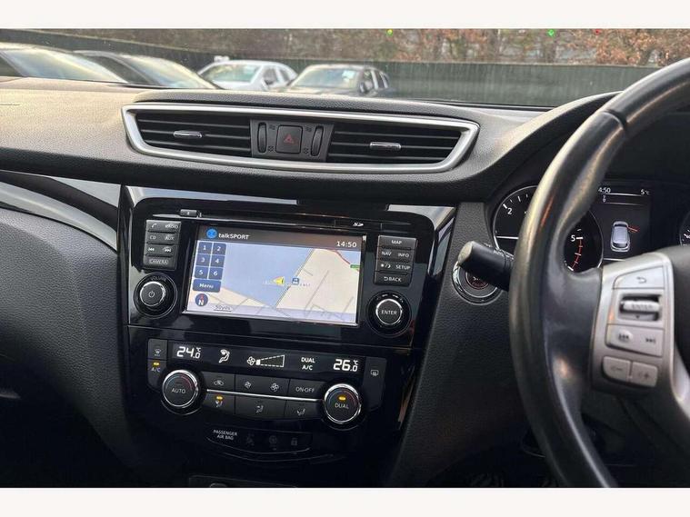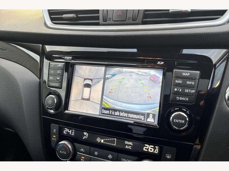 5" TFT driver information centre, 7" touch screen, Around View Monitor, Bluetooth phone integration system, Cruise control, Front and rear parking sensors, Lane departure warning system, Nissan connect sat nav system, Push button starter, Service interval indicator, Speed limiter, Speed sensitive power steering, Traffic sign recognition, Trip computer, Diesel particulate filter, 6 speakers, DAB radio/CD player, Steering wheel mounted audio controls, USB/aux input socket, 2 speed wipers+variable intermittent wipe, Automatic headlamp activation, Black honeycomb front grille, Body colour bumpers, Body colour door mirrors and handles, Chrome window surround, Electric folding and heated door mirrors, Electric front/rear windows, Front fog lights with chrome surrounds, High beam assist, Interior mirror with auto anti dazzle, LED daytime running lights, Rain sensor windscreen wipers, Rear privacy glass, Rear wiper, 12V socket, 60/40 split folding rear seat, Ambient interior lighting, Cloth upholstery, Driver's lumbar support, Driver/passenger front seatback pockets, Dual zone climate control, Footwell ambient lighting, Front armrest, Front cupholders x 2, Front headrests, Front seat belt pre-tensioners with load limiters, Height adjustable driver's seat, Height adjustable passenger seat with lumbar support, Illuminated glovebox, Isofix child seat preparation, Leather gearknob, Leather steering wheel, Luggage area divider, Map reading lamp, Pollen filter, Rake/reach adjustable steering wheel, Rear armrest with 2 cupholders, Rear headrests, ABS, brake assist and EBD, Active Trace Control, Child locks on rear doors, Curtain airbags, Driver/front passenger airbag, Electronic parking brake, ESP + traction control, Forward emergency braking, Height adjustable front seatbelts, Hill start assist, Side airbags, Three 3 point rear seatbelts, Tyre pressure monitoring system, Warning triangle and first aid kit, Alarm, Immobiliser, Intelligent Key, Remote central locking, Tyre puncture repair kit,