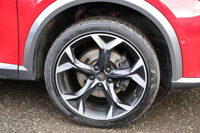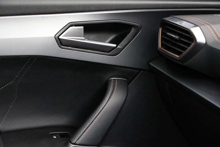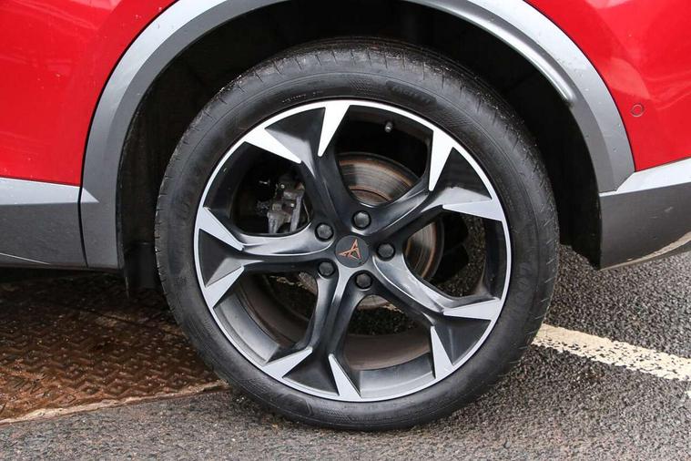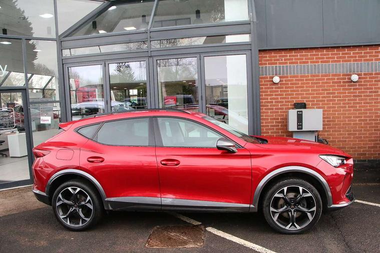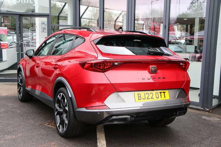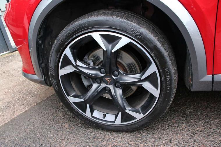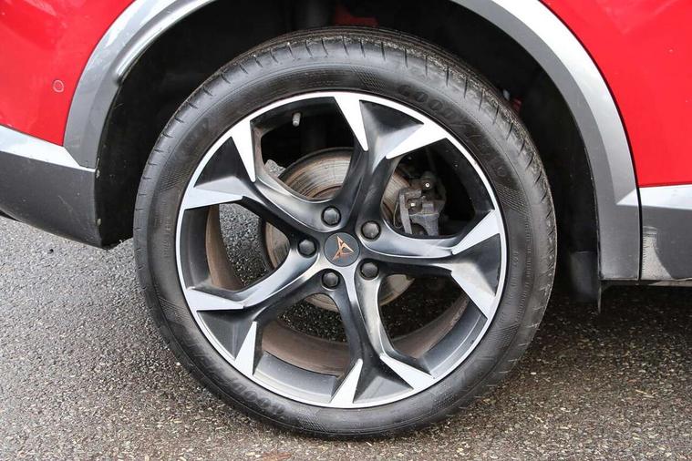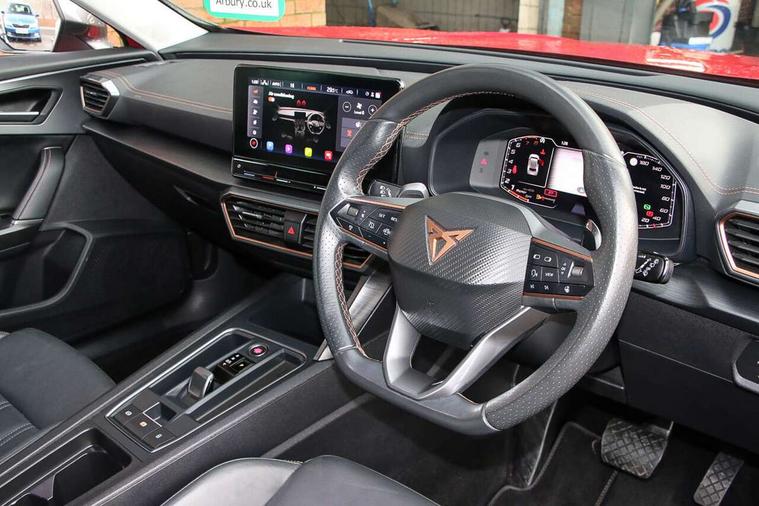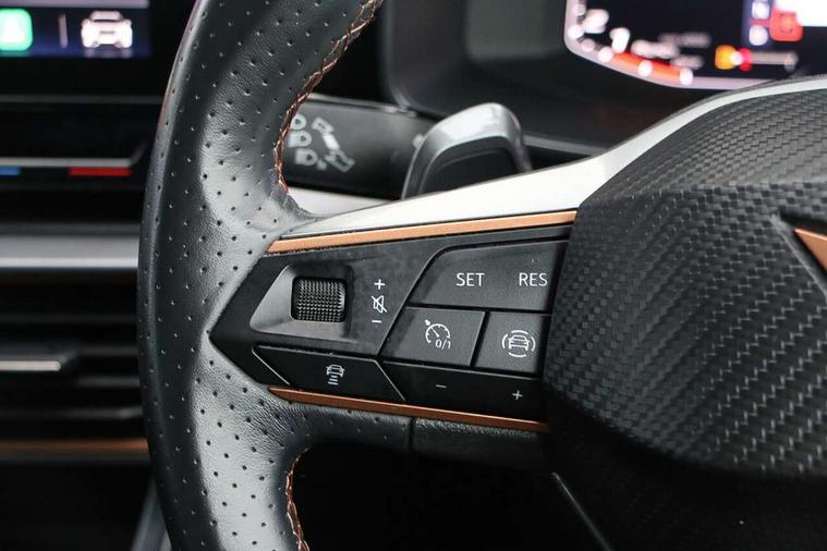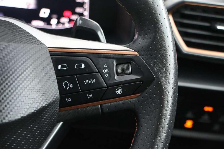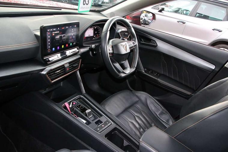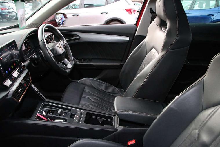 Digital cockpit and configurable dashboard, Driver alert system, Driving profile selection, E-call, Forward collision warning with automatic braking, Lane assist, Park assist (inc front/rear parking sensors), PAS, Predictive adaptive cruise control with speed limiter, Rear view camera, RPM, trip computer, outside temp gauge, instrument light brightness, low fuel warning light, lights on reminder, gearshift indicator, Service interval indicator, Start/stop system with regenerative braking, Wireless apple carplay, Wireless phone charger, Electronic locking differential and dynamic traction support, Standard suspension, 2 front and 2 rear USB type C sockets, Auxiliary input socket, DAB radio, Auto dimming rear view mirror, Body colour door handles, Body coloured bumpers, Dark grey wing mirror, Daytime running light with automatic headlight control and coming home feature, Dynamic headlight range control, Electric front/rear windows, Electrically adjustable heated and folding door mirrors with memory function, Front fog lamps with cornering function, Gloss black roof rails and window surrounds, LED Headlights, LED Taillights with dynamic indicator, Rain sensing wipers, Rear diffuser with black simulated exhaust pipes, Rear side wing doors, Rear wash/wipe, Third brake light, Tinted rear windows, Welcome lights, 12v power supply in centre console, 12V socket, 12v socket in loadspace, 2 front and 2 rear reading lights, 230V socket, 3 seat bench in 2nd row, 60/40 split rear bench seat with armrest and mechanical seat release, Dust/pollen filter, Front and rear head restraints, Front centre armrest, Height/reach adjust steering wheel, Illuminated interior front door sills, Illuminated sunvisor with mirror, Isofix, Leather multi function heated steering wheel with gear shift paddles, Luggage tie-down hooks, Single front passenger seat, Three zone climate control with control panel in rear, Variable luggage/load compartment floor, Wraparound lighting, Genuine Nappa leather Pack - Cupra, Navigation system pack with 10" navigation system - Formentor, 3 point seatbelts on all rear seats, ABS, Brake control system - ESC and brake booster, Child proof door locks, Driver and front passenger airbags with front passenger airbag de-activation, Electronic parking brake, Front and rear disc brakes, Front side curtain airbags, Hill hold control, Seat belt reminder for front and rear seats, Tyre pressure monitoring system, Anti theft alarm system, Keyless entry and start system (KESSY), Locking wheel bolts, Copper and aluminium interior detailing, 19" 'Exclusive' machined sport matte black and silver alloy wheels,