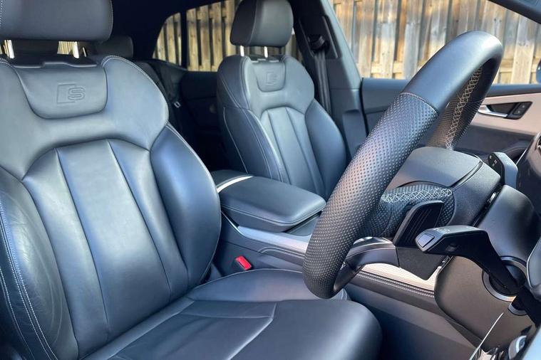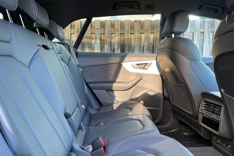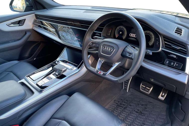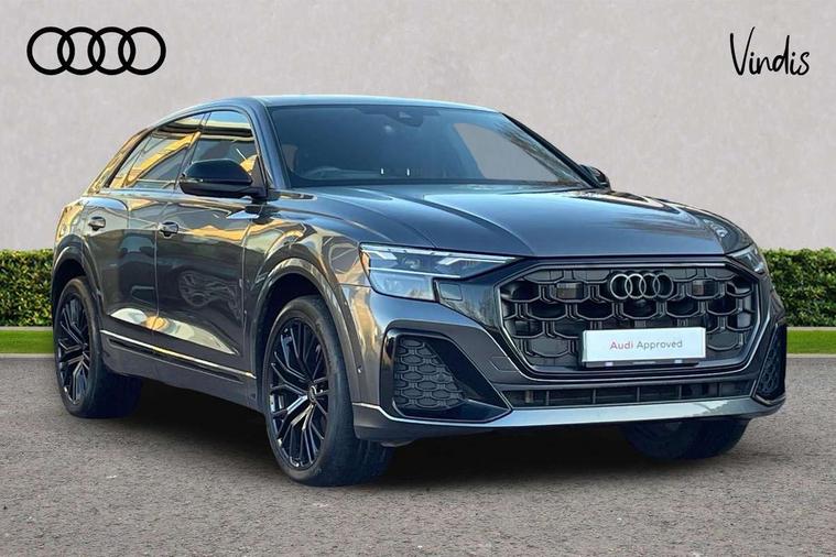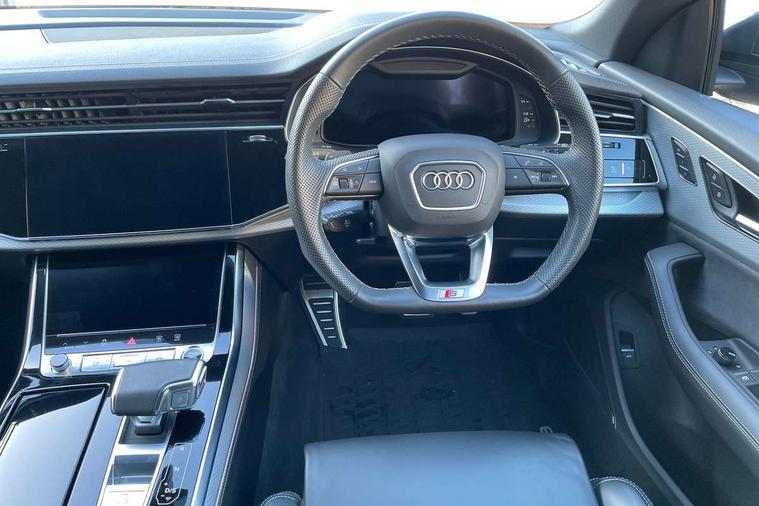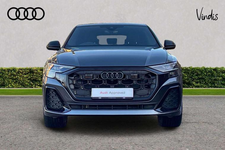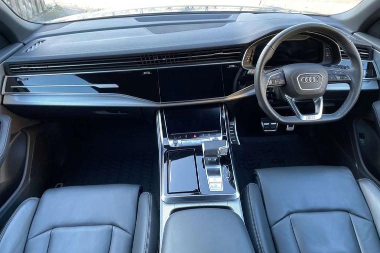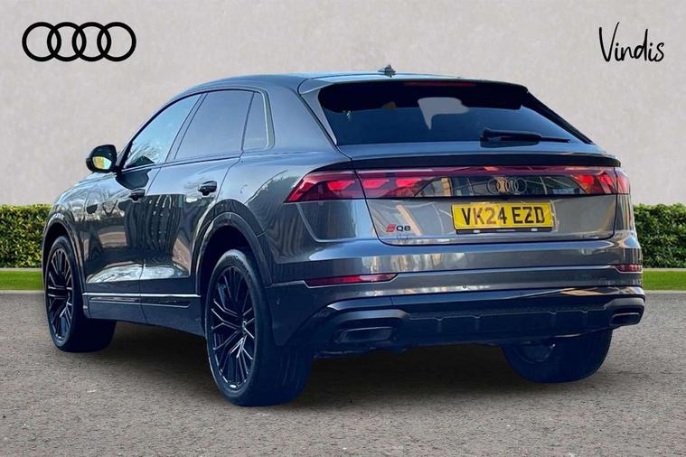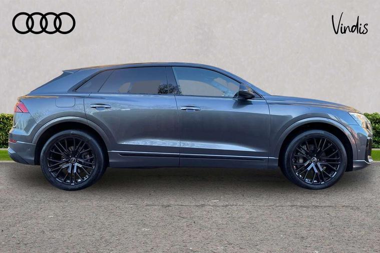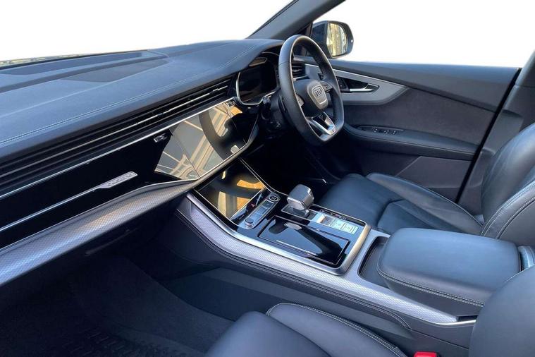 10.1" and 8.6" Dual colour touchscreens, 2 USB C ports with charging functionality in the rear, 360 degree camera with top view, Audi application store, Audi connect safety and service (e-call), Audi connect with Amazon Alexa Integration, Audi drive select, Audi phone box light with wireless charging, Audi virtual cockpit plus, Automatic start/stop system, Bluetooth, Electro-mechanical PAS, Head up Display, Low washer fluid indicator, MMI navigation plus with MMI touch, Natural voice recognition, On board computer, Operating buttons in black, glass look with haptic feedback, Power operated tailgate, Remote park assist plus, Service interval indicator, Smartphone interface includes wireless Apple carplay/Android Auto, 48V Mild hybrid technology, Adaptive sport air suspension, Diesel particulate filter, Quattro all wheel drive with self locking centre differential, Audi music interface with 2 USB ports with charge and data functions, Aux-in socket, Bang + Olufsen sound system, DAB Digital radio, 3rd brake light, Anthracite black door mirrors, Audi beam, Auto dimming frameless rear view mirror, Black exhaust tailpipes, Black single frame mask, Coming/leaving home lighting function, Digital OLED rear combination lamps, Electric front+rear windows, Electrically folding auto dimming/adjustable/heated door mirrors with memory function, LED side indicators and kerb view function for passenger side, Headlight washers, Heat insulating glass in windshield, LED rear light plus, LED signature daytime running lights, Matrix LED headlights with dynamic front and rear indicators, Platinum grey front spoiler lip and diffuser insert with honeycomb grille in black, Privacy glass - dark tinted rear and rear side windows from B-pillar backwards, Rain and light sensors, Rear side wing doors, Rear wiper, Singleframe grille surround in matte platinum grey, 3 bench rear seats in 2nd row, 3 spoke flat bottomed high multi-function leather sport steering wheel with gearshift paddles, 4 zone deluxe automatic climate control, 4-way lumbar support for front seats, 40:20:40 split folding rear bench seat, Black cloth headlining, Comfort front centre armrest, Driver seat memory function, Electrically adjustable front seats, Front head restraints, Front/rear floor mats, Heated front and outer rear seats, ISOFIX child seat mounting for front passenger seat and 2 outer rear seats with top tether child seat mounting for all 3 rear seats, LED interior ambient lighting, Luggage compartment sill protection in stainless steel, Rear centre armrest with 2 cupholders, Rear headrests, Seat cushion displaceable by 100mm in the ratio 60:40, Single front passenger seat, Stainless steel pedals, Sunvisors with illuminated vanity mirrors, Upper dashboard with contrast stitching and lower dashboard in leatherette, Black styling pack plus - Q8, City assist pack - Q8, Multi coloured extended LED Interior lighting pack - Q8, 3 point seatbelts on all seats, Audi pre sense front, Driver and front passenger, front side and curtain airbags, Electromechanical parking brake, Electronic Stability Control (ESC) including ABS, ASR and EDL, Front passenger airbag deactivation, Hill descent control, Hill hold assist, Predictive pedestrian protection, Seatbelt monitoring, Traction control, Tyre pressure loss indicator, Warning triangle and first aid kit, Advanced key, Anti theft alarm with tow away protection, Anti-theft wheel bolts and wheel loosening detection, Electronically operated child lock, Immobiliser, Decorative inserts in matte brushed aluminum with linear structure in Silver, 22" x 10.0J 10 spoke Y style black metallic audi sport alloy wheels, Tool kit, Tyre repair kit,