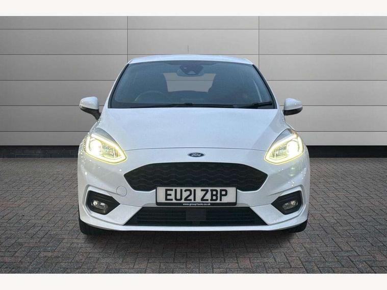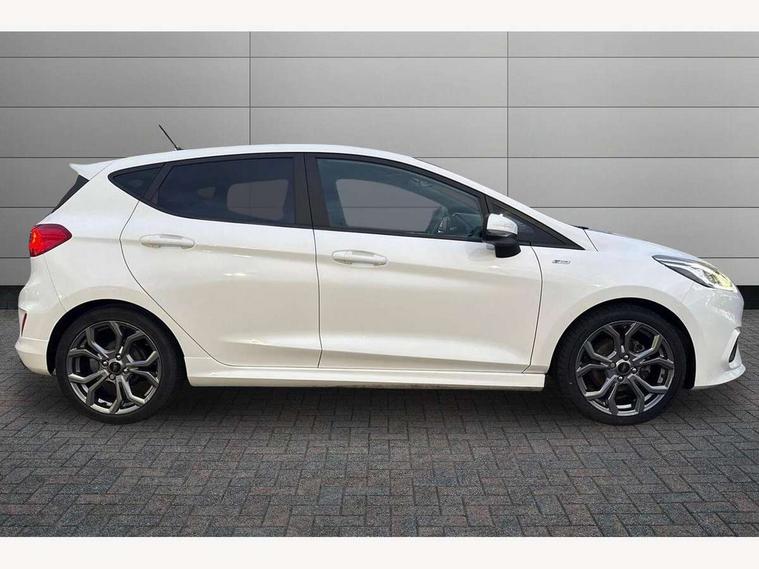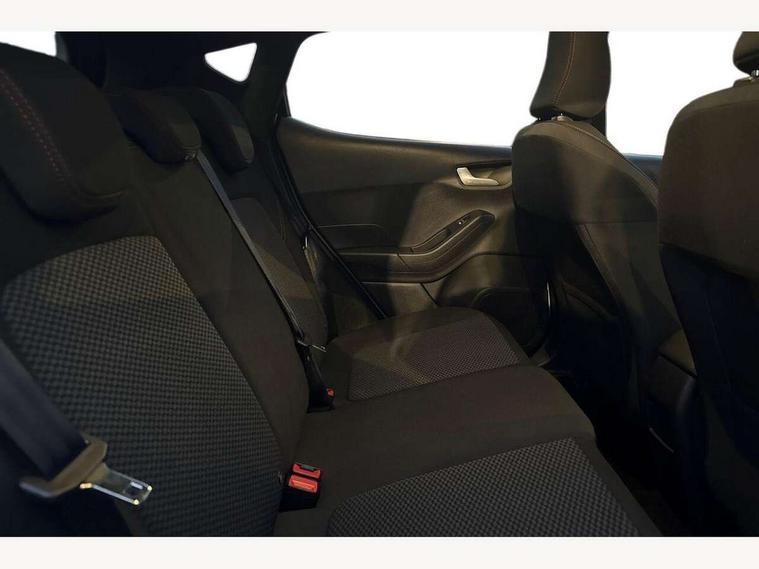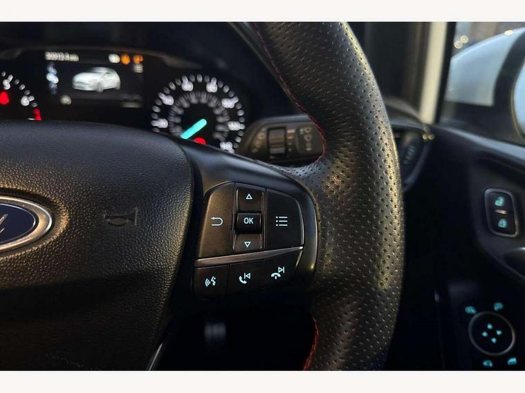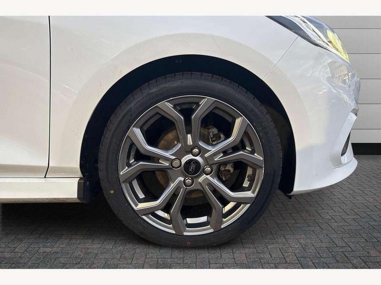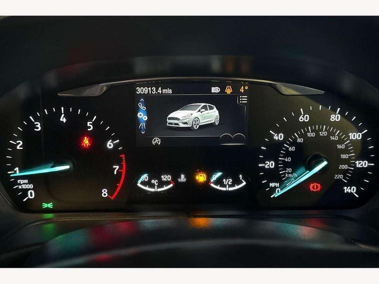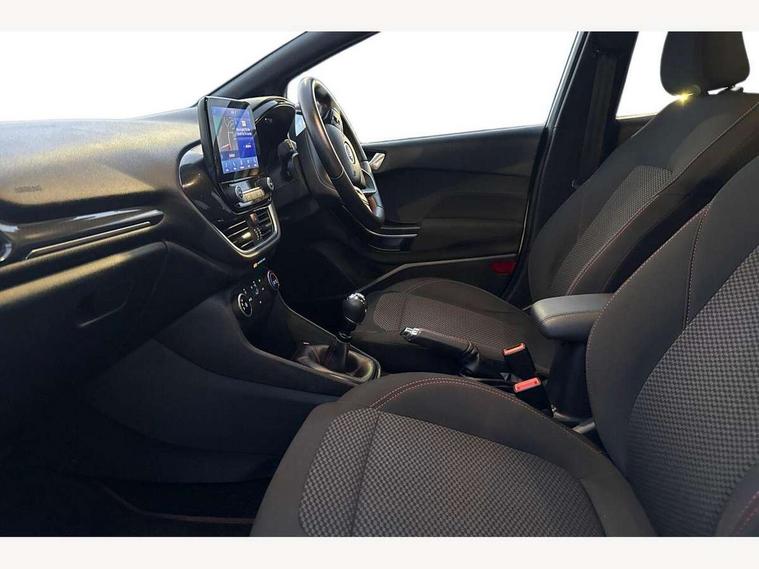 Bluetooth system, Electric power steering, Ford easy fuel, Ford SYNC 3 Navigation system incl 8" touchscreen, 7 speakers, FordPass connect, Apple carplay, android auto, voice control and emergency assistance, Rear parking distance sensors, Selectable drive modes (Normal, Sport, Track), Trip computer, Sports suspension, 2 USB ports, Auxiliary input socket, DAB Digital radio, Steering wheel mounted controls, Body colour bumpers, Body colour door handles, Body colour large rear spoiler, Body coloured electrically operated and heated door mirrors with side indicators, Cornering front fog lights, Electric front windows/one touch facility, Electric rear windows, LED Night signature to rear lights, Quickclear heated windscreen, Rain sensing wipers and auto dimming rear view mirror, Rear privacy glass, Rear wiper, Unique ST-Line upper grille & full bodystyling kit with ST-Line wing badges, 3 spoke flat bottomed leather steering wheel, 60/40 split folding rear seat, Adjustable head restraints, Black headlining, Boot carpet, Centre console with opening armrest, 2x cupholders, 12v and USB, Chrome inner door handles, Cloth upholstery, Footwell illumination, Front floor mats in velour, Front map reading lights, Front seat and rear pockets, Illuminated glovebox, Leather gaiter, Load area light, Manual 2 way passenger seat adjust, Manual 4-way driver seat adjust, Manual air conditioning, Overhead console with sunglasses holder, Pollen filter, Rake/reach adjustable steering wheel, Sensico wrapped steering wheel, Sports front seats, NCAP Pack - Fiesta, 3 point seatbelts on all rear seats, ABS+EBA, Curtain airbags, Driver and passenger airbags, Drivers knee airbag, Electronic stability control with hill start assist, Front passenger airbag deactivation, Front side airbags, Seatbelt warning, Two tone horn, Tyre pressure monitoring system, Keyless start with 'Ford Power' starter button, MyKey system, Remote central locking & engine immobiliser, Thatcham Cat.1 alarm, 17" 5 spoke alloy wheels with rock metallic finish,