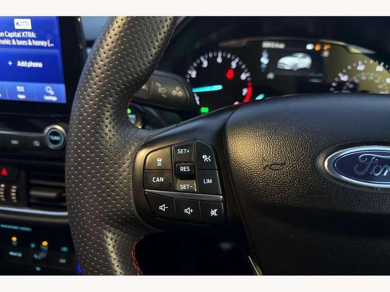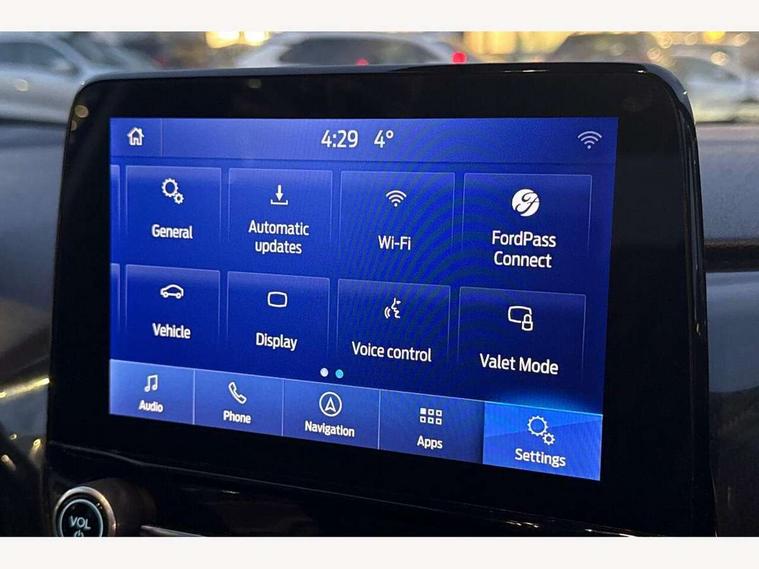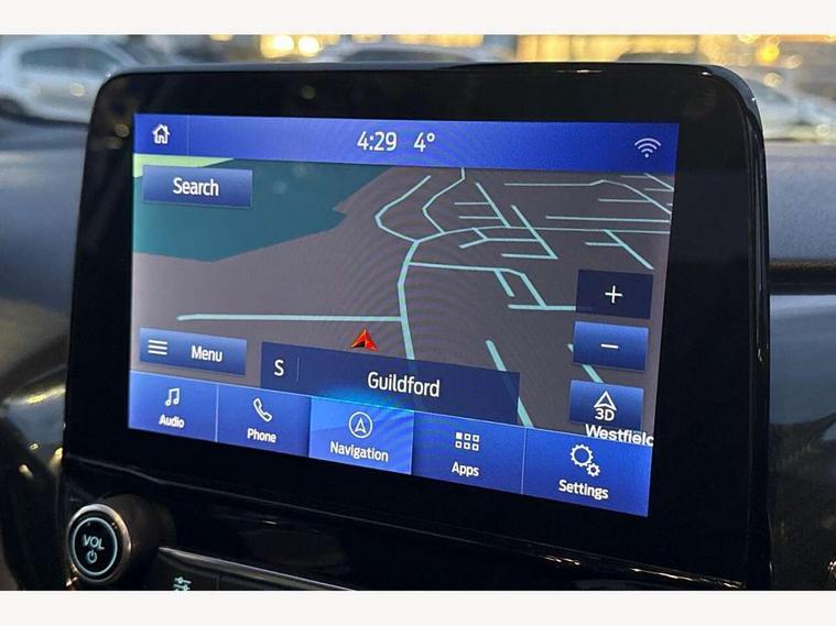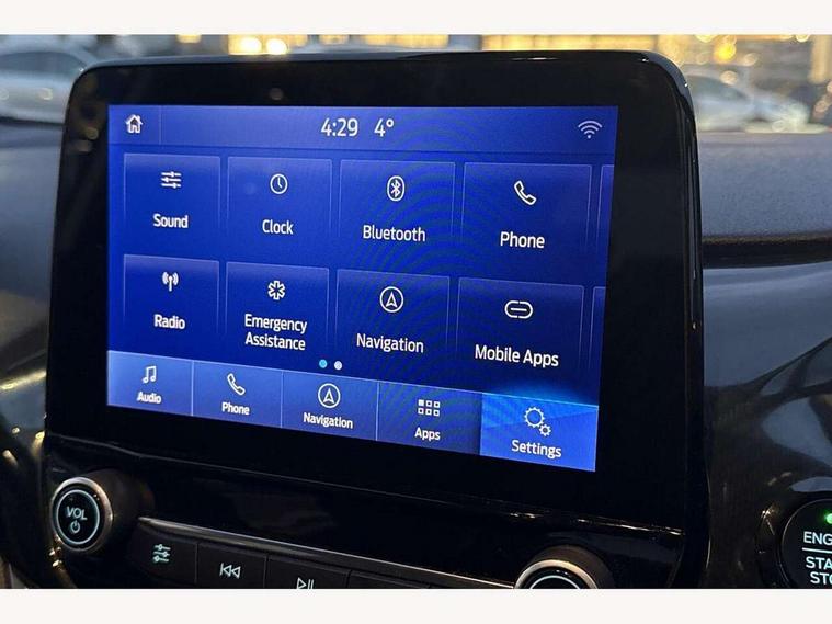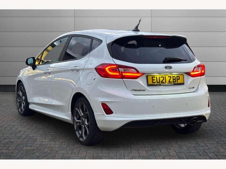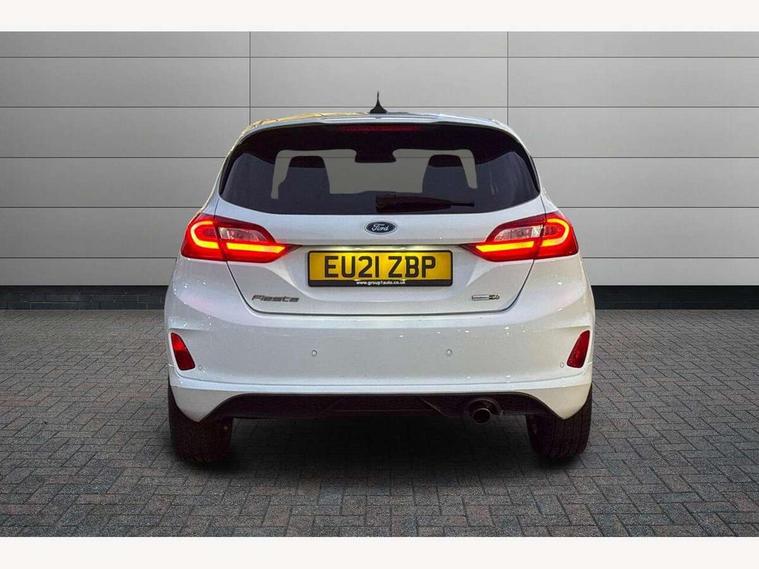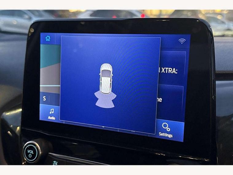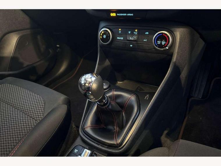Bluetooth system, Electric power steering, Ford easy fuel, Ford SYNC 3 Navigation system incl 8" touchscreen, 7 speakers, FordPass connect, Apple carplay, android auto, voice control and emergency assistance, Rear parking distance sensors, Selectable drive modes (Normal, Sport, Track), Trip computer, Sports suspension, 2 USB ports, Auxiliary input socket, DAB Digital radio, Steering wheel mounted controls, Body colour bumpers, Body colour door handles, Body colour large rear spoiler, Body coloured electrically operated and heated door mirrors with side indicators, Cornering front fog lights, Electric front windows/one touch facility, Electric rear windows, LED Night signature to rear lights, Quickclear heated windscreen, Rain sensing wipers and auto dimming rear view mirror, Rear privacy glass, Rear wiper, Unique ST-Line upper grille & full bodystyling kit with ST-Line wing badges, 3 spoke flat bottomed leather steering wheel, 60/40 split folding rear seat, Adjustable head restraints, Black headlining, Boot carpet, Centre console with opening armrest, 2x cupholders, 12v and USB, Chrome inner door handles, Cloth upholstery, Footwell illumination, Front floor mats in velour, Front map reading lights, Front seat and rear pockets, Illuminated glovebox, Leather gaiter, Load area light, Manual 2 way passenger seat adjust, Manual 4-way driver seat adjust, Manual air conditioning, Overhead console with sunglasses holder, Pollen filter, Rake/reach adjustable steering wheel, Sensico wrapped steering wheel, Sports front seats, NCAP Pack - Fiesta, 3 point seatbelts on all rear seats, ABS+EBA, Curtain airbags, Driver and passenger airbags, Drivers knee airbag, Electronic stability control with hill start assist, Front passenger airbag deactivation, Front side airbags, Seatbelt warning, Two tone horn, Tyre pressure monitoring system, Keyless start with 'Ford Power' starter button, MyKey system, Remote central locking & engine immobiliser, Thatcham Cat.1 alarm, 17" 5 spoke alloy wheels with rock metallic finish,