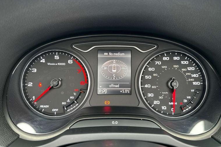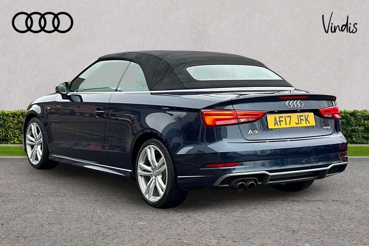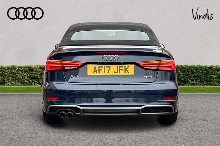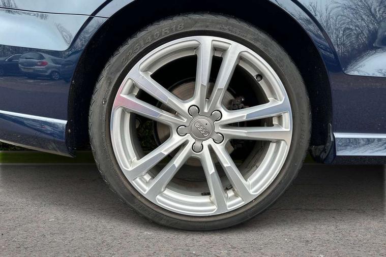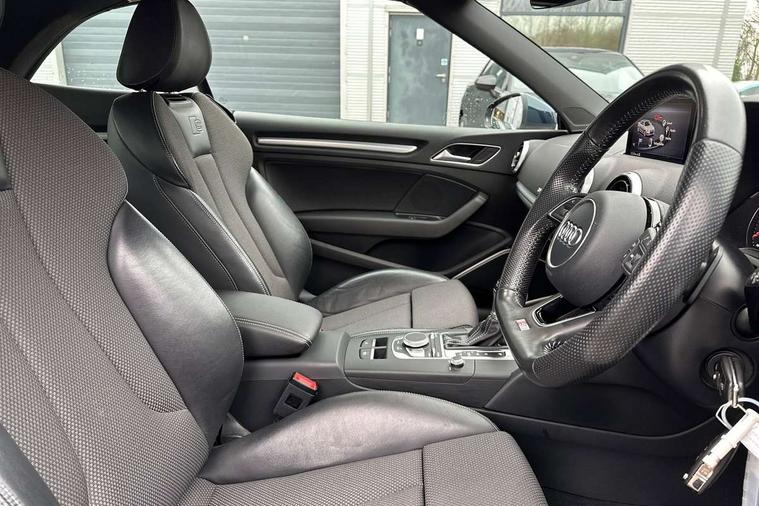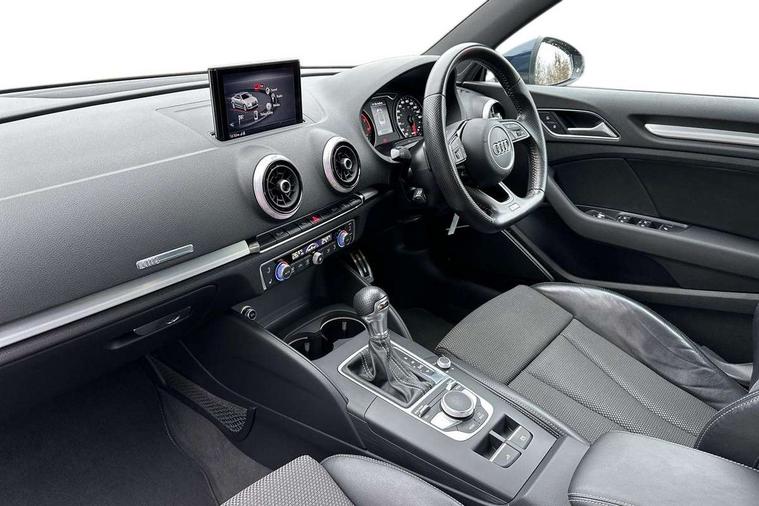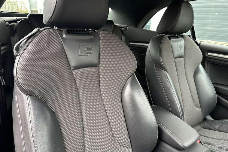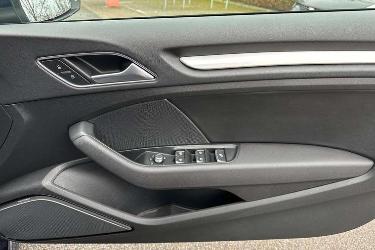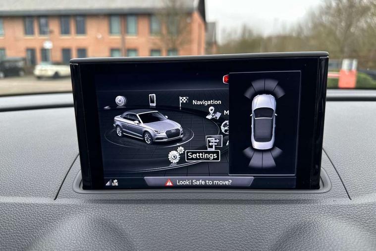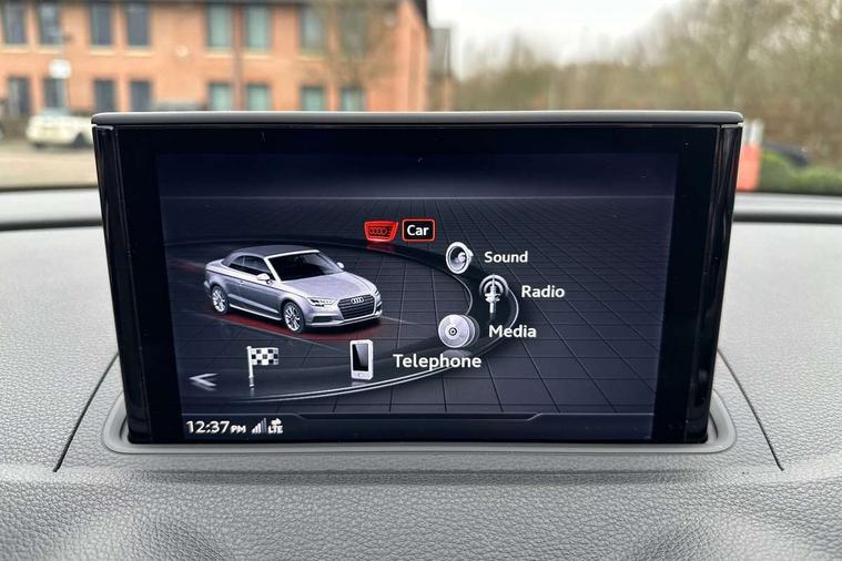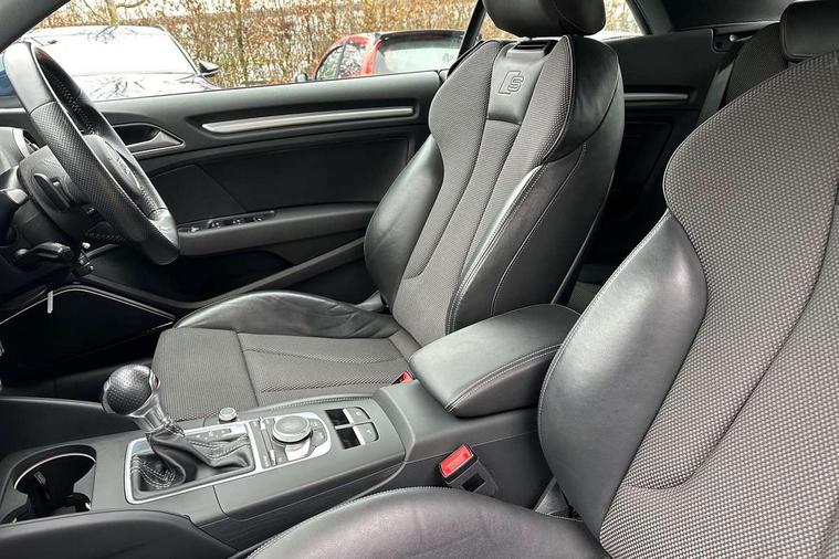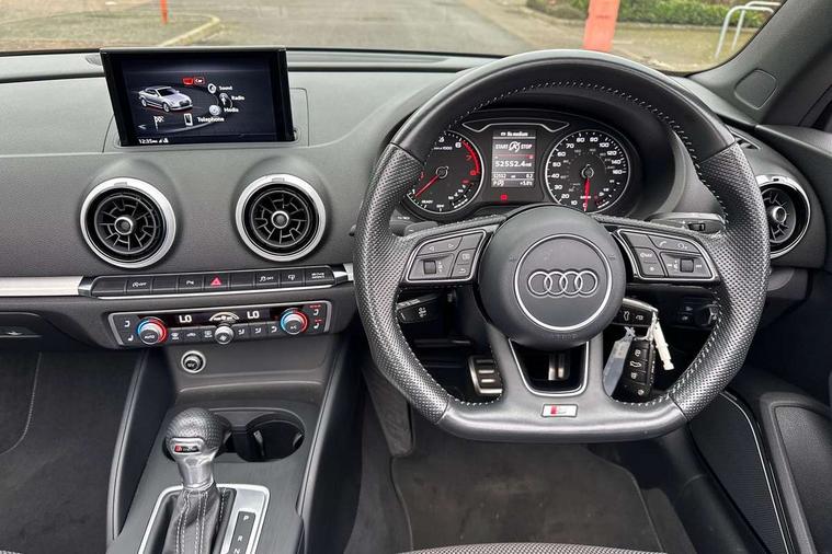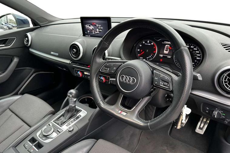 Audi connect, Audi drive select, Audi smartphone interface, Bluetooth interface, Colour driver's information system display, Service interval indicator, 2 USB ports, Audi music interface, DAB Digital radio, Aluminium side window trim, Automatic lights and wipers, Body colour bumpers, Body colour door mirrors with integral indicators, Chrome exhaust tailpipes, Electric operated/heated door mirrors, Front and rear electric windows, Fully automatic acoustic hood, Heated front windscreen, Heated rear window, Heated windscreen washer jets, LED daytime running lights, S Line body styling, 2 height adjustable rear headrests, 3 spoke flat bottom multi-function leather steering wheel including paddle shift, 4 lashing points to secure luggage, 50/50 split folding rear seat, Adjustable front armrest, Driver/passenger sunvisors, Dual zone electronic climate control, Front/rear floor mats, Height adjustable front seats, Height/reach adjustable steering column, Illuminated door sills, Illuminated glovebox, ISOFIX child seat preparation+airbag deactivation, Jack and tool kit, Perforated leather gearknob, Stainless steel pedals, Storage compartment in centre console, Storage compartments in doors, LED interior light pack - A3/RS3, Light and rain sensor pack - A3 Cabriolet, Storage pack - A3 Cabriolet/Saloon, 3 point seatbelts on all seats, ABS/EBD, Active bonnet, Active front headrests, ASR, Automatic roll over protection, Driver and passenger side airbags, Driver/Front Passenger airbags, Drivers knee airbag, EDL, Electromechanical parking brake, ESC - Electronic Stability Control + traction control, Front passenger airbag deactivation, Seatbelt warning, Tyre pressure monitor, Warning triangle and first aid kit, Anti theft alarm, Anti-theft wheel bolts, Immobiliser, Remote control central locking, Aluminium air vent surrounds, Aluminium trim elements, Space saver spare wheel,