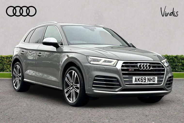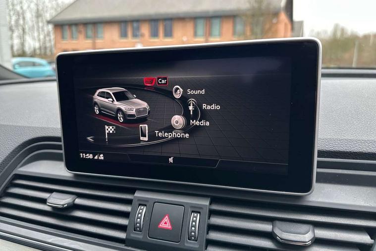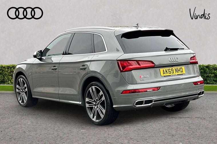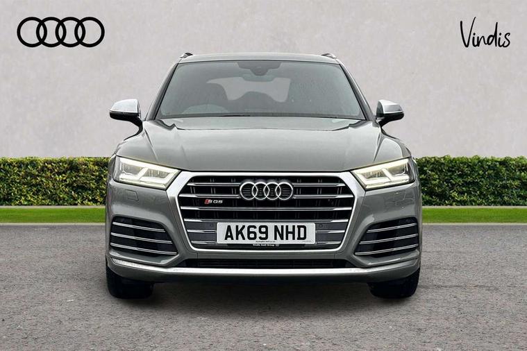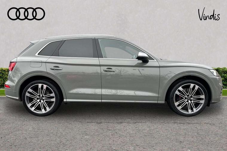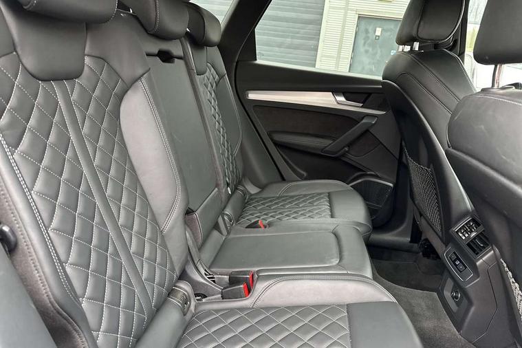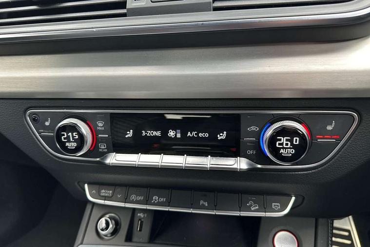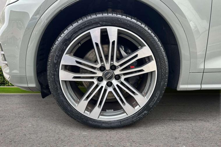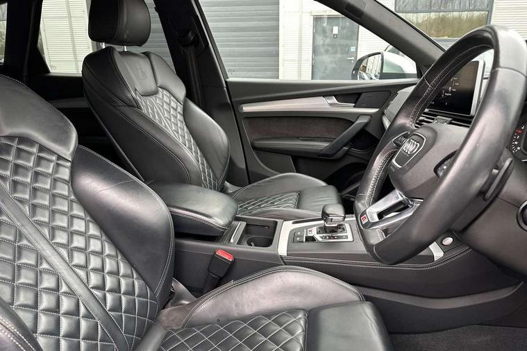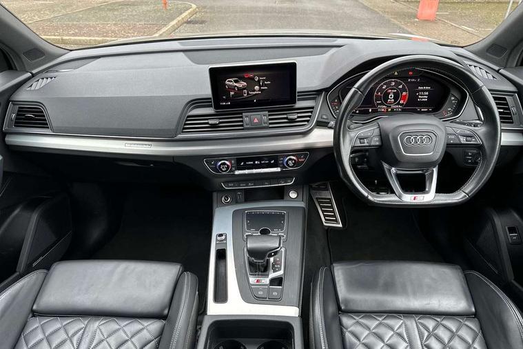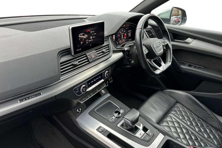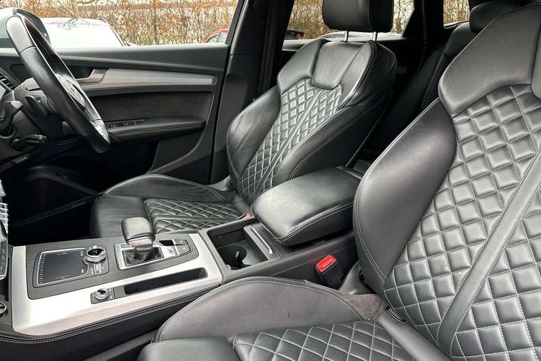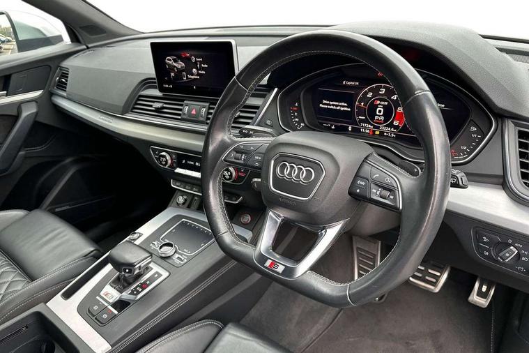 Audi connect safety and service (e-call), Audi drive select, Audi phone box with wireless charging, Audi smartphone interface, Audi virtual cockpit - 12.3" high resolution LCD digital instrument cluster display, Automatic start-stop system with coasting functionality and efficiency programme, Electro - mechanical power assisted steering, MMI navigation plus with 8.3" colour MMI screen and MMI touch, Mobile telephone preparation - bluetooth interface, Power tailgate, Service interval indicator, Voice control system, 70 litre fuel tank and 24 litre AdBlue tank, Adaptive air suspension, Diesel particulate filter, Quattro on demand, 2x SD card slot, Audi sound system, CD player, DAB Digital radio, MMI radio plus with 7" colour MMI screen and MMI controller, Acoustic windscreen, Aluminium roof rails, Audi Beam uses LEDs to project the Audi Sport logo, Auto dimming rear view mirror, Automatic headlight levelling, Body colour bumpers, Body colour S Line side skirts, Body colour S specific rear diffuser, Body colour underbody protection, Chrome exhaust tailpipe, Electric adjustable/heated/folding door mirrors, Front and rear electric windows, High beam assistant, LED headlights with LED rear lights + dynamic rear indicators, Light and rain sensor for auto activation of lights and windscreen wipers, Loading sill protector in stainless steel, Privacy glass with front acoustic glazing, Rear wiper, S air inlet in titanium black, S front and rear bumpers, S Line rear spoiler, Twilight grey matt radiator grille with matt aluminium horizontal chrome struts, 2 x USB charging port with aux input socket, 3 rear headrests, 3 spoke flat bottom high multi-function leather steering wheel, 4 way electric lumbar support for driver and front passenger, 40:20:40 split folding rear seat with rear centre armrest, Black cloth headlining, Contrast stitching on seats, steering wheel and gear lever gaiter, Deluxe 3 zone electronic climate control, Fine Nappa leather upholstery with diamond stitching, Front centre armrest, Front sport seats with S embossed logo, Front/rear floor mats, Fully electrically adjustable driver's seat, Fully electrically adjustable front passenger seat, Heated front seats, Height adjustable front head restraints, Height/reach adjustable steering column, Illuminated door sill trims with S logo, ISOFIX child seat mounting and top tether, Luggage compartment carpet, Massage function for front seats, Perforated leather gearknob, Rear seat bench plus, Removable luggage compartment floor, Stainless steel pedals, Sunvisors with vanity mirrors, Tool kit, Trunk roller cover, Extended LED Interior Lighting Pack - Q5, High gloss pack - Q5, Non Smokers pack, 3 point seatbelts on all seats, 6 airbags - Driver, front passenger, curtain and side airbags, Electromechanical parking brake, Electronic stabilisation control including ABS, ASR and EDL, Front passenger airbag deactivation, Hill descent control, Hill hold assist, Multi collision brake assist, Pop-up bonnet for pedestrian protection, Pre sense city, Seat belt force limiter, Seatbelt monitoring, Tyre pressure warning, Warning triangle and first aid kit, Anti theft alarm, Anti-theft wheel bolts, Keyless Go access/ignition system, Remote central locking,