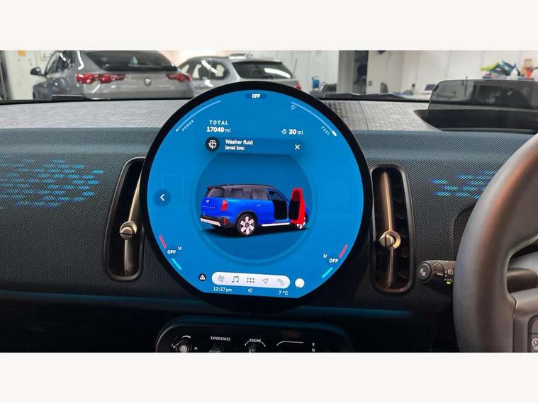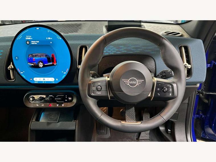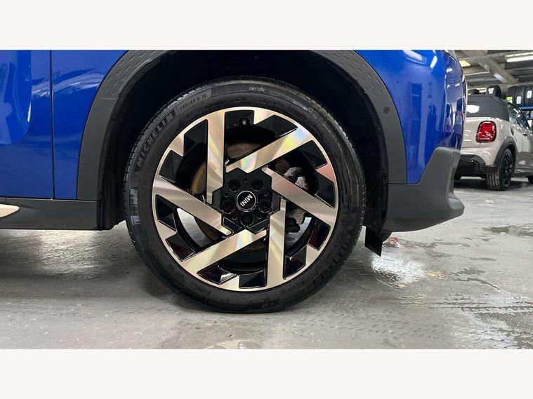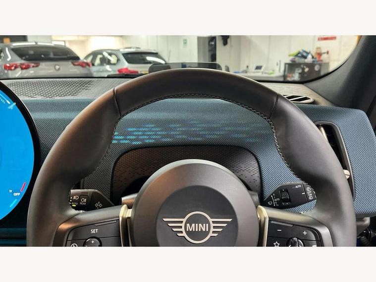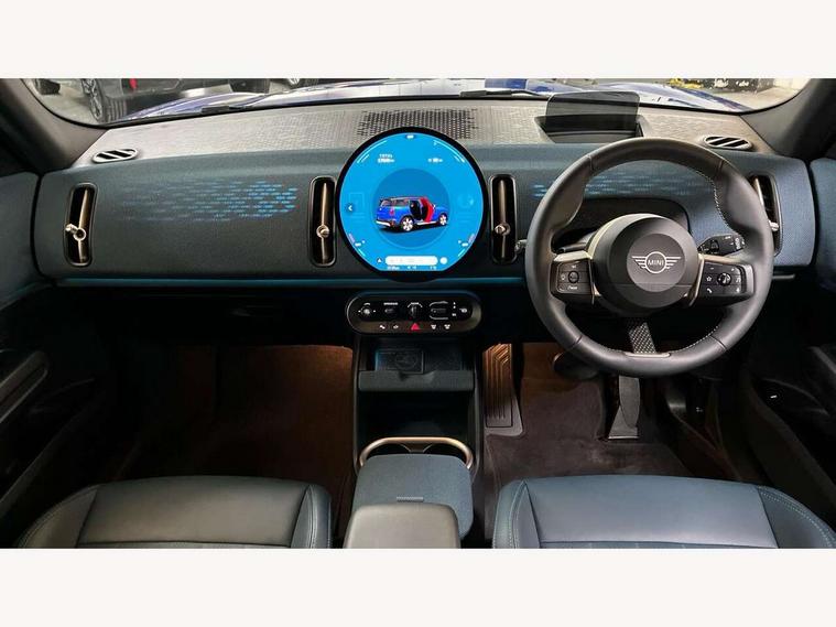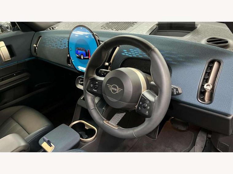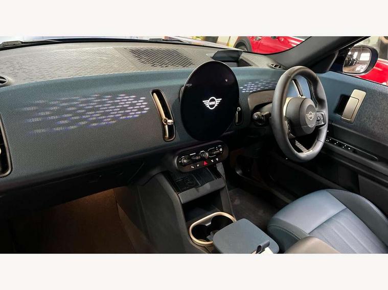 Bluetooth connection, Circular OLED Screen, Compatible mobile phone bluetooth with audio streaming, Cruise Control (DCC), Digital dashboard display, Driving Assistant Plus Preparation, E-call, Electro-mechanical speed dependant steering assistance, MINI Experience Modes, MINI Head up display, Mini navigation system, MINI TeleServices, Parking assistant in camera and ultrasound based assistance system, rear view camera, parking aid and distance control, Auto transmission with Paddles, Larger capacity fuel tank, 6 speakers, DAB Digital radio, Personal eSim, Auto tailgate, Electric adjustable heated door mirrors, Front and rear electric windows, Heated rear window, High beam assistant, Interior rear-view mirror with automatic anti-dazzle function, LED daytime running lights, LED headlights with extended contents including Adaptable light signatures, LED rear lights, LED third brake light, Logos in Vibrant Silver, Rain sensor with auto headlights, Rear side wing doors, Rear window wiper, Roof rails, Vibrant silver grille surround, 3 Seat sliding rear bench in 2nd row, 60/40 split rear bench seat, Anthracite headliner, Auto air conditioning, Driver and front passenger seat heating, Floor mats, Front armrest, Front headrests, Front sport seats, Heated steering wheel, Height and length steering column adjustment, Lidded storage box in Petrol knit, Luggage compartment separating net, Rear headrests, Seat adjustment for rear seats, Single front passenger seat, Sport Vescin Steering Wheel, Sunvisors with vanity mirrors, Vescin synthetic leather upholstery, Vibrant Silver sill inlay, Wireless charging tray, Interior and exterior mirror package - Mini Countryman, 3x3 point rear seat belts, 6 Airbags - front, side, head and seat belt tensioners, ABS, DSC - Dynamic Stability Control, Electronic handbrake, Electronic Stability Programme (ESP), Front ISOFIX (iSize), Hill descent control, Hill hold assist, Hill start assist, Manual rear child locks, Traction control, Tyre pressure monitoring system, Warning triangle, Alarm system with tilt sensor, monitoring doors, bonnet interior and tailgate, Auto drive away locking, Comfort access system, Deadlocking function, Electronic vehicle immobiliser, Locking wheel bolts, Remote control locking, Start/stop toggle with keyless go, Petrol/Brown dashboard knit, MINI Mobility Kit,