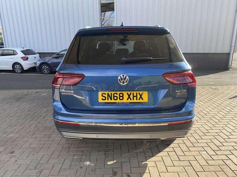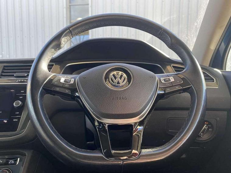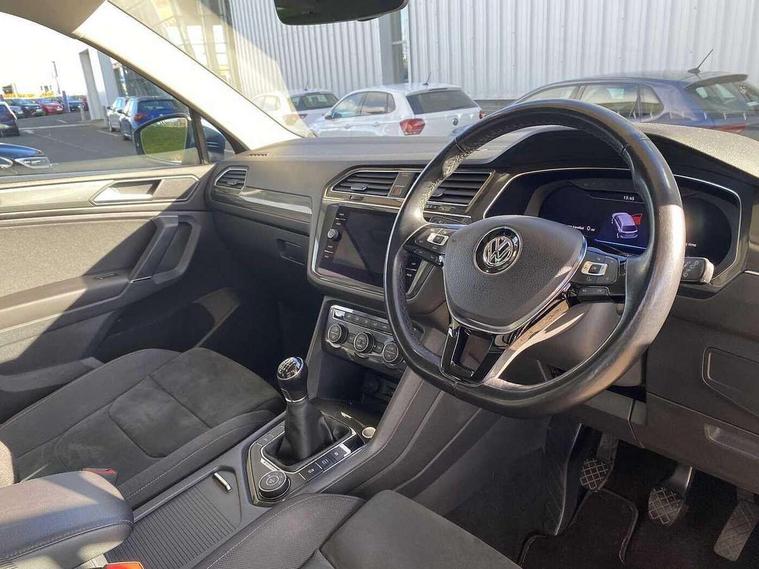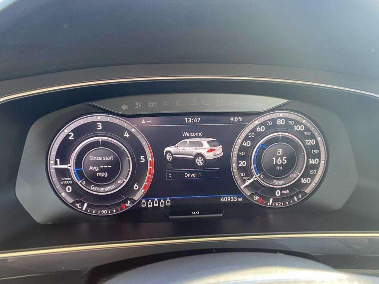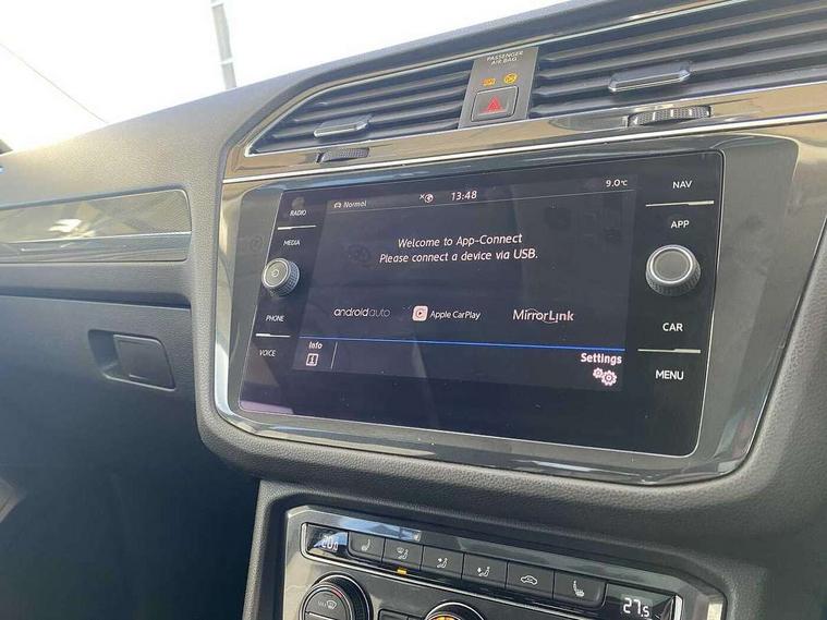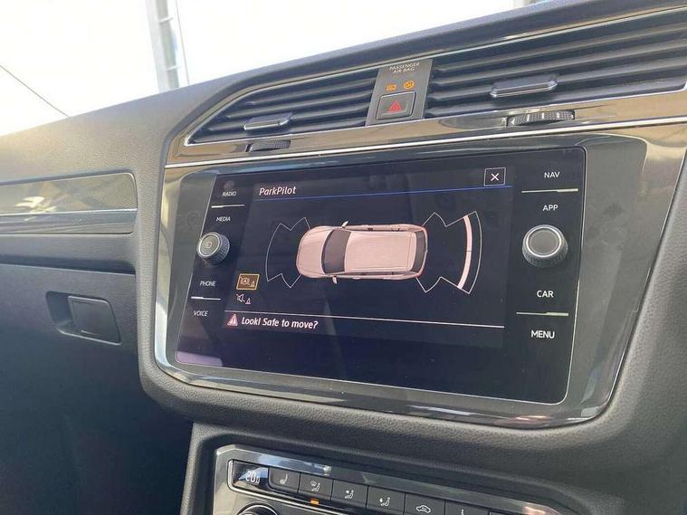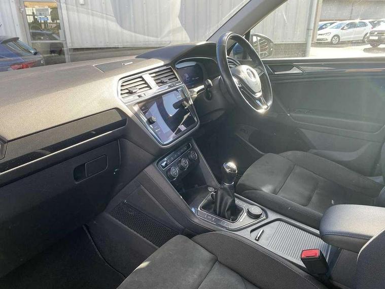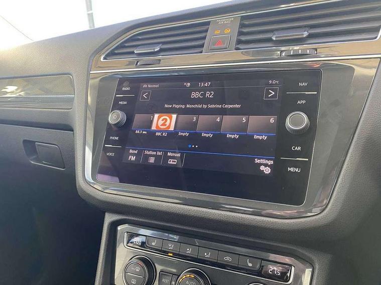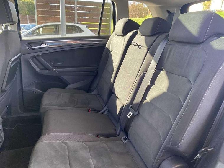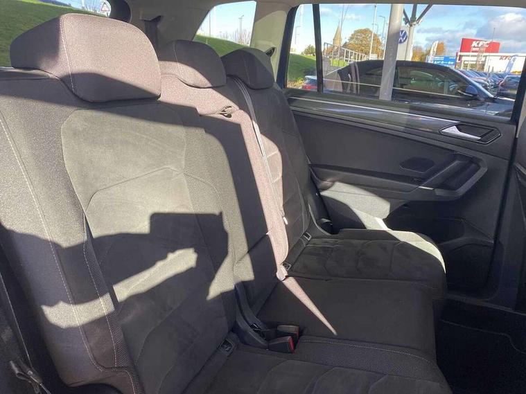 Active information display, Adaptive cruise control, App-Connect, Bluetooth phone integration system, Drive mode selector, Driver profile selection, Fatigue detection system, Front and rear parking sensors, Fully electric tailgate + keyless entry and start, Instrument cluster, Lane assist, Low washer fluid warning light, Outside temperature display, Service interval indicator, Speed limiter, Warning lights, Diesel particulate filter, XDS electronic differential lock, 2x USB sockets in front, Aux-in socket, DAB Digital radio, SD card slot, 3D effect LED rear lights, Auto dimming interior mirror, Automatic activation of hazard warning lights, Black door protector with chrome inserts, Body colour door handles, Body colour door mirrors, Body coloured bumpers, Chrome side body trim, Chrome side window surrounds, Chrome trimmed radiator grille, Coming/leaving home lighting function, Dusk sensor + auto driving lights, Electric folding door mirrors, Electric heated + adjustable door mirrors, Electric panoramic sunroof with sunblind, Front and rear electric windows, Heated rear window, LED headlights with dynamic light assist daytime running lights and cornering front fog lights, Rain sensor windscreen wipers, Rear tinted windows from B pillar back, Rear windscreen washer and wiper with interval delay, Silver rear diffuser trim, Silver roof rails, Silver under body guard, Trailer Stability Programme, Windscreen wipers/ intermittent wipe + 4 position delay, 12V Accessory socket in centre console, 12V socket in luggage compartment, 2 head restraints in 3rd row, 2 individual 3rd row seats, 3 head restraints in 2nd row, 3 zone climate control, 4 load lashing points, 40:20:40 split folding rear seats, Bag hook in luggage compartment, Driver + front passenger lumbar support, Foldable passenger seatback, Front + rear carpet mats, Front centre armrest with 12v socket, Front centre armrest with storage + rear 2 air vents + cupholders, Front seatback folding tables, Front sports seats, Height/reach adjust steering wheel, Illuminated driver/passenger vanity mirrors, Illuminated scuff plates, Interior light with delay, Isofix Preparation 2 Rear child seats, Leather gear knob, Load through provision with 2 cupholders when folded, Lockable cooled glovebox, Luggage compartment lighting, Luggage compartment side storage, Map pockets on front seats, Passenger seat height adjuster, Passenger underseat drawer, Rear cupholders, Removable luggage cover, Sliding/reclining rear seats, Storage compartment in driver's door, Storage compartment in passenger's door, Storage tray on dashboard, Sunglasses storage, Variable boot floor, Ambient lighting pack - Tiguan, 3 point seatbelts on all seats, ABS+EBD+Brake assist, Active bonnet, Active pedestrian safety system, Curtain airbags, Driver/Front Passenger airbags, Driver/Passenger whiplash optimised head restraints, Drivers knee airbag, DTC - Drag torque control, Electronic parking brake with auto hold, ESP with EDL + ASR, First aid kit, Front assist including city emergency braking, Front side airbags, Head airbag system, Height adjustable front 3 point seatbelts + pretensioners, Hill hold control, Passenger airbag deactivate switch, Passenger knee airbag, Pre crash system, Rear side airbags, Seatbelt warning lamp and buzzer, Two tone horn, Warning triangle, Alarm with interior protection, Electronic engine immobiliser, Remote central locking with 2 remote folding keys, Chrome door trim inserts, Piano black interior trim, Steel space saver spare wheel,