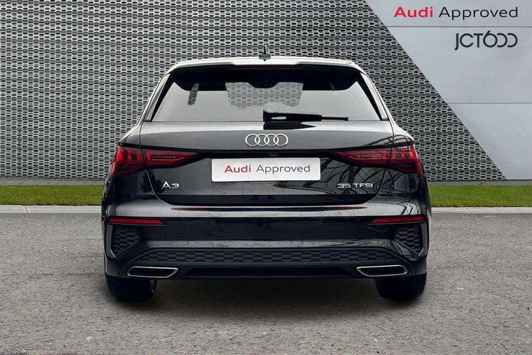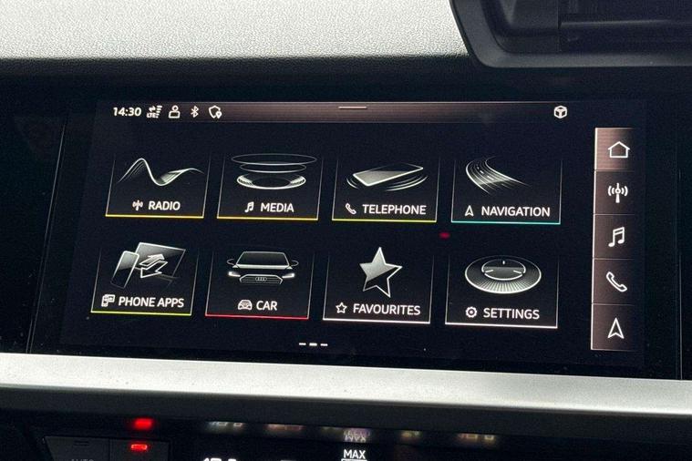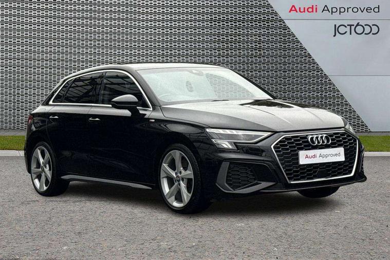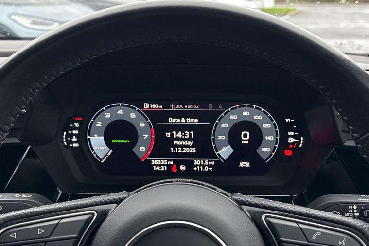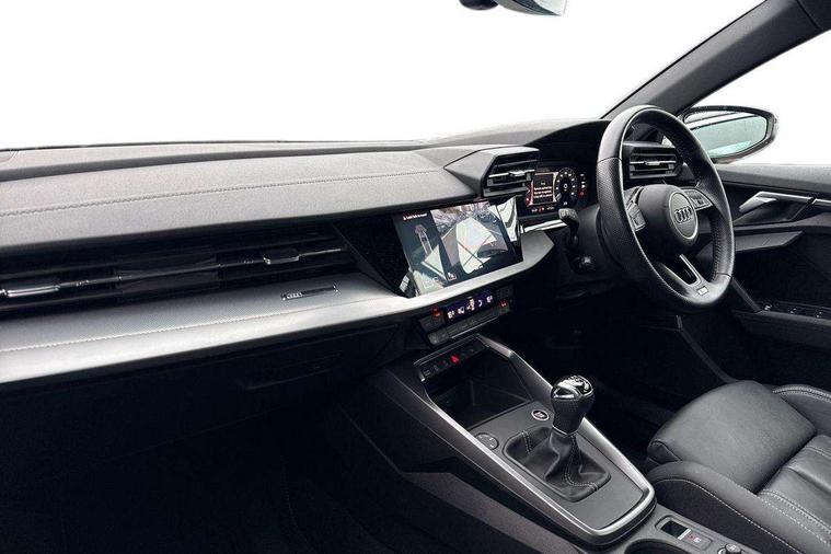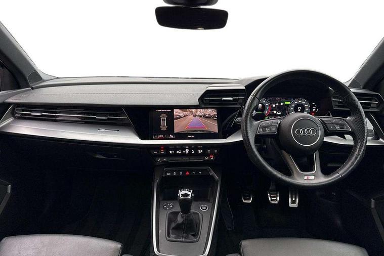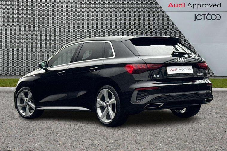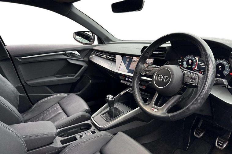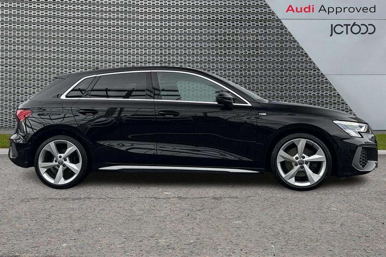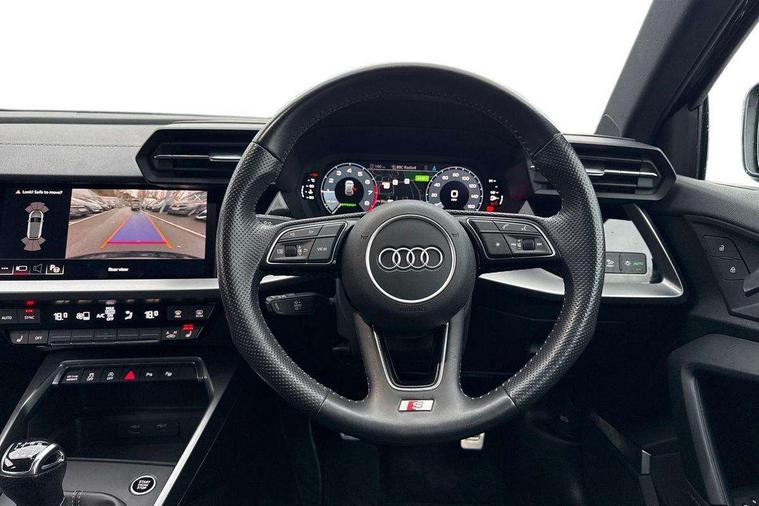 Audi connect emergency call and service, Audi drive select (Auto, Comfort, Dynamic, Efficiency and Individual), Audi smartphone interface, Audi Virtual Cockpit - 10.25" digital and colour instrument cluster, Automatic start/stop system with recuperation, Bluetooth interface, Collision avoidance assistant, Cruise control, Electromechanical power speed sensitive steering, Lane departure warning system, MMI Navigation Plus with high resolution 10.1" colour touch screen display, Rear parking sensors, Service indicator, Trip computer, Voice control system with natural language interaction, 1xUSB-A and 1xUSB-C connection, 6 passive loudspeakers, DAB Digital radio, Acoustic glass windscreen, Aluminium window trim, Auto dimming frameless rear view mirror, Body colour exterior mirrors, Electrically adjustable/heated/folding/auto dimming door mirrors with integrated LED indications + kerb view function for passenger side, Front electric windows, Illuminated aluminium inserts front door sills with S logo, LED daytime running lights, Light and rain sensors, Privacy glass - dark tinted rear window, rear door and side windows, Rear electric windows, Rear side air outlets in grained matt black, Rear wiper, S line bumpers, S roof spoiler, 12V socket and storage compartment in front centre console, 40/20/40 split folding rear seat bench with cupholder, Black cloth headlining, Dual zone electronic climate control, Front and rear centre armrest in leather, Front and rear headrests, Front/rear floor mats, Height and reach adjustable steering wheel, Interior lighting - glove compartment light and right hand side, Luggage compartment floor covering, Manual boot compartment lid, Manually adjustable front seats, Seat side bolsters, Stainless steel pedals and front footrest, Twin leather upholstery with front sports seats S embossed logo, Aluminium interior elements pack - A3 Sportback, S line styling pack - A3 Sportback, 3x3 point rear seat belts, Driver and front passenger airbag with passenger airbag deactivation, Electronic Stabilisation Control (ESC) including ABS, ASR and EDL, First aid kit with warning triangle and 2 safety vests, Hill hold assist, Pre-sense front with pedestrian and cyclist detection, Seatbelt monitoring, Tyre pressure loss indicator, Anti theft alarm, Anti-theft wheel bolts, Electronically operated child lock, Immobiliser, Remote control central locking, Accent surfaces in the dashboard and centre console in platinum grey silk effect paint finish, Dark spectrum aluminium inlays,