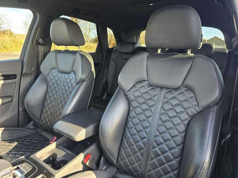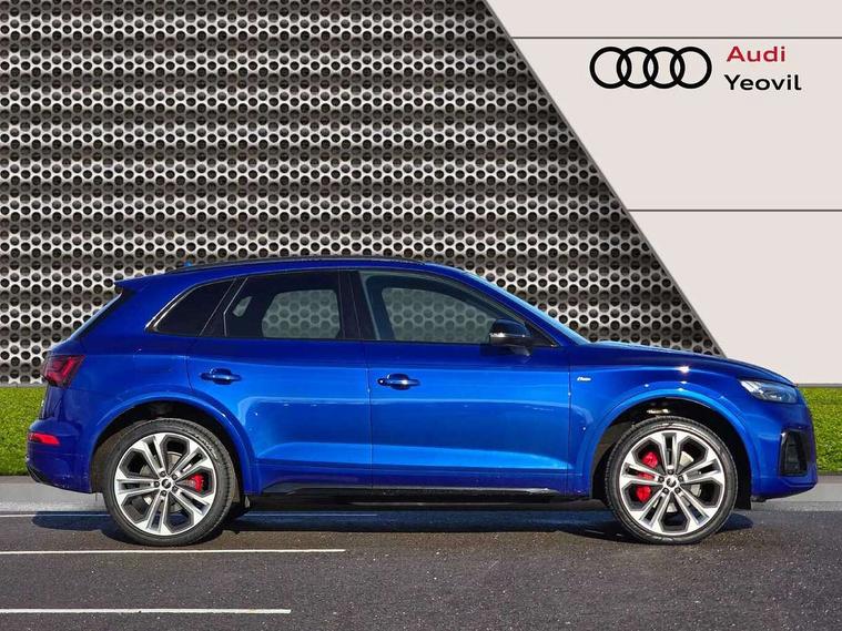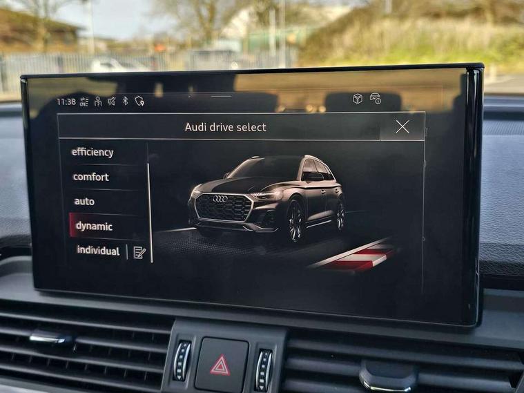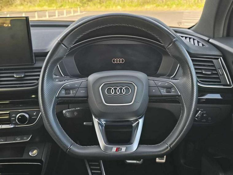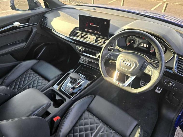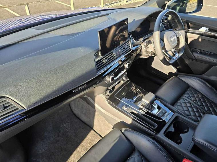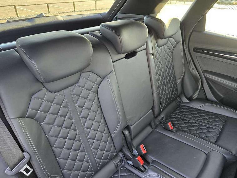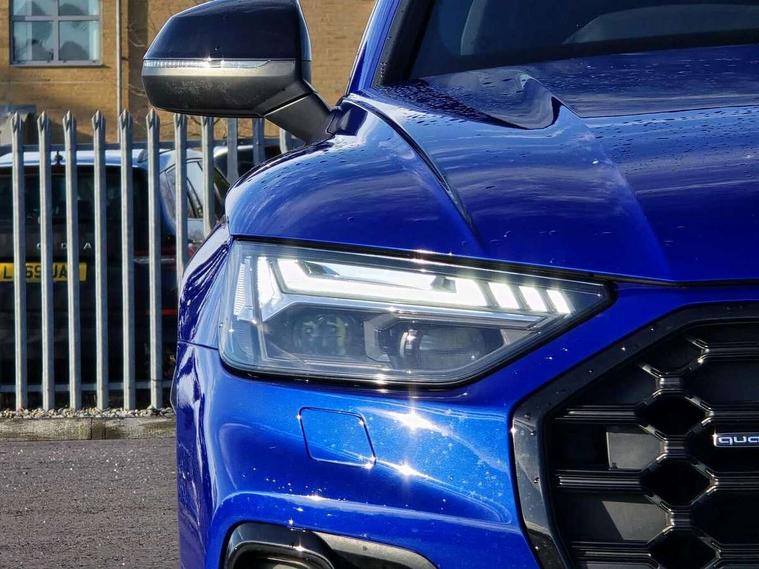 Acoustic front and rear parking sensor, Audi connect safety and service (e-call), Audi connect with Amazon Alexa Integration, Audi drive select, Audi virtual cockpit plus with 12.3" screen and three different layout designs, Audi wireless smartphone interface, Automatic start-stop system with coasting functionality and efficiency programme, Bluetooth interface, Electro - mechanical power assisted steering, MMI navigation plus with 10.1" touch screen, Power tailgate, Reversing camera, Service interval indicator, Voice control system with Audi hotword activation "Hey Audi", Quattro on demand, S line sports suspension, 8 loudspeakers, DAB Digital radio, Acoustic windscreen, Audi matrix LED headlights with dynamic front and rear indicators, Audi rings at front and rear in black, Audi rings decal on rear doors, Auto dimming door mirrors, Auto dimming frameless rear view mirror, Automatic headlight adjustment, Automatic headlights and windscreen wipers, Black roof rails, Body colour bumpers, Body colour underbody protection, Chrome plated exhaust trims, Daytime running lights, Door sills in Selenite silver, Electric adjustable/heated/folding door mirrors, Front air inlet surrounds in anthracite black, Front and rear electric windows, Headlight washers, High gloss black B pillar trims and triangular rear door trim, High level LED brake light, Rear chrome trim strip below lights, Rear privacy glass and rear side windows, Rear side wing doors, Rear wiper, Roof bars, S Line rear spoiler, 2 x USB charging port with aux input socket, 3 rear headrests, 4 way electric lumbar support for driver and front passenger, 40:20:40 split folding 3 rear bench seat in 2nd row with rear centre armrest, Black cloth headlining, Comfort front centre armrest, Contrast stitching on seats, steering wheel and gear lever gaiter, Deluxe 3 zone electronic climate control, Electrically adjustable front seats, Fine Nappa leather upholstery with diamond pattern contrast stitching + front sport seats with S embossed logo, Front/rear floor mats, Gear lever in black leather, Heated front seats, Height adjustable front head restraints, Height/reach adjustable steering column, Illuminated door sill trims with S logo, Luggage compartment cover, Rear seat bench plus-adjust for forwards/backwards position/backrest angle, cupholders in the armrest, load through hatch and remote backrest release, Removable luggage compartment floor, Single front passenger seat, Stainless steel pedals, Sunvisors with vanity mirrors, Black styling package - Q5 Edition 1, Extended interior upholstery pack - Q5, Extended LED Interior multi coloured Lighting Pack - Q5, 3 point seatbelts on all seats, 6 airbags - Driver, front passenger, curtain and side airbags, Electrically operated child locks on rear doors, Electromechanical parking brake, Electronic stabilisation control including ABS, ASR and EDL, First aid kit with warning triangle and vests, Front and rear brake calipers painted in red, Front passenger airbag deactivation, Hill descent control, Hill hold assist, ISOFIX child seat mounting for front passenger seat and ISOFIX child seat mounting with Top Tether for outer rear seats, Multi collision brake assist, Pop-up bonnet for pedestrian protection, Pre sense city, Seat belt force limiter, Seatbelt monitoring, Tyre pressure warning, Anti theft alarm, Anti-theft wheel bolts, Keyless Go access/ignition system, Remote central locking, Air vents inserts and centre console in gloss black, Piano black finish inlay,