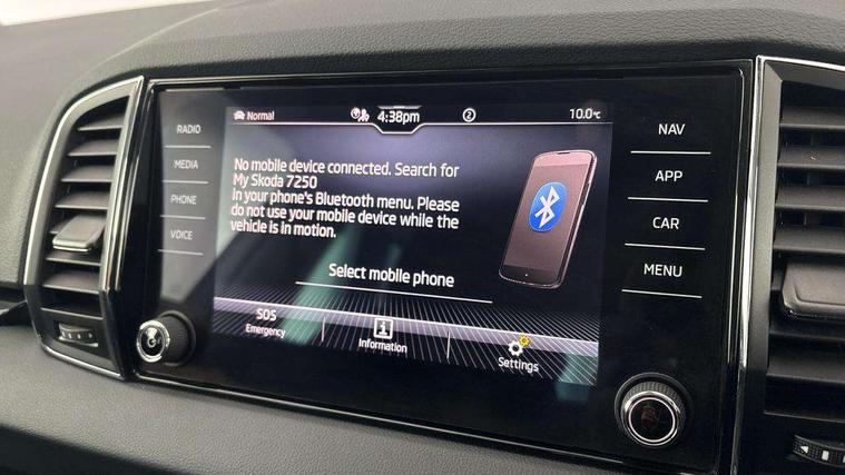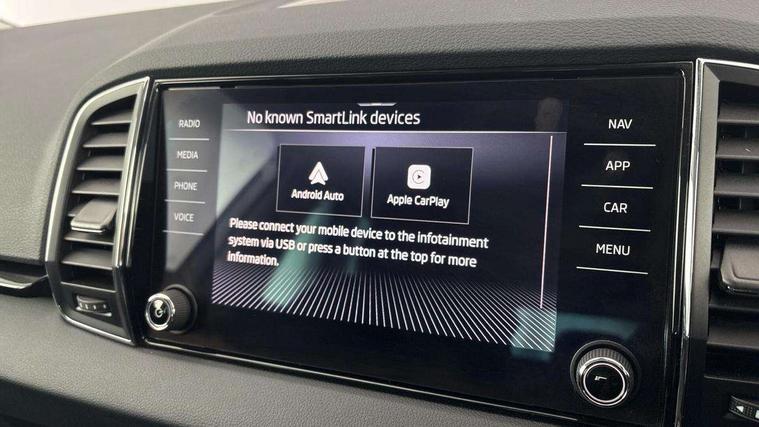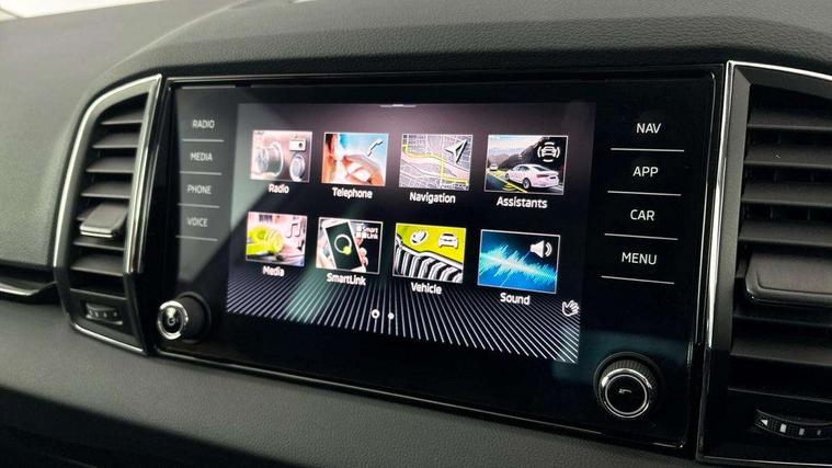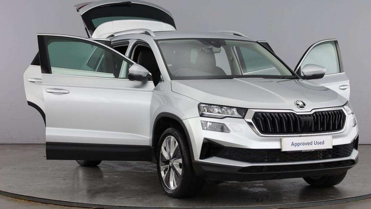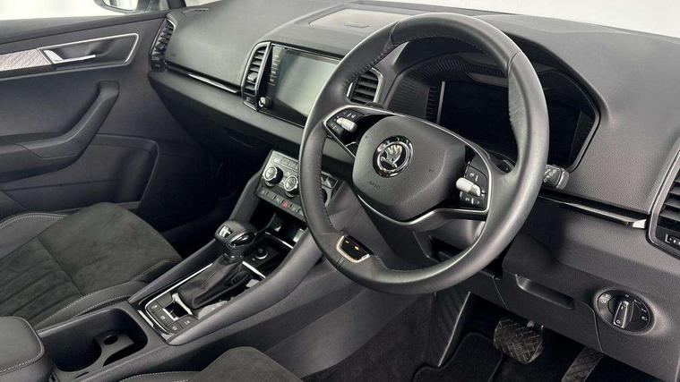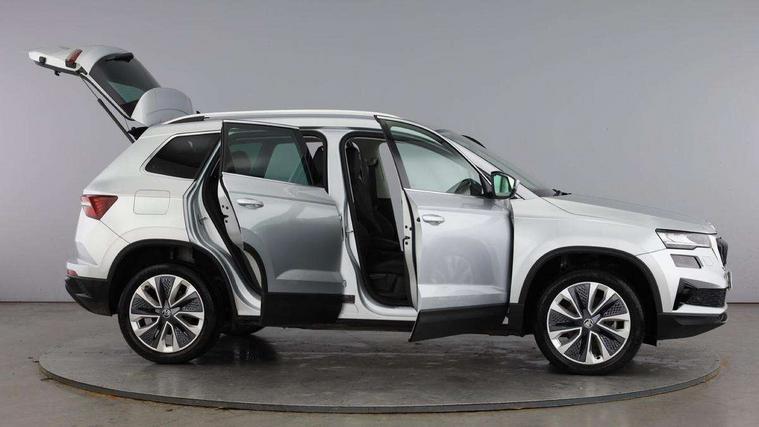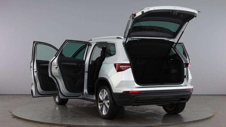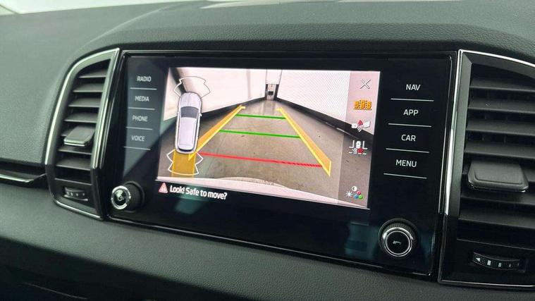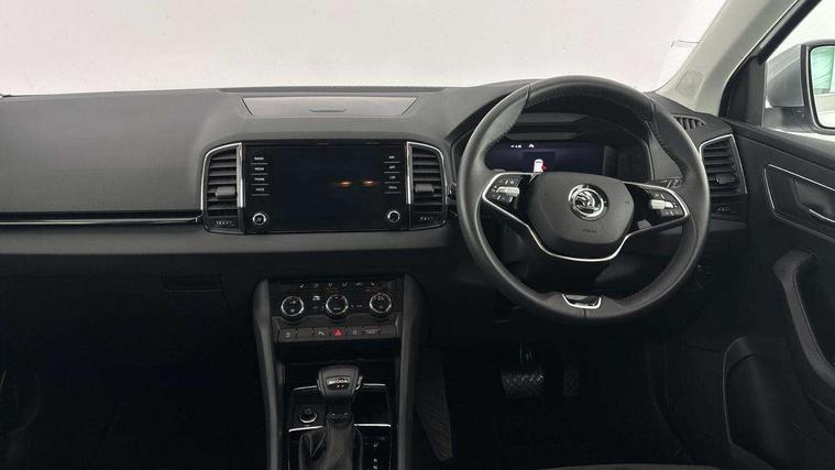 8" Digital display, Advanced driver attention and drowsiness monitor, Emergency services call system, Outside temperature gauge, Sensor for driver assistance systems, Service interval indicator, SmartLink wireless for Apple and wired for Android, Start/stop system with regenerative braking, USB C Port x 2 in front centre console, Virtual Cockpit - 10.25" digital display, Wireless smartphone charging, DAB radio with Bluetooth, USB connection, Acoustic glass, Aero front windscreen wipers with intermittent function, Auto dimming rear view mirror with light and rain sensors, Black electric window control buttons, Body colour door mirrors and handles, Electric front and rear windows with child proof lock, Heated rear windscreen, LED daytime running lights, LED rear lights with high functionality welcome effect and dynamic indicators, Light assistant (coming/leaving home/tunnel light), Plastic scuff plates in door apertures, Privacy glass, Rear side wing doors, Rear spoiler, Rear window wiper with washer system and intermittent control, Safety reflectors on front doors, Third brake light, 1.5 litre bottle holders in driver and front passenger door panels, 12V socket in boot, 12v socket in front centre armrest with storage compartment and rear air vents, 2 spoke leather heated multifunction steering wheel with DSG paddles, 2 x Tablet holder, 3 rear height adjustable headrests, 3 seat bench in 2nd row, 4 foldable roof handles with rear coat hooks, Black floor carpet, Chrome inner door handles, Foldable hooks in the boot, Front head restraints, Height adjustable front three point seats belts with tensioners, Height/reach adjust steering wheel, Ice scraper, Illuminated glovebox, Illuminated luggage compartment, Interior noise suppression, Isofix child seat preparation for front passenger seat, Isofix child seat preparation outer rear, Manual lumbar support for front seats, Pearl grey interior ceiling, Pen holder, Pollen filter, Rear boot cover, Rear reading lights, Rubbish bin door, Safety vest holder, Single front passenger seat, Storage box in upper central dashboard closed, Sunvisors with illuminated vanity mirrors, Textile floor mats, Ticket holder, Design Pack - Karoq, Non Smokers pack, Parking pack - Karoq, Automatic door unlocking in case of crash, Automatic fuel cut off in case of crash, Driver airbag, Electronic parking brake with auto hold function, Emergency rear braking signal, ESC (incl. ABS+MSR+ASR+EDS+HBA+DSR+RBS+MKB), Front side airbags, Head airbags, Hill hold control, Knee airbags, Passenger airbag with switch-off function, Pedestrian monitor, Seatbelt reminder signalisation and pretensioner for all seats, Three point seatbelts rear, Two tone horn, Tyre pressure monitor, Alarm with interior monitoring, back up horn and tilt sensor with safe function, Electronic engine immobiliser, Keyless entry and start/stop, Remote central locking with 2 remote folding keys, Black centre console, Chrome framed air vents, Satin black dashboard, Anti-theft wheel bolts protection, Breakdown and tool kit,