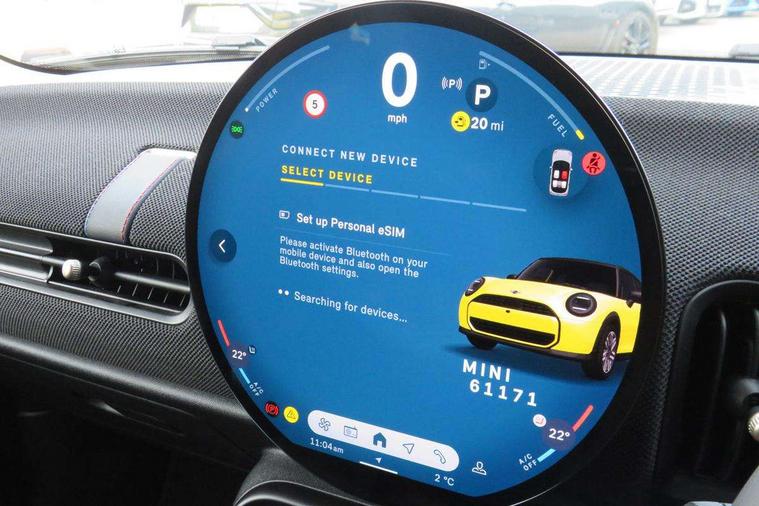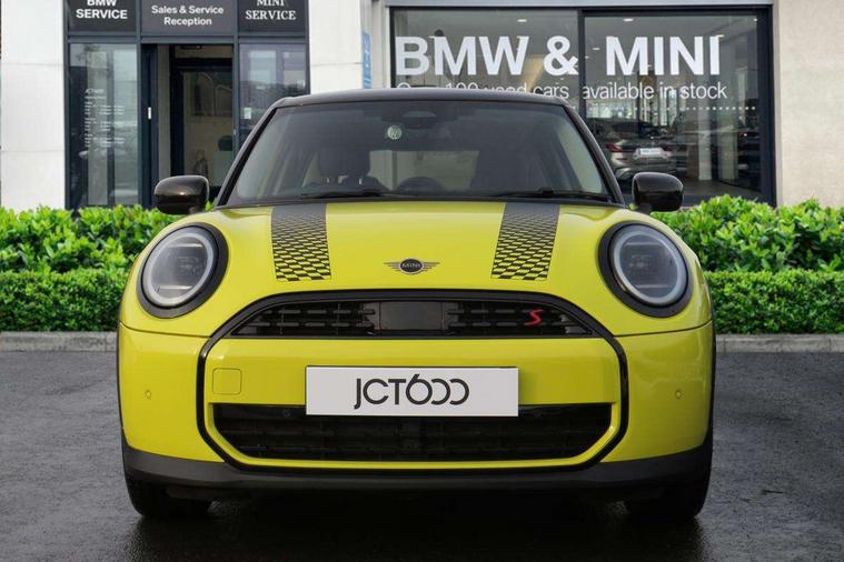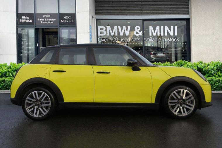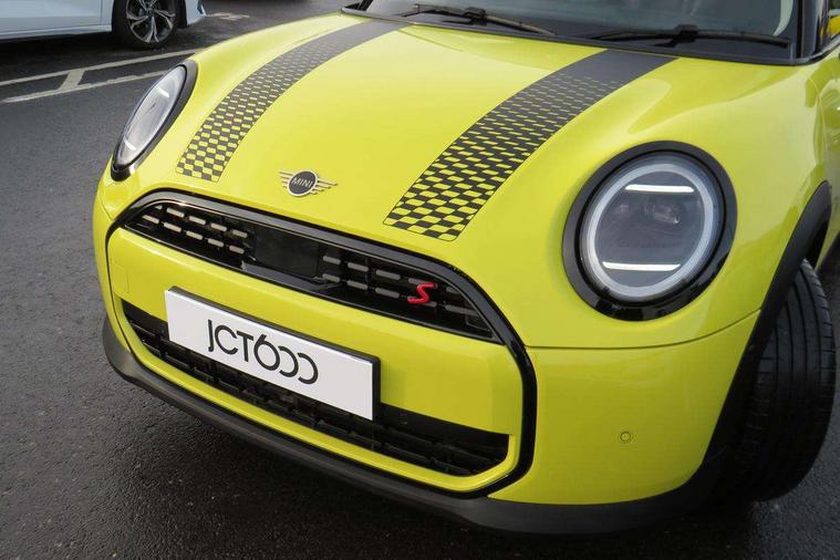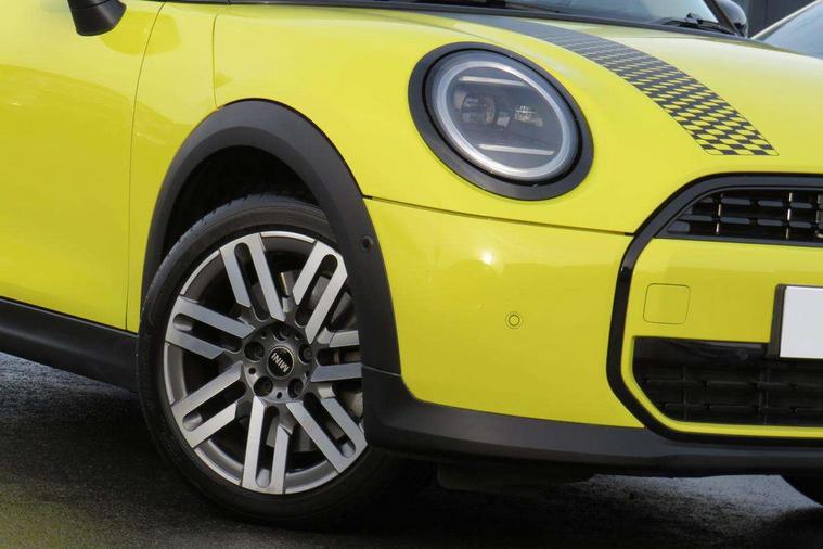 Central toggle bar, Circular OLED Screen, Compatible mobile phone bluetooth with audio streaming, Cruise control, Digital instrument cluster, Electro-mechanical speed dependant steering assistance, Emergency call service, MINI Experience Modes, Mini navigation system, On board computer, Service interval indicator, 7 speed steptronic transmission with double clutch, DAB Digital radio, Personal eSim, Adaptable light signatures, Auto headlights, Electric adjustable heated door mirrors, Electric front+rear windows, Heated rear window, Heated windscreen washer jets, LED daytime running lights, LED indicator lights, LED rear lights, Rain sensor window wipers, Rear fog lights, Rear side wing doors, Rear window wiper, 2 zone automatic air conditioning, 3 seat bench in 2nd row, 60/40 rear seat bench, Ambient lighting, Cupholders, Floor mats, Front and rear head restraints, Front compact armrest, Heated steering wheel, Height adjustable passenger seat, Light headliner, Luggage compartment lighting, Single front passenger seat, Sport Vescin Steering Wheel black with vibrant silver accents, Sunvisors with vanity mirrors, Vescin/Cloth upholstery, Driving assistant pack - Cooper Hatchback, Level 1 pack - Mini Hatchback, Park assistant pack - Cooper Hatchback, 3 point seatbelts on all five seats, 6 Airbags - front, side, head and seat belt tensioners, Acoustic pedestrian protection, Anti-lock braking system (ABS), Child locks on rear doors, DSC - Dynamic Stability Control, Electronic parking brake, Front and rear disc brakes, Front ISOFIX (iSize), Front passenger airbag deactivation, Traction control, Tyre pressure monitoring system, Alarm, Immobiliser, Remote central locking, Black/Blue dashboard knit, Tyre repair kit,