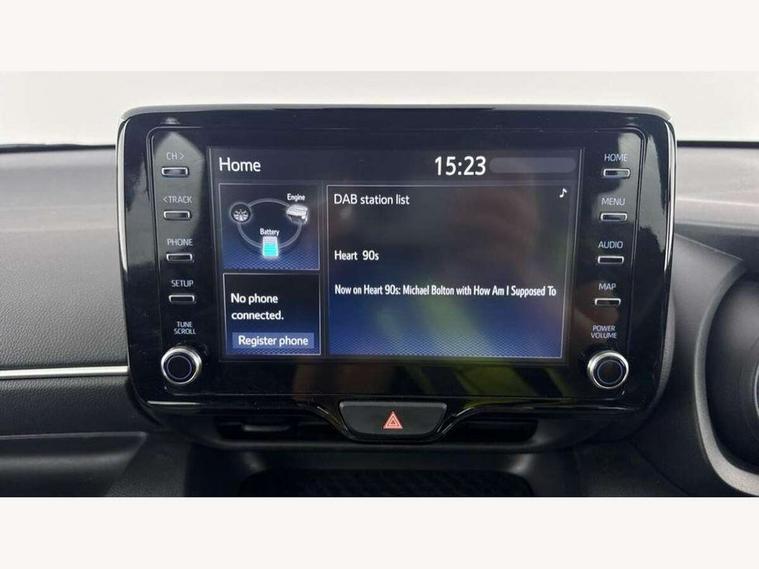 Adaptive cruise control, Adjustable speed limit with speed warning, Bluetooth connectivity, Colour binocular inspired displays with digital speedometer, E-call, Electric power steering, Hybrid energy display, Multi information display switches on steering wheel, Reversing camera, Smartphone integration with Apple CarPlay and Android auto, Tailgate, Voice recognition, Vehicle Stability Control (VSC), 4 speakers, 8" Multimedia display touch screen, USB connection, Acoustic windscreen glass, Auto windscreen wipers, Automatic headlights, Body coloured door mirrors, Electric adjustable heated door mirrors, Follow me home headlights, Front auto power windows with anti jam protection, Full LED rear lights, LED daytime running lights, LED front fog lights, LED front light guide, LED Headlights, LED High mounted stop lamp, LED Indicators, LED rear light guide, Manual headlight levelling, Painted chequered front grille, Rain sensor, Rear auto power windows with anti jam protection, Rear privacy glass, Rear side wing doors, Rear spoiler, Rear wiper, Shark fin antenna, Turning signal integrated indicators in door mirrors, Variable front intermittent wipers, 3 adjustable rear headrests, 3 spoke leather steering wheel, 60/40 split folding rear seat, Active headrests, Adjustable boot height, Auto air conditioning, Coat hooks in rear grab handles, Cup holders (2 front & door), Data Communication Module (DCM) connected services, Fabric upholstery, Front armrest, Glovebox, Grey roof lining, Height adjustable driver's seat, Isofix seat fixing, Leather gearshift, Pollen filter, Shopping bag hooks, Single front passenger seat, Tilt/telescopic steering column, 3 point seatbelts on all rear seats, ABS+EBD+Brake assist, Electronic parking brake, Emergency brake light system (EBS), Front passenger airbag on/off switch, Front seatbelt reminder, Hill start assist control (HAC), Rear child proof door locks, Rear seat belt reminder, Supplemental Restraint System (SRS) 8 airbags: Driver & passenger's airbags, dual side curtain airbags, side impact airbags, front centre airbag, Toyota Safety Sense 2, Precollison + Night time Pedestrian & Cyclist Detection, Lane Trace Assist, Auto High Beam, Intelligent ACC & Road Sign Assist, Tyre pressure warning system, 2x Master key, Alarm/immobiliser, Remote powered central double locking doors, Soft touch instrument panel, Space saver spare wheel,