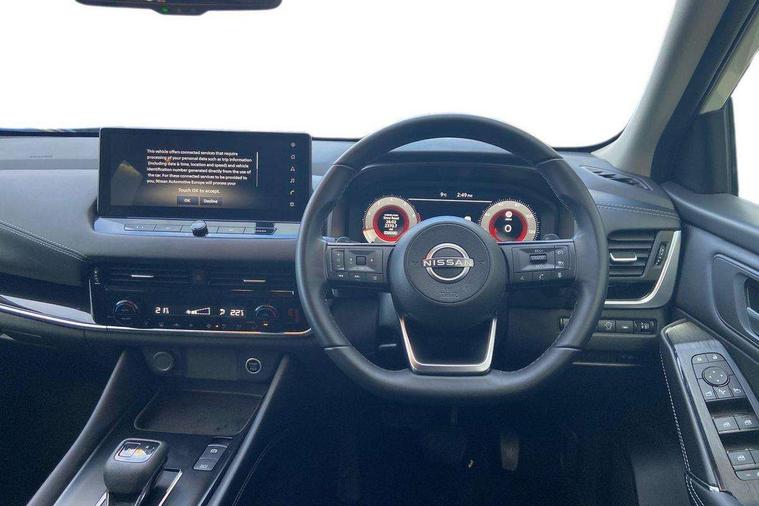 Android auto/Apple CarPlay (Wired), Blind spot warning, Drive modes (sport, normal, eco), Electric speed sensitive power steering, Emergency and breakdown call, Full Digital 12.3" TFT Digital Combimeter, Google maps services - search, weather, 3D maps and Google street view, Idle stop/start system, Intelligent around view monitor, Intelligent Cruise control (ICC), Intelligent driver alert system, Intelligent forward collision warning, Intelligent lane intervention, Lane departure prevention, Lane departure warning system, Maximum speed limiter, Moving object detection, Nissan connect 12.3 inch touchscreen infotainment system, Nissan connect navigation, Push button starter, Rear cross traffic alert, Rear parking sensors, Rear view camera, Remote control services - door locks, lights, horn and car locator, Telematics - notifications and connectivity services, TomTom live traffic services, Traffic sign recognition with legal speed adjustment, Trip computer, Virtual personal assistant and firmware over the air capability, Wireless apple carplay, 6 speakers, AM/FM audio system with DAB, Bluetooth audio streaming, Front USB connections (Type-A and Type-C), Rear USB charging only ports (Type-A and Type-C), Auto dimming rear view mirror, Auto rear wiper when reversing, Automatic hazard signal with emergency stop signal, Body colour mirror caps, Body coloured door handles, Bodyside mouldings, Chrome side window finisher, Door handle with button, Electric auto folding door mirrors, Electrically adjustable and heated door mirrors with LED turn indicator, Follow me home headlights, High beam assist, Intelligent auto headlights, LED daytime running lights, LED Headlights, LED rear lights, One touch front and rear electric windows with remote opening and closing, Partially body coloured bumpers, Privacy glass, Rear bumper with graphite insert, Rear reversing light (bulb lighting), Rear roof spoiler, Rear side wing doors, Rear styling plate, Shark fin antenna, Splash free rain sensing wipers, Super UV and infrared cut glass, Three blink turn signal, 12v power socket in dashboard and luggage, 2x Rear coat hooks, 3 bench rear seats in 2nd row, 3 rear headrests, 4 folding assist grip, 6 Luggage hooks - 4 on floor, 2 on side, 6-way manually adjustable driver's seat, 60/40 split folding rear seat bench, Ambient lighting around centre console, Centre console storage tray, Chrome interior door handles, Cloth monoform upholstery, Driver and front passenger sunvisors with illuminated vanity mirrors, Driver seat back pocket, Dual zone automatic climate control with pollen filter, Electrically adjustable lumbar support for driver, Front and rear door storage, Front centre console and armrest, Front cupholders x 2, Front door with bottle holders, Glovebox with light, Hard trunk cover, Height adjustable driver's seat, Height adjustable front headrests, Height adjustable passenger seat, Leather steering wheel, Luggage board system, Luggage space lighting, Manually adjustable passenger (slide recline + lifter), Multifunction steering wheel, Passenger seat back pocket, Rear armrest with 2 cupholders, Rear door bottle holders, Single front passenger seat, Soft PVC kneepad, Steering wheel gearshift paddles, Steering wheel switches, Sunglasses holder, Tilt/telescopic adjustable steering wheel, Two rear isofix child seat anchorage points with top tether, Welcome light and console tray ambient lighting, 3x3 point rear seatbelt pretensioners + load limiters, ABS with EBD and brake assist, Active brake limited slip, Auto hold function, Child locks on rear doors, Curtain and front side, far side airbags, Driver and passenger airbags, Driver, passenger and 2nd row rear seat belt reminder, Electronic parking brake, Front seatbelt pretensioners + load limiters, Height adjustable front seatbelts, Hill start assist, Intelligent blind spot intervention, Intelligent front emergency braking with pedestrian, cyclist recognition and junction assist, Intelligent rear automatic braking, Tyre pressure monitoring system, Vehicle dynamic control, Capless fuel filler, Engine immobiliser, Intelligent Key, Remote central door locking with deadlocking, Thatcham Cat.1 alarm, Interior instrumental panel B finisher, 18" Diamond cut alloy wheels, Tyre puncture repair kit,