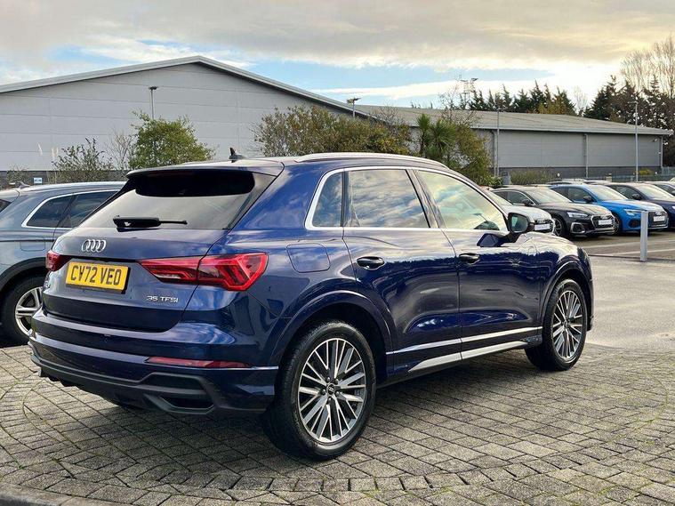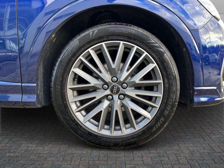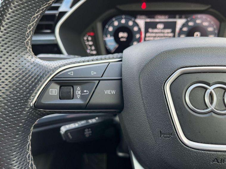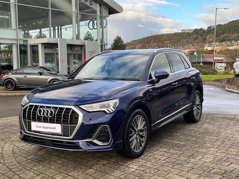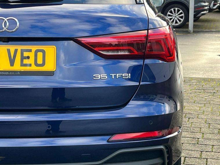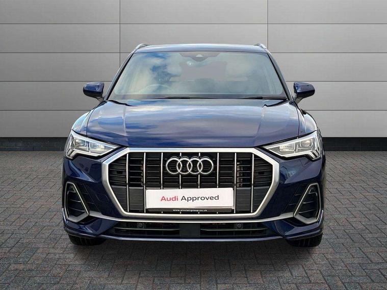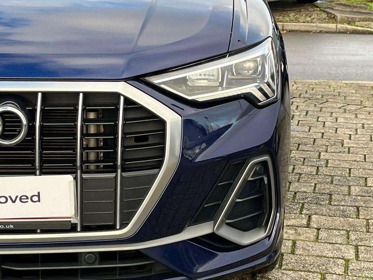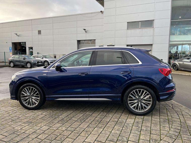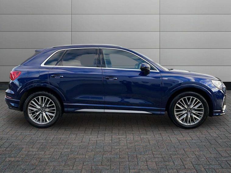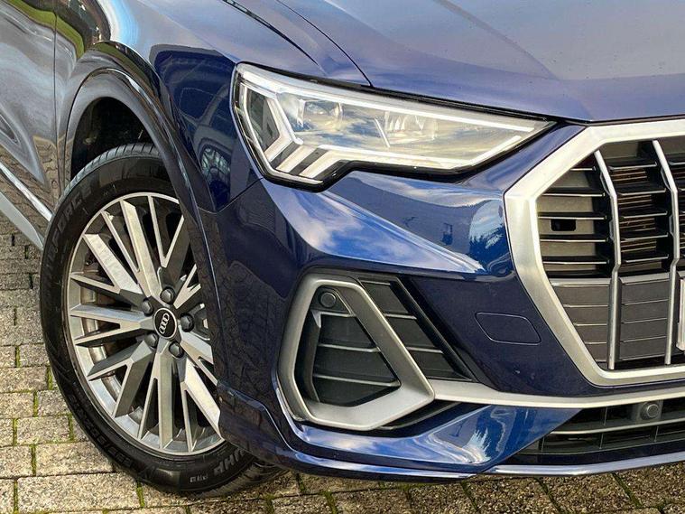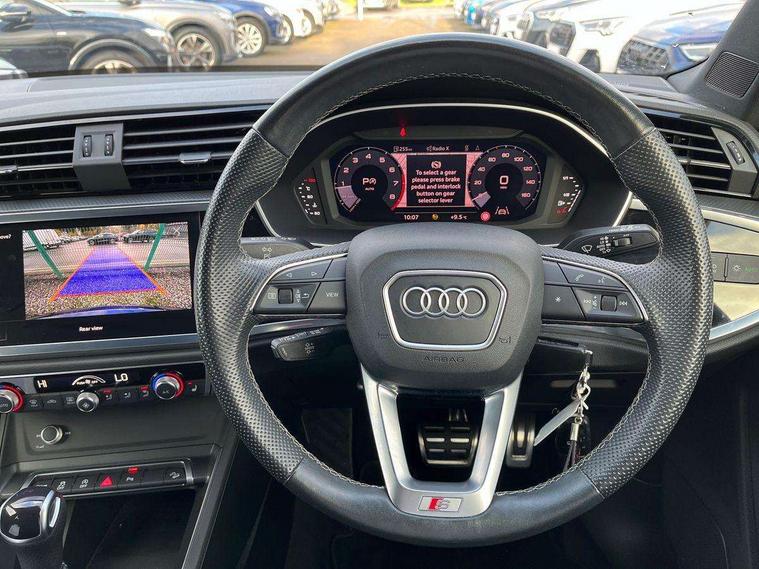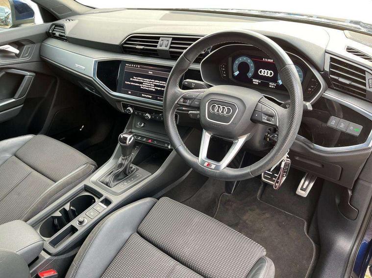 Amazon alexa Integration, Audi drive select, Audi lane departure warning, Audi Virtual Cockpit - 10.25" display, Bluetooth interface, Camera based traffic sign recognition, Legal emergency call, MMI Navigation Plus with high resolution 10.1 inch touchscreen colour display, Power operated tailgate, Progressive steering, Service interval indicator, Smartphone interface includes wireless Apple carplay/Android Auto, Start stop system with recuperation, Voice control system with natural language interaction, Sports suspension, 2 USB-C ports with charge and data functions, 6 passive loudspeakers, DAB digital radio module, Acoustic windscreen, Aluminium roof rails, Aluminium window trim, Auto dimming frameless rear view mirror, Body colour front spoiler blade, Body coloured bumpers, Electrically folding, adjustable and heated door mirrors with integrated LED side indicators and kerb view function for passenger side, Front and rear electric windows, Front fog lights, Front side air inlets in matt platinum grey, Grille vertical bars in aluminium silver/Matt, High gloss black finish B and C pillars, LED Dynamic rear indicators, LED headlights with LED daytime running lights, LED rear lights, LED third brake light, Privacy glass dark tinted rear and rear-side windows (from B-pillar backwards), Rain and light sensors, Rear diffuser grille in grained matt black, Rear diffuser strip in matt titanium black, Rear side wing doors, Rear wiper, S line badges on front wings, S Line front and rear bumpers, Side skirt insert in matt Platinium grey, Titanium black radiator grille, Variable front intermittent wipers, 12V socket in rear centre console, 3 seat bench in 2nd row, 40:20:40 folding with manual adjustment for 60:40 forwards/backwards position and backrest angle, Adjustable rear seat bench/backrest with centre armrest and cupholder, Black cloth headlining, Dual zone electronic climate control, Front and rear black floor mats with contrast stitching in rock grey, Front and rear headrests, Front and rear roof module including reading lights, Front centre armrest, Glove compartment lighting, Height and reach adjustable steering wheel, Illuminated door sill trims with S logo, ISOFIX child seat mounting for front passenger with airbag deactivation and outer rear seat including top tether attachment point for outer rear seats, Luggage compartment light, Manual front seats with height adjustment, Perforated leather gearknob, Single front passenger seat, Stainless steel luggage compartment sill finisher, Stainless steel pedals, Ambient lighting pack - Q3, Non smoking pack - Q3, 3x3 point rear seatbelts, 6 airbags - Driver, front passenger, curtain and side windows, Audi pre-sense front with pedestrain and cyclist recognition, Electrically operated child locks on rear doors, Electromechanical parking brake, Electronic stabilisation control including ABS, ASR and EDL, Front seatbelt reminder, Hill descent control, Hill hold assist, Pre sense basic, Seatbelt monitoring, Tyre pressure warning, Warning triangle and first aid kit, Anti theft alarm, Anti theft wheel bolts, Immobiliser, Remote central locking, Dark matt brushed aluminium inlay, Detail dashboard around MMI touch colour display in glass look, black with surround in aluminium look, Leatherette door armrest,