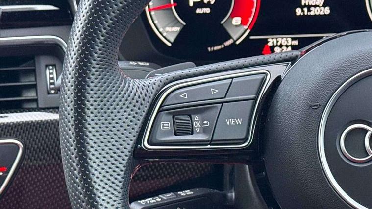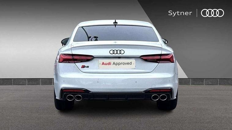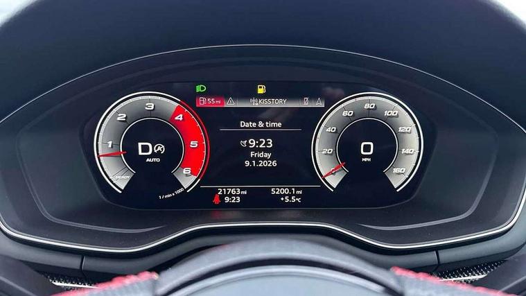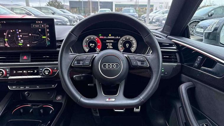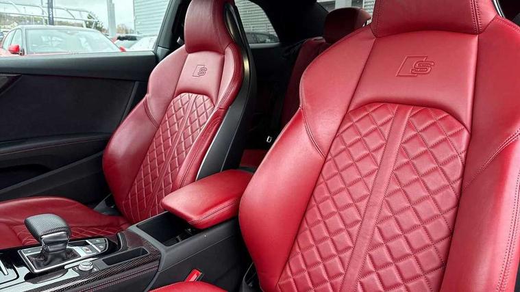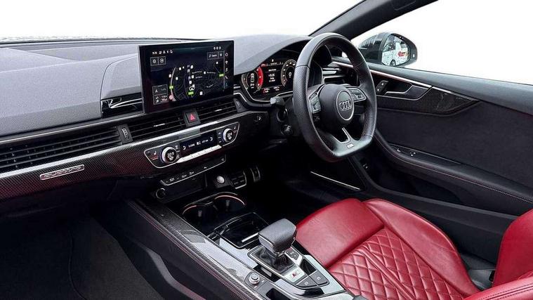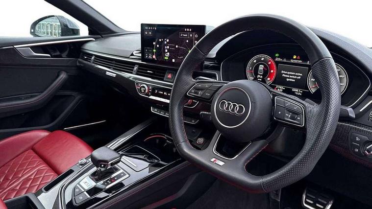 Audi connect safety and service (e-call), Audi connect with Amazon Alexa Integration, Audi drive select (Auto, Comfort, Dynamic, Efficiency and Individual), Audi parking system plus with front and rear sensors, Audi smartphone interface, Audi virtual cockpit - 12.3" full colour digital instrument cluster, vehicle/engine speed, Radio/media information+Driver assistance systems, Automatic start-stop system with coasting functionality and efficiency programme, Bluetooth interface, Electric boot lid release, Electro-mechanical power steering, Email, calendar and text messages displayed via MMI, MMI nav+ with MMI touch - 10.1" high resolution MMI display, touch sensitive, 3D map, route/country info, dynamic route guide, personal route assist, Rear view camera, S instrument dials, Service interval indicator, Voice control system, Diesel particulate filter, S sports suspension, Audi sound system with 10 loudspeakers, CD player, DAB digital radio reception, Two additional USB ports for rear passenger in rear centre console, Two SDXC card slots, Audi Beam uses LEDs to project the Audi logo, Audi matrix LED headlights with LED rear lights + dynamic front and rear indicators, Auto dimming door mirrors, Auto dimming rear view mirror, Black door mirror housings, Body colour door handles, Body colour front spoiler lip, Body colour side sill trim, Electric adjustable heated door mirrors, Electric folding door mirrors, Electric front windows, Front and rear bumpers with side skirts, Front fog lights, Kerb-view function for passenger side, LED daytime running lights, LED side indicator lights integrated into door mirrors, LED third brake light, Privacy glass, Rain and light sensors, Rear boot, Rear side wing doors, S radiator grille in twilight grey matt with dual struts in aluminium and S5 logo, S rear diffuser in twilight grey matt and honeycomb grille in black, S specific dual branch chrome tailpipes with twin oval pipes on left and right, S specific side air inlets in titan black with chrome inlays in unique S design, Variable front intermittent wipers, Windscreen with acoustic glazing, 2 seat bench in 2nd row, 40/20/40 split folding 2 seater rear seat bench with rear centre armrest, Adjustable steering column, Black cloth headlining, Black leather gear lever knob, Contrast stitching on seats, steering wheel and gear lever gaiter, Deluxe 3 zone electronic climate control, Electrically adjustable front seats, Fine nappa leather upholstery with S embossed logo + super sports seats, Front centre armrest, Front head restraints, Front/rear floor mats, Gear lever with diamond S badge, Heated front seats, Illuminated door sill trim with S logo, ISOFIX child seat mounting and top tether, Key with S logo, Luggage compartment mat, Pneumatically adjustable lumbar support with massage function, Rear headrests, Single front passenger seat, Stainless steel pedals, Sunvisors with vanity mirrors, Black styling pack - A5 Coupe/Sportback, Extended leather pack - A5, LED interior light pack - A5/RS5, 2 x 3-point rear seatbelts, 6 airbags - Driver, front passenger, curtain and side airbags, Electromechanical parking brake, Electronic Stabilisation Control (ESC) including ABS, ASR and EDL, Front brake calipers painted in black with S5 logo, Front passenger airbag deactivation, Height adjustable front seatbelts, Hill hold assist, Multi collision brake assist, Pop-up bonnet for pedestrian protection, Pre sense city, S model enhanced braking system, Seatbelt monitoring, Tyre pressure warning, Variable restraint system, Warning triangle and first aid kit, Anti theft alarm system, Anti theft wheel bolts, Immobiliser, Keyless Go, Remote central locking, 20" 5 twin spoke polygon design alloy wheels in gloss anthracite black and gloss turned finish, Tool kit, Tyre repair kit,
