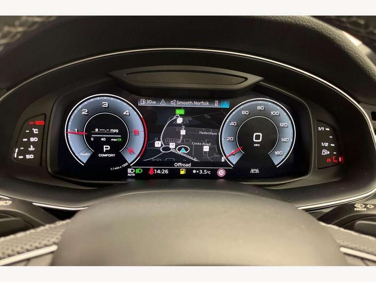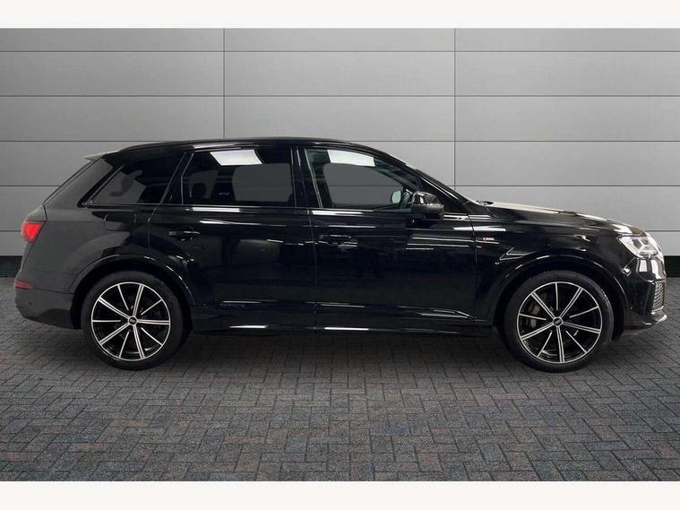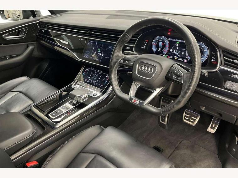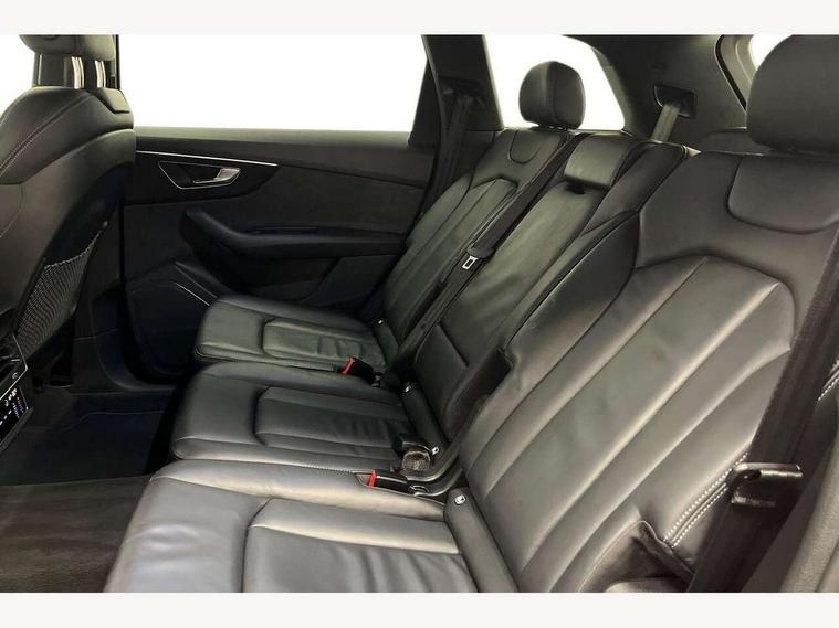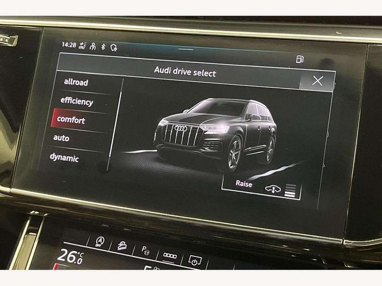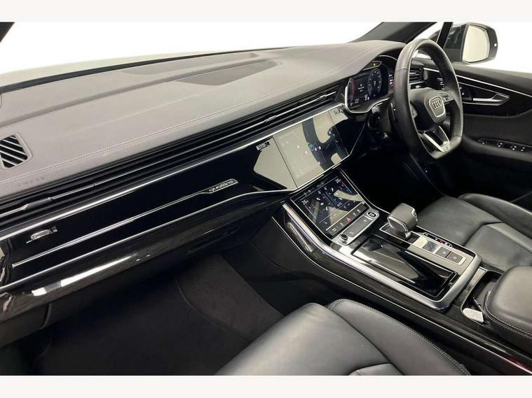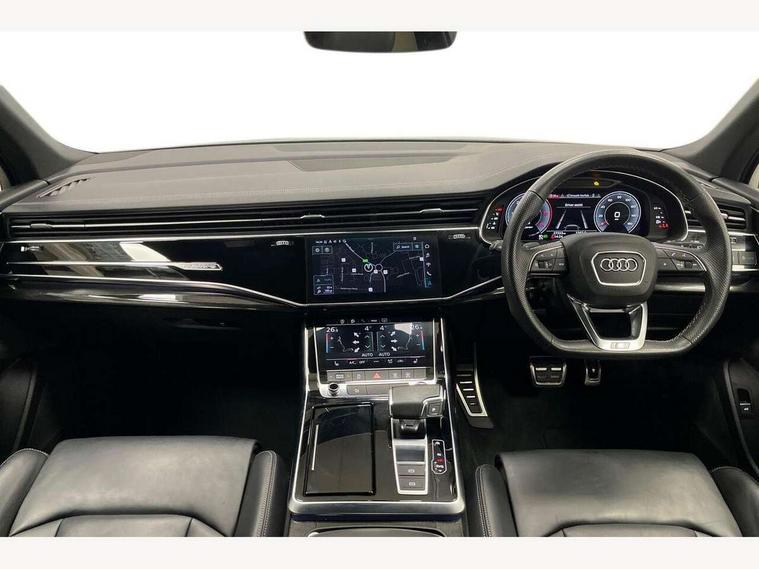 Audi connect safety and service (e-call), Audi connect with Amazon Alexa Integration, Audi drive select (Auto, Comfort, Dynamic, Efficiency, Individual, Off-road and All road), Bluetooth interface, Camera based traffic sign recognition, Electromechanical steering, MMI navigation plus with MMI touch screens includes 10.1" and 8.6" screens with haptic feedback, Natural voice recognition, Parking system plus with 360 degree display (front, rear and side sensors) - acoustic and visual park assist system, Power operated tailgate, Rear view camera, Smartphone interface includes wireless Apple carplay/Android Auto, Start/stop system, 48V Mild hybrid technology, Adaptive air sports suspension, Quattro all wheel drive with self locking centre differential, Audi music interface - front 2 USB-C ports with charger and data functions, Audi sound system with 6 channel amplifier, 180 watt amplifying capacity and 10 loudspeakers including subwoofer, DAB digital radio module, 3rd brake light, Audi matrix LED headlights with dynamic front and rear indicators, Auto dimming frameless rear view mirror, Black roof rails, Bumpers in contrast paint scandium grey finish includes door trim and wheel arch trim strips, inlays in door strip contain quattro embossing, Electrically adj heated/folding + automatically dimming exterior mirrors with memory + automatic kerb side function for passenger side exterior mirror, Heat insulating glass in windshield, Integrated LED indications in door mirrors, LED daytime running lights, LED rear tail lights, Privacy glass - dark tinted rear and rear side windows from B-pillar backwards, Rear side wing doors, Rear wiper, 2 seat bench in 3rd row, 3 seat bench in 2nd row, 4 zone deluxe automatic climate control, 7 seat layout with ISOFIX points for the front passenger seat and rear passenger seat, Black cloth headlining, Comfort front centre armrest, Electric adjustable front seat with 4 way lumbar support, driver memory functionality, Folding rear seats, Front head restraints, Front/rear floor mats, Heated front seats, Illuminated door sill trims with S logo, LED interior ambient lighting, Luggage compartment cover, Luggage compartment sill protection in stainless steel, Rear head restraints, Single front passenger seat, Stainless steel pedals, Sunvisors with illuminated vanity mirrors, Titanium black styling pack - Q7/SQ7, 3 point seatbelts on all rear seats, Audi pre sense front, Child locks on rear doors, Driver and front passenger, front side and curtain airbags, Electromechanical parking brake, Electronic Stabilisation Control (ESC) including ABS, ASR and EDL, Extended pedestrian protection measures, Hill hold assist, Seatbelt monitoring, Tyre pressure loss indicator, Warning triangle and first aid kit, Anti theft alarm, Anti-theft wheel bolts and wheel loosening detection, Keyless Go, Remote central locking, Polished oak trim with grey finish inlay, Tool kit, Tyre repair kit,