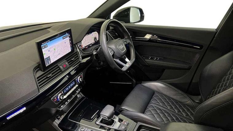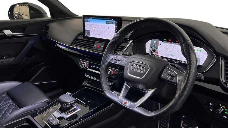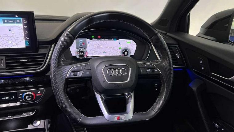 Audi connect safety and service (e-call), Audi connect with Amazon Alexa Integration, Audi drive select, Audi virtual cockpit plus with 12.3" screen and three different layout designs, Audi wireless smartphone interface, Automatic start-stop system with coasting functionality and efficiency programme, Bluetooth interface, Electro - mechanical power assisted steering, MMI navigation plus with 10.1" touch screen, Power tailgate, Reversing camera, Service interval indicator, Voice control system with Audi hotword activation "Hey Audi", Diesel particulate filter, Quattro on demand, S line sports suspension, 2 x USB charging port with aux input socket, DAB Digital radio, Acoustic windscreen, Audi beam with Audi rings logo, Audi matrix LED headlights with dynamic front and rear indicators, Audi rings at front and rear in black, Audi rings decal on rear doors, Auto dimming rear view mirror, Automatic headlights and windscreen wipers, Black door mirrors, Black roof rails, Body colour underbody protection, Chrome plated exhaust trims, Door sills in Selenite silver, Electric adjustable/heated/folding door mirrors, Front air inlet surrounds in aluminium, Front and rear electric windows, Headlight washers, High gloss black B pillar trims and triangular rear door trim, Rear chrome trim strip below lights, Rear privacy glass and rear side windows, Rear spoiler, Rear wiper, Roof bars, Without model and engine badging at rear, 3 rear headrests, 4 way electric lumbar support for driver and front passenger, 40:20:40 split folding rear seat with rear centre armrest, Black cloth headlining, Comfort front centre armrest, Contrast stitching on seats, steering wheel and gear lever gaiter, Deluxe 3 zone electronic climate control, Electrically adjustable front seats, Fine Nappa leather upholstery with diamond pattern contrast stitching + front sport seats with S embossed logo, Front head restraints, Front/rear floor mats, Gear lever in black leather, Heated front seats, Height/reach adjustable steering column, Illuminated door sill trims with S logo, ISOFIX child seat mounting and top tether, Rear seat bench plus, Removable luggage compartment floor, Stainless steel pedals, Sunvisors with vanity mirrors, Trunk roller cover, Artificial leather pack - Q5, Black styling package - Q5 Edition 1, Extended LED Interior multi coloured Lighting Pack - Q5, 3 point seatbelts on all seats, 6 airbags - Driver, front passenger, curtain and side airbags, Electrically operated child locks on rear doors, Electromechanical parking brake, Electronic stabilisation control including ABS, ASR and EDL, Front and rear brake calipers painted in red, Front passenger airbag deactivation, Hill descent control, Hill hold assist, Multi collision brake assist, Pop-up bonnet for pedestrian protection, Pre sense city, Seat belt force limiter, Seatbelt monitoring, Tyre pressure warning, Warning triangle and first aid kit, Anti theft alarm, Anti-theft wheel bolts, Keyless Go access/ignition system, Piano black finish inlay,