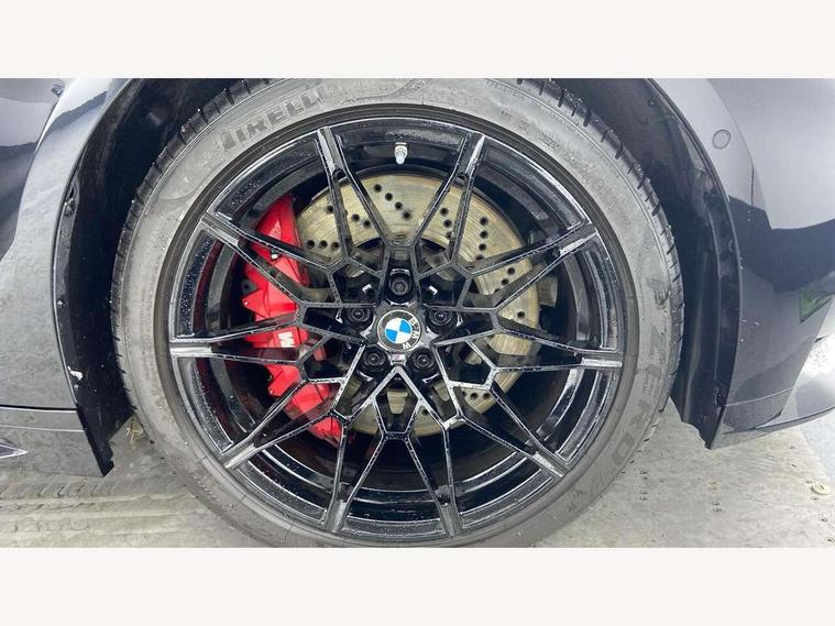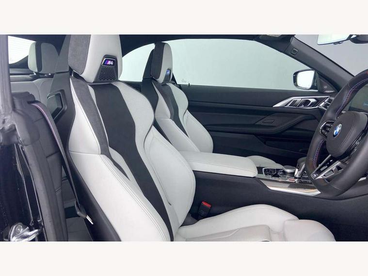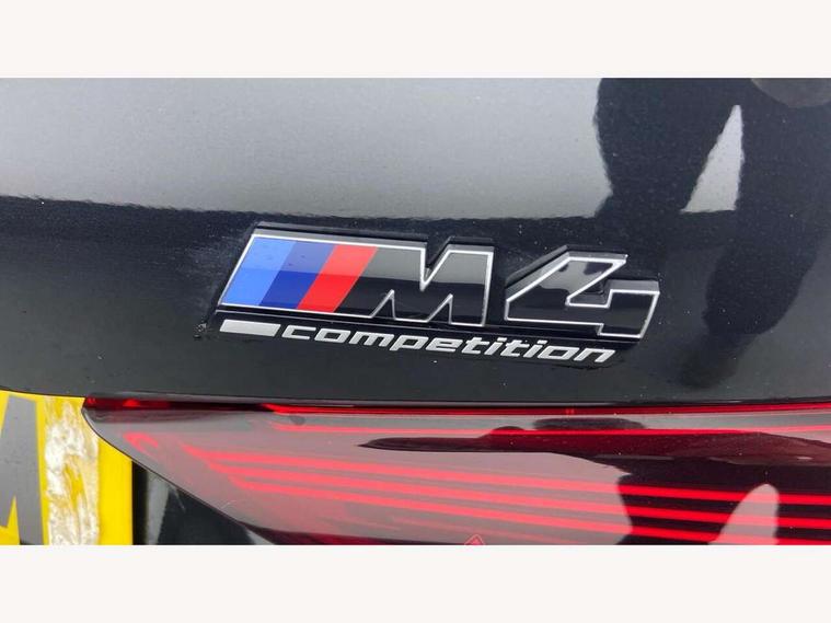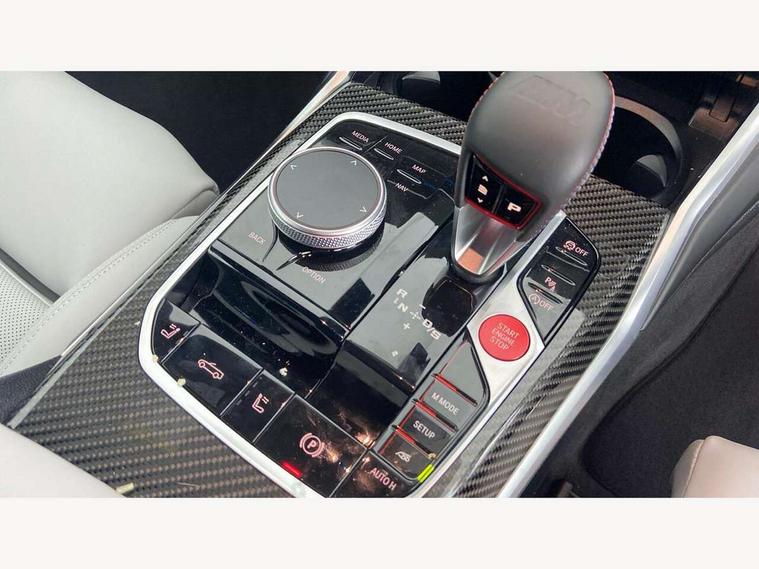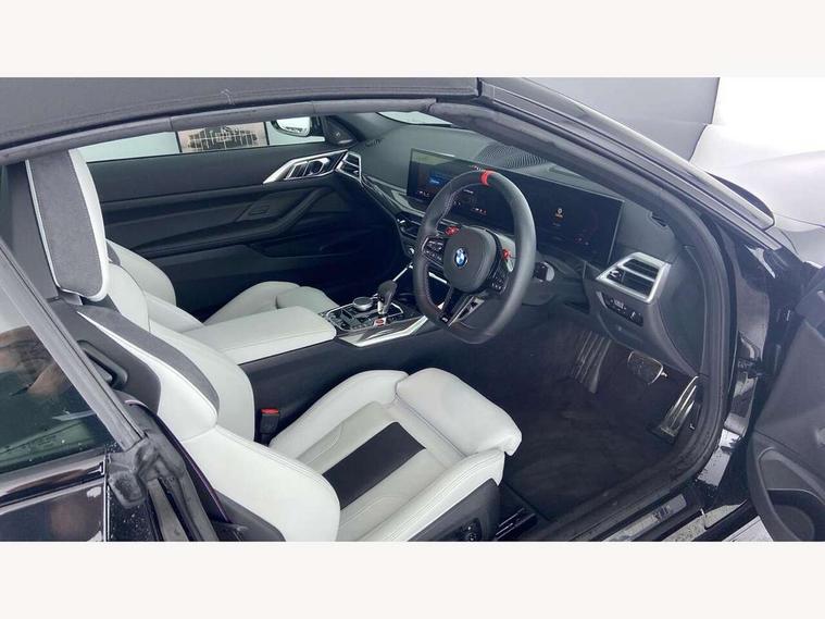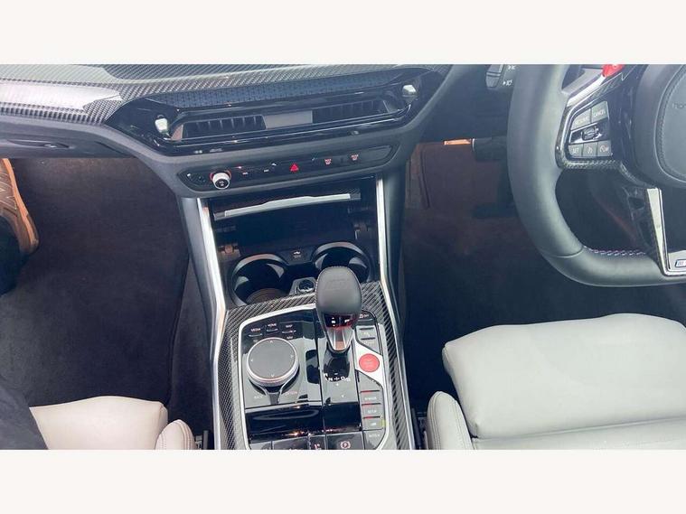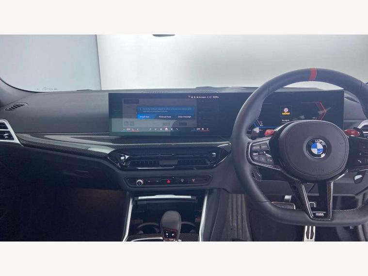 Active Guard, Automatic start/stop system, BMW ConnectedDrive online services, BMW legal emergency call, BMW Live Cockpit Pro with Head up display including 12.3" instrument display and 14.9" high resolution control display with navigation function, BMW Teleservices, Brake pad wear indicator warning light, Condition based service, Cruise control with braking function, Door/boot open warning light, Electric Power Steering (EPS) with Servotronic, Language version English, Lights on warning, M drive buttons, Oil sensor for level and grade, warning by check control system, Oil temperature gauge, On board computer, On board diagnostics, Optimum shift indicator, Outside temperature display, Park distance control, Pull away assistant, Run flat indicator, Service interval indicator, Shifting point display, Smartphone integration, Speed limiter, Start/stop button in red, Variable sport steering, Double joint spring strut front axle, M Adaptive suspension, M Drive Professional including track mode, laptimer, traction control & Drift analyser, M Sport differential, Safety battery terminal clamp, Sport automatic transmission with gearshift paddles, Auxiliary point for auxiliary devices, DAB radio with bluetooth music capability, Harman kardon surround sound audio system, Personal eSim, Acoustic laminated side glass, Auto dimming driver's door mirror, Automatic headlights + automatic windscreen wipers, Automatic parking function on front passenger's exterior mirror, Black chrome exhaust tailpipes, Black model designation badges, BMW high gloss shadow line with extended contents, BMW radiator grille, frameless, with horizontal double blind slats, black high-gloss, with model badge, Body colour bumpers, Bonnet and tailgate badge, Carbon fibre reinforced plastic (CFRP) roof, Day time running light, Door mirror integrated indicators, Dynamic brake lights, Electric adjustable heated door mirrors, Electric folding door mirrors, Electrochromic exterior driver side mirror, Electrochromic interior rear view mirror with automatic anti-dazzle function, Entry sills with aluminium inserts and model badge, Extended Stroage, Follow me home headlights, Front and rear bumper system, Front and rear plastic apron in vehicle colour, Front door sill strips in aluminium inlays with M4 inscription, Front electric windows with open and close fingertip control, anti trap facility and comfort closing, Headlight beam throw control, Heated washer jets, High gloss black lower bumper edges, side sills and diffuser edge binding, LED tail lights with 3D L-shaped LED light design, M designation, Mirror glass aspheric on driver's side, convex on passenger side, Rain sensor, Rear boot, Rear fog lights, Rear reflectors, Reversing light, Roof fin and roof trim strips in Black high-gloss, Shark fin roof aerial, Strakes in front side panel, black matt/high-gloss black, with model badge, Third brake light, Visible VIN plate, Welcome lighting, 2 cupholders in front centre console, 2 cupholders in rear armrest, 2 rear head restraints, 2 x 12 V Power sockets (luggage compartment and front centre console), 2 x USB Type C ports for charging and data transmission in front centre console, 40:20:40 split folding rear 2 seat bench with loading system, Ambient inside door handle light, Ambient lighting for storage compartment, Ambient lighting front and rear, Anthracite headlining, Battery in luggage compartment, Centre console armrest with storage compartment, Contour lighting for door trim, Driver/passenger sunvisors with ticket holders + illuminated vanity mirrors, Driving experience mode switch, Dual zone automatic air conditioning, Dynamic ambient interior lighting, Electric front seats + driver memory, English handbook, Floor mats in velour, Front and rear door exit lights, Front door storage bins with bottle holder, Front footwell ambient lighting, Front interior light, Front isofix attachment + airbag deactivation, Front reading light, Front seat backrest width adjustment, Front/rear door armrests, Heated front seats, Height adjustable front headrests, Illuminated bow-type door handles in vehicle colour, driver's side with door lock, Interior mirror lighting, Isofix on 2nd row seats, Lockable/illuminated glovebox, Luggage compartment lighting, Multifunction steering wheel, Rake/reach adjustable steering wheel, Single front passenger seat, Storage compartment in rear doors, Storage tray and compartment with cover in centre console, Through loading system, Toolkit located in luggage compartment, Waterfall lighting for central air vent, Wireless charging tray, Connected package professional - M4, Extended storage pack - M3/M4, High gloss shadowline exterior trim pack - M4, 4 x 3 point seatbelts, ABS/EBD, Automatic Stability Control (ASC), Brake energy regeneration, Brake fade compensation, Compound structure brake discs, Cornering brake control (CBC), Crash sensor, Curtain airbags, Driver/Front Passenger airbags, Dry braking, Dynamic brake control, Dynamic stability control + (DSC+), Dynamic Traction Control - DTC, Electromechanical parking brake, Electronic differential lock control (EDLC), Front and rear head airbags, Front seat side impact airbags, Front seatbelt pretensioners + load limiters, Hill start assist, M Sport seat belts, Seat occupancy detection for driver and passenger side, Seatbelt warning, Side impact protection, Two tone horn, Tyre pressure sensor, Warning triangle and first aid kit, Centre lock switch, Closing system with central locking, Electronic immobiliser, Locking wheel bolts, Remote central locking, Thatcham cat 1 remote alarm, Vehicle Key with 4 buttons including the integrated key, Galvanic embellisher for controls, Tyre repair kit,