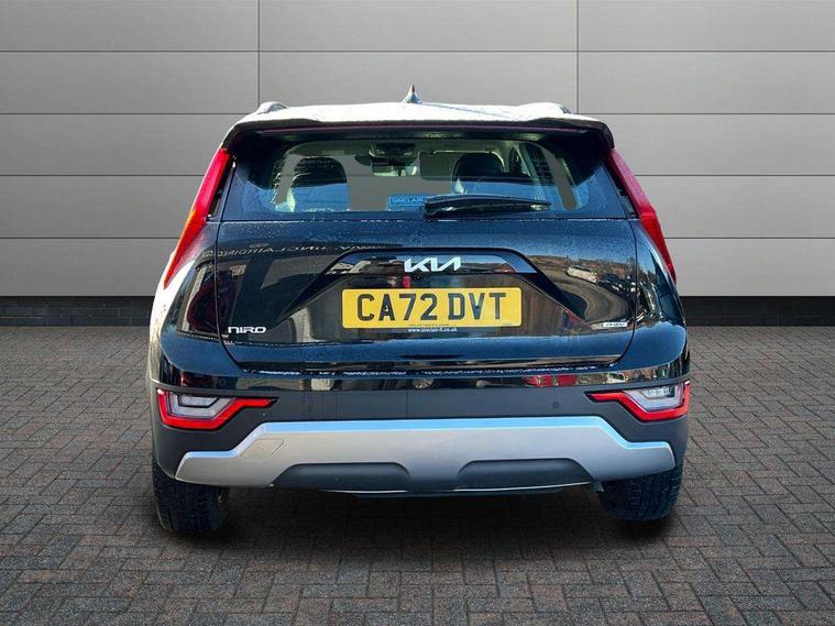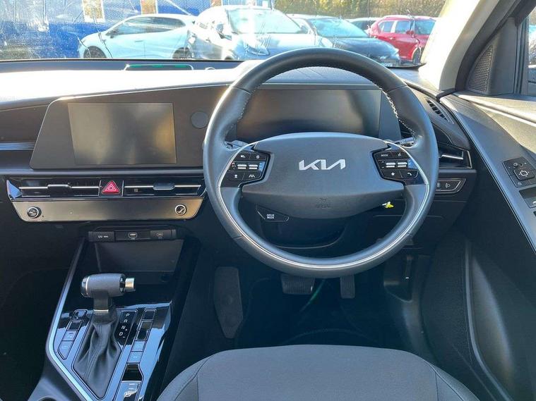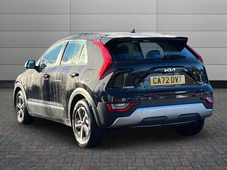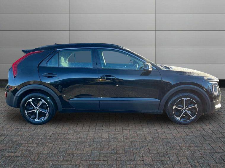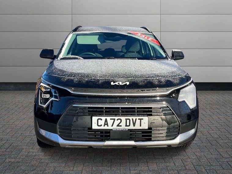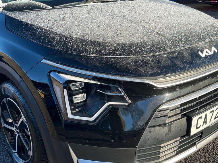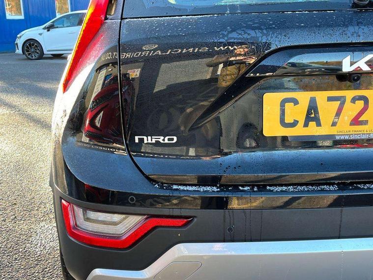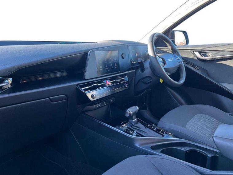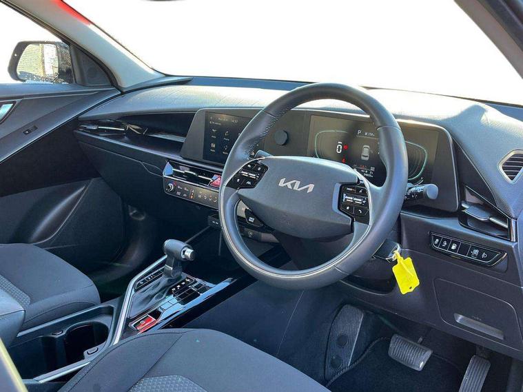 4.2" supervision colour cluster display, 8" touch screen, Adaptive smart cruise control function (SCC) with stop and go, Apple car play/Android Auto with voice control, Drive mode select (Eco, sport), E-call, Emergency stop signalling system, Forward Collision-Avoidance Assist (FCA) 1.5 - City/Pedestrian/Cyclist/Junction turning, Lane Following Assist (LFA), Lane keep assist, Motor driven power steering, Rear parking sensors, Reversing camera with dynamic guide lines, Speed limit assist, Tailgate, Trip computer with distance/fuel consumption/average speed, Sports H-Matic Automatic, 'Shark fin' mobile antenna, 2 type C USB ports on front seats, 2 USB ports in centre console including 1 type C, 6 speakers, Bluetooth with music streaming, DAB Digital radio, Steering wheel mounted controls, Acoustic windshield, All round electric windows with drivers auto up/down function, Auto dimming rear view mirror, Automatic defog system, Automatic headlight control system, Black beltline mouldings, Black embossed cladding, Body colour bumpers, Body colour door mirrors, Body colour exterior door handles, Dual LED headlights (low and high projection), Electric heated door mirrors, Front and rear silver skid plates, Heated rear window with timer, LED daytime running lights, LED rear combination lights, LED third brake light, Manual folding door mirrors, Rain sensor, Rear fog lights, Rear side wing doors, Rear spoiler, Rear wiper, Roof rails, Solar glass rear windows and tailgate, Solar glass windscreen, Welcome and follow-me home light functionality, Windscreen Washer Level Warning, 12V socket in front, 12V socket in luggage compartment, 3 seat bench in 2nd row, 60/40 split/folding 2nd row of seats, All-round height adjustable headrests, Artificial leather centre console storage box, Artificial leather steering wheel, Bulb type overhead console lamp with sunglasses case, Centre console cupholder, Cloth upholstery, Driver seat manual adjustment, Driver/passenger sunvisors with illuminated vanity mirrors, Dual zone automatic air conditioning, Front and rear door storage, H-Matic gear selection, Illuminated glovebox, Interior door lock/unlock function, ISOFIX Child seat top tethers and anchor fixings, Luggage area lamp, Luggage area load cover, Luggage board, Metal paint interior door handles, Passenger seat height adjuster, Rear armrest, Seatback pocket - driver, Single front passenger seat, Tilt/telescopic adjustable steering wheel, Towing pack - Niro, 3 point seatbelts on all seats, ABS, Automatic unlocking of doors in case of impact, Centre side front airbags, Curtain and side airbags, Drivers knee airbag, Dual shell horn, Electric parking brake with auto hold function, Electronic stability control, Front passenger airbag deactivation, Height adjustable front seatbelts, Hill start assist control (HAC), Manual rear child locks, Rear seat alert system, Traction control, Tyre pressure monitoring system, Alarm system and engine immobiliser, Deadlocks, Locking wheel nuts, Remote central door locking with fold away key, Visible vehicle identification number, Warranty - 7 Years/ 100, 000 miles, Graphite paint centre fascia, 16" alloy wheels, Tyre mobility kit,
