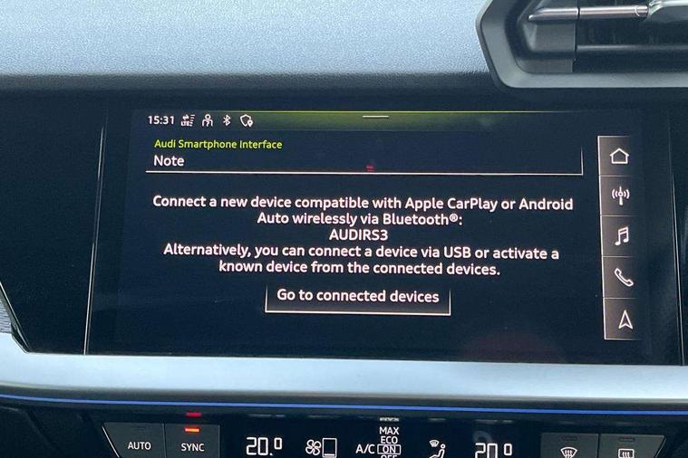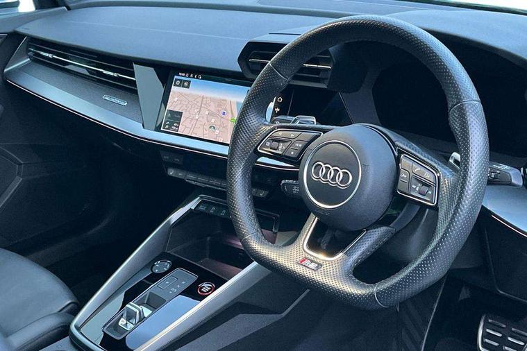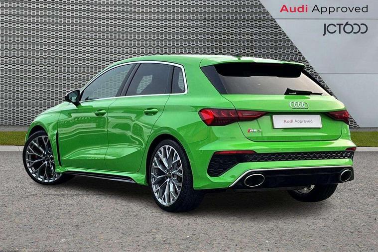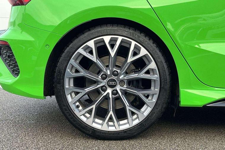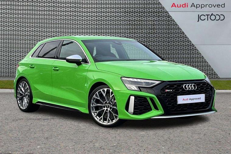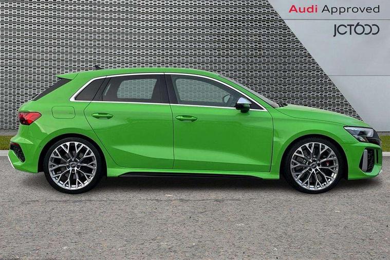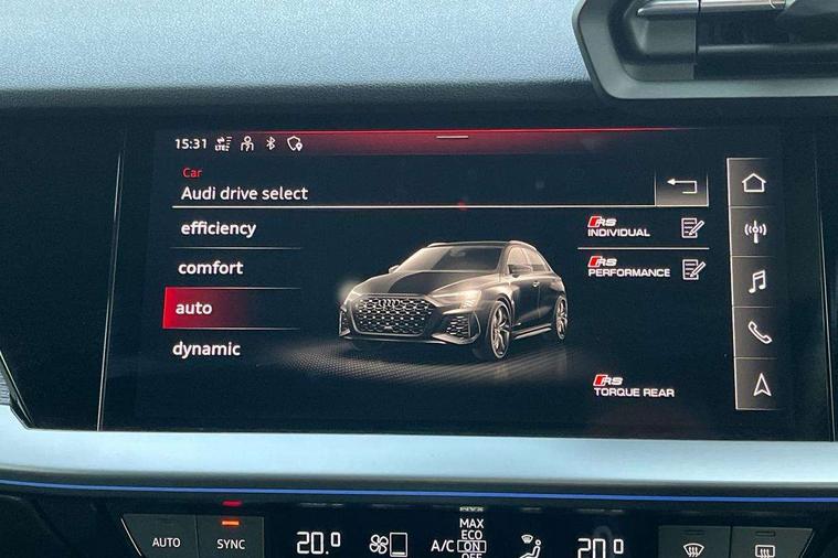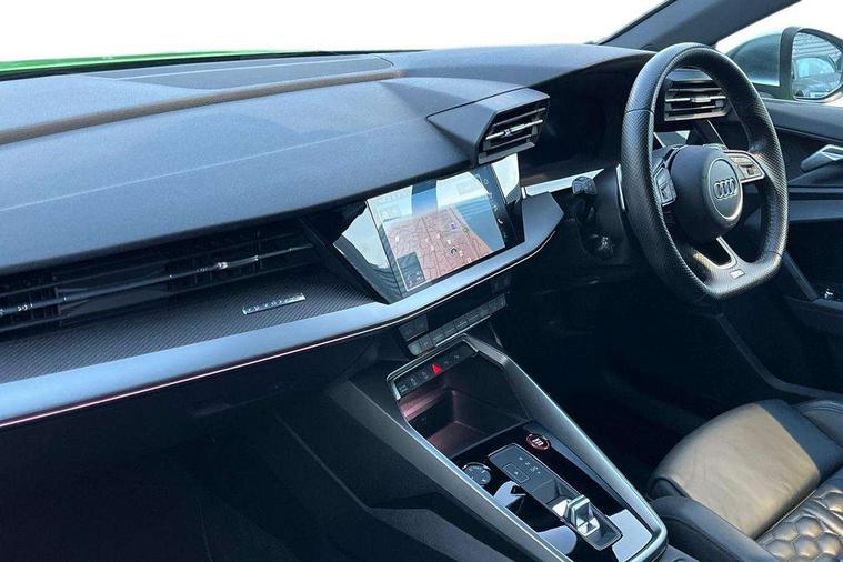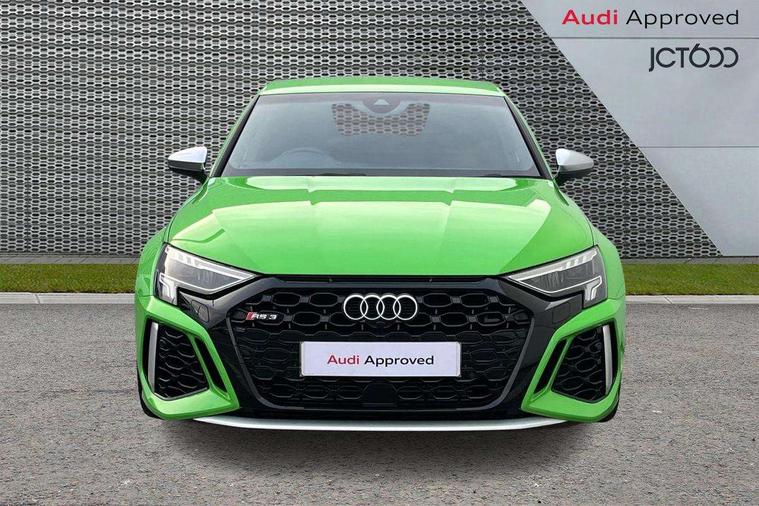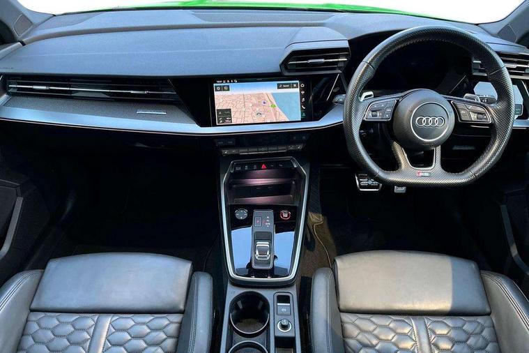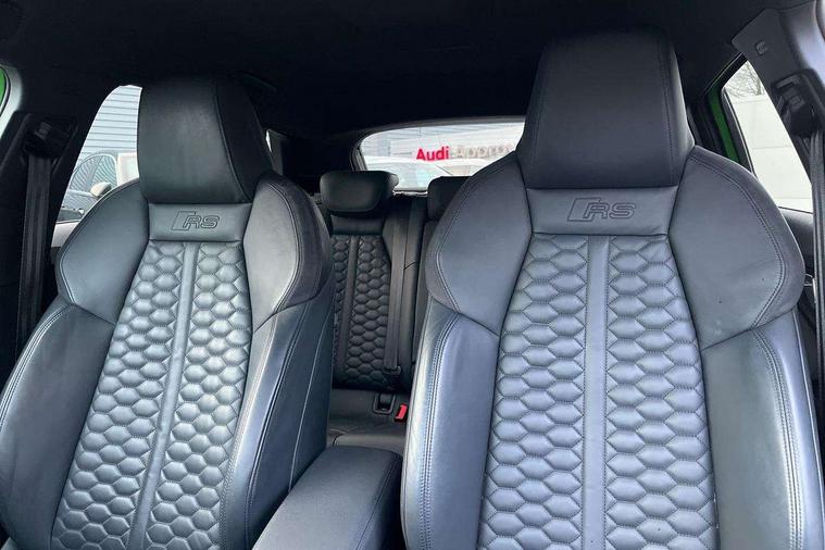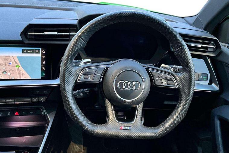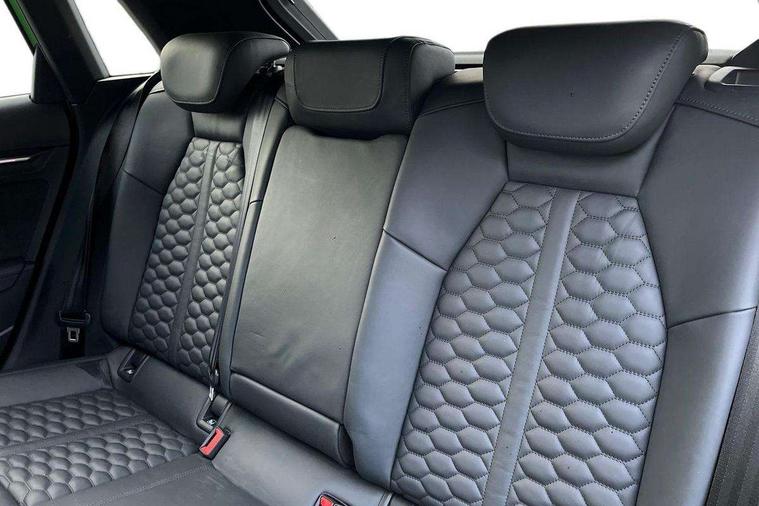 Audi connect emergency call and service, Audi smartphone interface, Audi virtual cockpit with RS specific display 12.3" full colour digital instrument cluster, Automatic start/stop system with recuperation, Bluetooth interface, Collision avoidance assistant, Lane departure warning system, Legal emergency call, Manual boot opening, Parking assist with parking system plus, Progressive power assisted steering, Quattro permanent four wheel drive, Rear suspension, Audi sound system impressive sound with 10 loudspeakers including centre speaker and subwoofer, 6-channel amplifier with a total output of 180 watts, DAB Digital radio, 3rd brake light, Acoustic glass windscreen, Audi beam uses LEDs to project the Audi sport logo onto the ground as you exit your RS 3, Auto dimming rear view mirror, Black side skirts, Body colour roof, Door mirrors - electrically adjustable, heated, folding and auto dimming on both sides, Headlight washers, LED headlights with LED rear lights + dynamic rear indicators, Light and rain sensors, Matt aluminium door mirrors, Matt aluminium window trims, Privacy glass - dark tinted rear and rear side windows from B-pillar backwards, Rear window wiper and washer system, 40/20/40 split folding rear seat bench, Black cloth headlining, Dual zone electronic climate control, Front and rear headrests, Front centre armrest, Front sports seats RS embossed logo, Front/rear floor mats, Heated front seats, Honeycomb stitching and RS embossing, Illuminated door sill trims inlays in aluminium with RS 3 logo, Manually adjustable front seats, RS emblems, Stainless steel pedals and front footrest in black, Aluminium interior elements pack - RS3, Ambient lighting pack - RS3, MMI navigation plus with MMI touch - RS3, RS bodystyling - RS3, Storage Pack - RS3, 3x3 point rear seat belts, ABS/EBD, ASR, Audi pre sense front, Driver/Front Passenger airbags, EDL, ESC - Electronic Stability Control + traction control, Front passenger airbag deactivation, Front side airbags with head airbags and interaction airbag, Hill hold assist, Seat belt reminder with passenger presence detection in rear, Tyre pressure loss indicator, Warning triangle and first aid kit, Anti theft alarm, Anti-theft wheel bolts, Electronically operated child lock, Remote control central locking, Carbon inlays, accent surfaces in the dashboard and centre console in platinum grey silk effect paint finish, 19" 10 Y spoke platinum grey, gloss turned finish alloy wheels, Tool kit, Tyre repair kit,