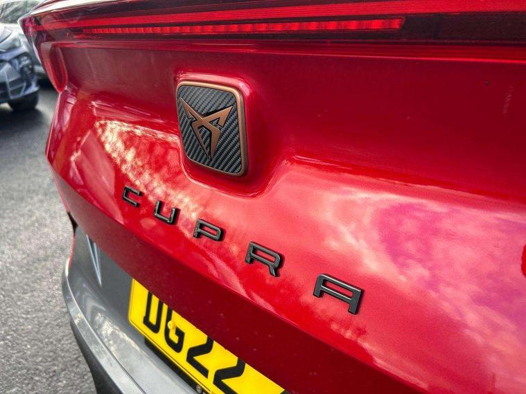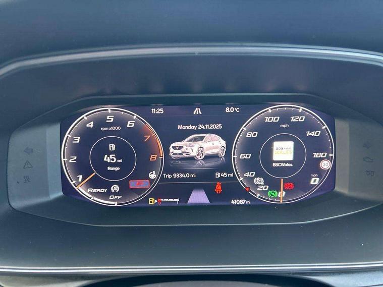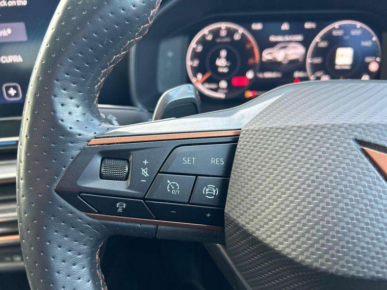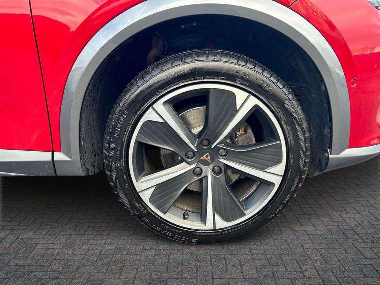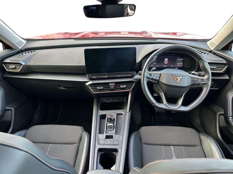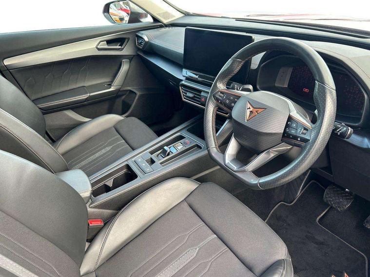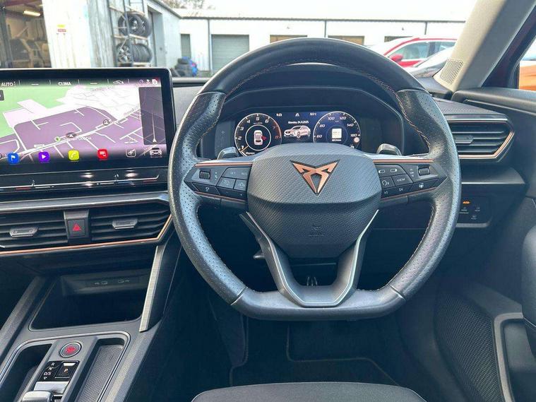 Digital cockpit and configurable dashboard, Driver alert system, Driving profile selection, E-call, Forward collision warning with automatic braking, Lane assist, Navigation system with 12'' Touchscreen Display, PAS, Predictive adaptive cruise control with speed limiter, Rear parking sensors, RPM, trip computer, outside temp gauge, instrument light brightness, low fuel warning light, lights on reminder, gearshift indicator, Service interval indicator, Start/stop system with regenerative braking, Voice control system, Wireless apple carplay, Wireless phone charger, Electronic locking differential and dynamic traction support, Standard suspension, 2 front and 2 rear USB type C sockets, Auxiliary input socket, DAB radio, Auto dimming rear view mirror, Body colour door handles, Body coloured bumpers, Dark grey wing mirror, Daytime running light with automatic headlight control and coming home feature, Dynamic headlight range control, Electric front/rear windows, Electrically adjustable, heated and folding door mirrors, Front fog lamps with cornering function, Gloss black roof rails and window surrounds, LED Headlights, LED Taillights with dynamic indicator, Rain sensing wipers, Rear diffuser with black simulated exhaust pipes, Rear side wing doors, Rear wash/wipe, Third brake light, Tinted rear windows, Welcome lights, 12v power supply in centre console, 12V socket, 12v socket in loadspace, 2 front and 2 rear reading lights, 230V socket, 3 seat bench in 2nd row, 60/40 split rear bench seat with armrest and mechanical seat release, Dust/pollen filter, Front and rear head restraints, Front centre armrest, Height/reach adjust steering wheel, Illuminated interior front door sills, Illuminated sunvisor with mirror, Interior ambient lighting, Isofix, Leather multi function heated steering wheel with gear shift paddles, Luggage tie-down hooks, Manually adjustable height and lumbar support for front seats, PVC/Cloth upholstery with copper stitching + Sport seats, Single front passenger seat, Three zone climate control with control panel in rear, Variable luggage/load compartment floor, Safety and driving pack (M) - Formentor, 3 point seatbelts on all rear seats, ABS, Brake control system - ESC and brake booster, Child proof door locks, Driver and front passenger airbags with front passenger airbag de-activation, Electronic parking brake, Front and rear disc brakes, Front side curtain airbags, Hill hold control, Seat belt reminder for front and rear seats, Tyre pressure monitoring system, Anti theft alarm system, Keyless entry and start system (KESSY), Locking wheel bolts, Copper and aluminium interior detailing,