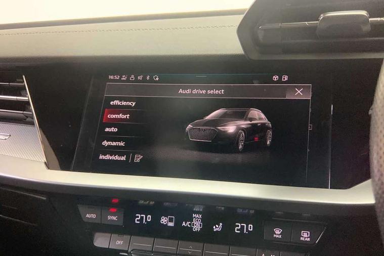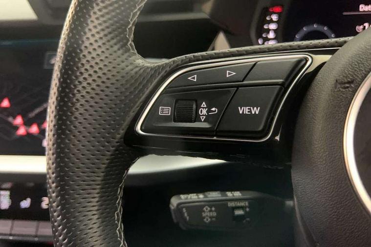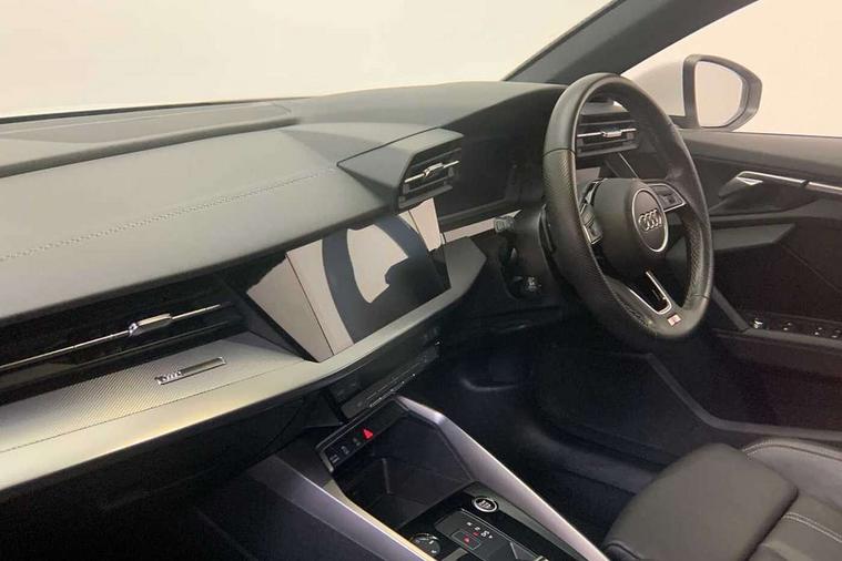 Audi drive select (Auto, Comfort, Dynamic, Efficiency and Individual), Audi smartphone interface, Audi Virtual Cockpit - 10.25" digital and colour instrument cluster, Automatic start/stop system with recuperation, Bluetooth interface, Camera based traffic sign recognition, Collision avoidance assistant, e-Call (emergency call), Electromechanical power speed sensitive steering, Lane departure warning system, MMI Navigation Plus with high resolution 10.1" colour touch screen display, Service indicator, Trip computer, Voice control system with natural language interaction, Sports suspension, 2xUSB-C connection with data and charging functions, 6 passive loudspeakers, DAB Digital radio, 3rd brake light, Acoustic glass windscreen, Aluminium window trim, Auto dimming frameless rear view mirror, Body colour exterior mirrors, Electrically adjustable/heated/folding/dimming door mirrors with kerb view includes integrated LED indications + kerb view function for passenger side, Front electric windows, Illuminated door sills with aluminium inserts at the front with S logo, LED daytime running lights, LED headlights with LED rear lights and dynamic rear indicators, Light and rain sensors, Privacy glass - dark tinted rear window, rear door and side windows, Rear electric windows, Rear side air outlets in grained matt black, Rear side wing doors, Rear wiper, S line bumpers, S roof spoiler, 12V socket and storage compartment in front centre console, 3 seat bench in 2nd row, 3 spoke leather multifunction steering wheel with paddle shift, 4 way electrically adjustable lumbar support for driver and front passenger, 60/40 split folding rear seat bench, Black cloth headlining, Dual zone electronic climate control, Front and rear centre armrest in artificial leather, Front and rear headrests, Front/rear floor mats, Height and reach adjustable steering wheel, Interior lighting - glove compartment light and right hand side, Luggage compartment floor covering, Manual boot compartment lid, Manually adjustable front seats, Seat side bolsters, Single front passenger seat, Stainless steel pedals and front footrest in black, Twin leather upholstery with front sports seats S embossed logo, Aluminium interior elements pack - A3 Sportback, LED interior lighting pack - A3 Sportback, S line styling pack - A3 Sportback, 3x3 point rear seat belts, Driver and front passenger airbag with passenger airbag deactivation, Electronic Stabilisation Control (ESC) including ABS, ASR and EDL, First aid kit with warning triangle and 2 safety vests, Front side airbags with head airbags and interaction airbag, Pre-sense front with pedestrian and cyclist detection, Seatbelt monitoring, Tyre pressure loss indicator, Anti theft alarm, Anti-theft wheel bolts, Electronically operated child locks, Immobiliser, Remote control central locking, Dark spectrum aluminium inlays, accent surfaces in the dashboard and centre console in platinum grey silk effect paint finish,