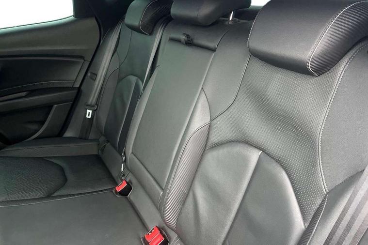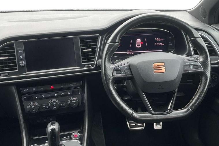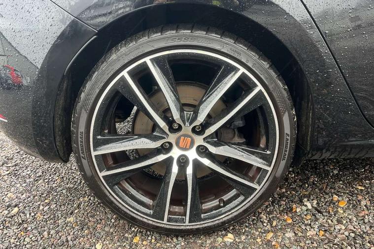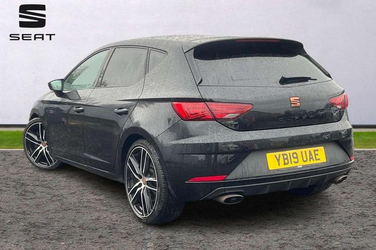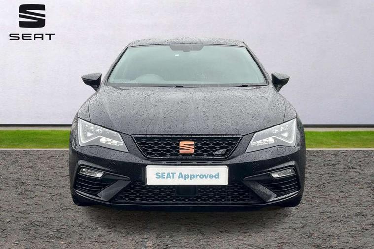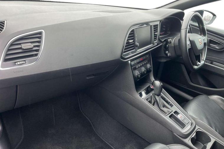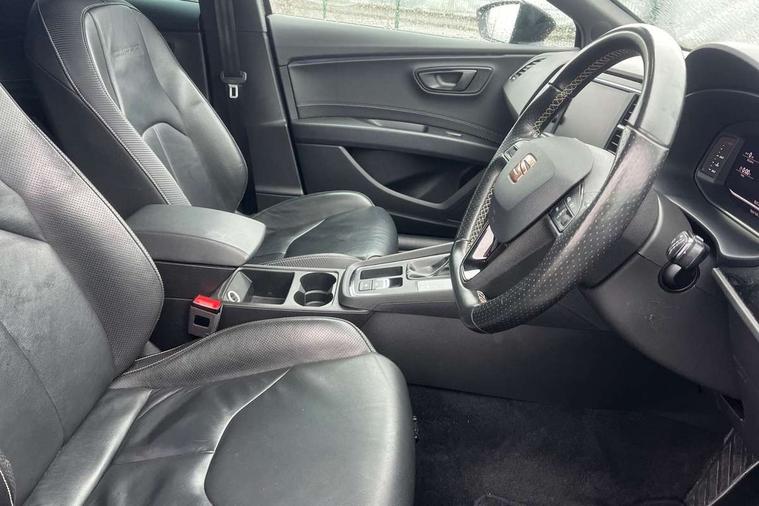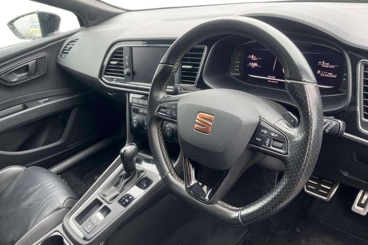 'Lights On' Reminder warning buzzer, 3D map display, 8" touch screen, Bluetooth Handsfree Phone Connection, CUPRA performance interface, Digital cockpit, Electro-mechanical progressive power assisted steering, Front and rear parking sensors, Front assist with pedestrian protection, Full Link Smartphone Integration with Mirror Link, Apple Car Play, Google Android Auto, Low fuel warning light, Navigation system (incl. media system plus), Outside temperature gauge, RPM counter, SEAT Drive profile CUPRA, SEAT logo boot release, Service interval indicator, Trip computer, Voice recognition, Wireless Smartphone charger, Dynamic chassis control, Lowered suspension, Mechanical limited slip differential, XDS electronic differential lock, 2x SD card slot, 4 USB, 8 Speakers, Auxiliary input socket, Bluetooth audio streaming, CD player, DAB Digital radio, High resolution colour driver display, Media system plus (incl. media system colour), SEAT USB media cable, Steering wheel mounted audio/phone controls, Black radiator grille, Body colour door handles, Body coloured bumpers, Dark tinted rear windows, Electric front/rear windows, Electrically adjustable door mirrors, Electrically foldable exterior mirrors with parking position and passenger-side mirror with lowering function, Exclusive Cupra front and rear bumpers, Gloss black exterior mirrors with integrated LED indicators, Heated door mirrors, High gloss black finish B and C pillars, High gloss black front grille surround, Illuminated aluminium front door sill with CUPRA logo, LED front fog lights, LED headlights with LED day time running lights + LED rear lights + LED number plate lights, LED rear fog light, Rear wash/wipe, Visible dual exhaust pipes, 12v power point in centre console, 60/40 split folding rear seat with armrest, Active front headrests and 3 rear headrests, Additional heating and ventilation outlet in rear of centre console, Black roof lining, Boot storage net, Cargo rings in boot, Driver and passenger seat height adjust, Driver and passenger sun visor, covered and illuminated mirror, driver sun visor with card holder, Driver seat lumbar adjustment, Dual zone climate control, Dust/pollen filter, Electric adjust driver's seat, Flat bottomed perforated leather steering wheel with white stitching and CUPRA logo, Front adjustable head restraints, Front armrest with storage box, Front cupholders x 2, Front seatback storage pockets, Front sport seats in leather, Front/rear floor mats, Gear shift indicator, Height/reach adjust steering wheel, High centre console with integrated box & cup holder, rear air outlet, with armrest in front seats, Illuminated door sills, Instrument lighting with brightness control, Interior copper and black detailing, Luggage tie-down hooks, Multi-colour ambient interior lighting, Passenger seat lumbar adjust, Pedals with Aluminium Cover, Rear top tether child seat ISOFIX attachment, Steering wheel gearshift paddles, Winter pack - Leon, 3 point seatbelts on all rear seats, 7 airbags - 2 front, 2 front side, 2 curtain, 1 knee, ABS + TCS, Child proof door locks, Electric handbrake, Electronic parking brake with auto hold, ESC with switch off key, ESC with tyre pressure warning indicator, ESP+EBA, Front and rear black brake calipers with cupra logo, Front seatbelt pretensioners, Front seatbelt reminder, Hill hold control, Manual passenger airbag deactivation function, Multi-Collision braking, 2 folding remote keys with window open/close function and boot opening/door mirror folding function, Central locking fuel filler cap, Engine immobiliser, Keyless entry and go, Locking wheel bolts, Remote central locking + deadlocks, Volumetric alarm with back up horn, Gloss black interior detailing, 19" Cupra Machined alloy wheels 30/2,