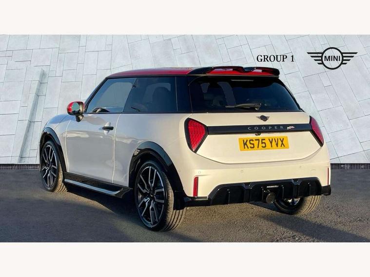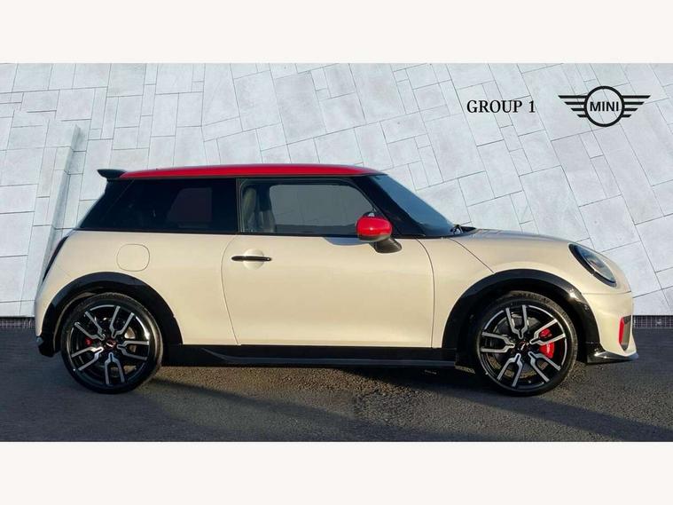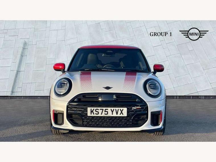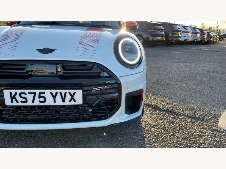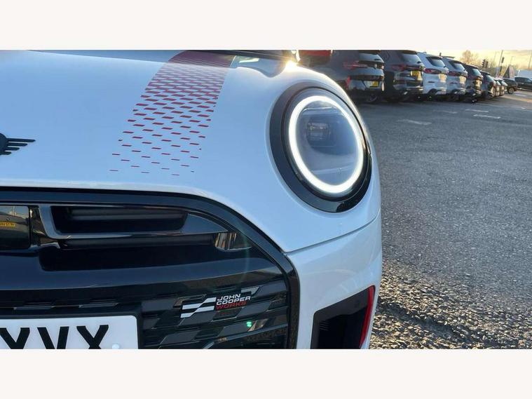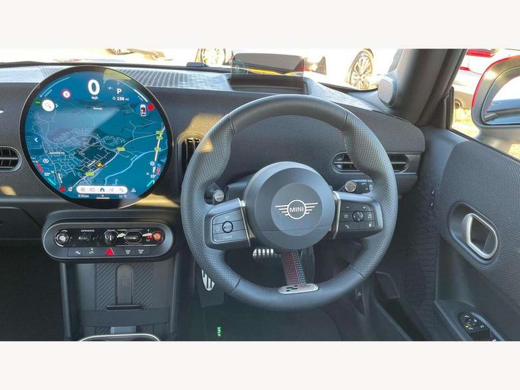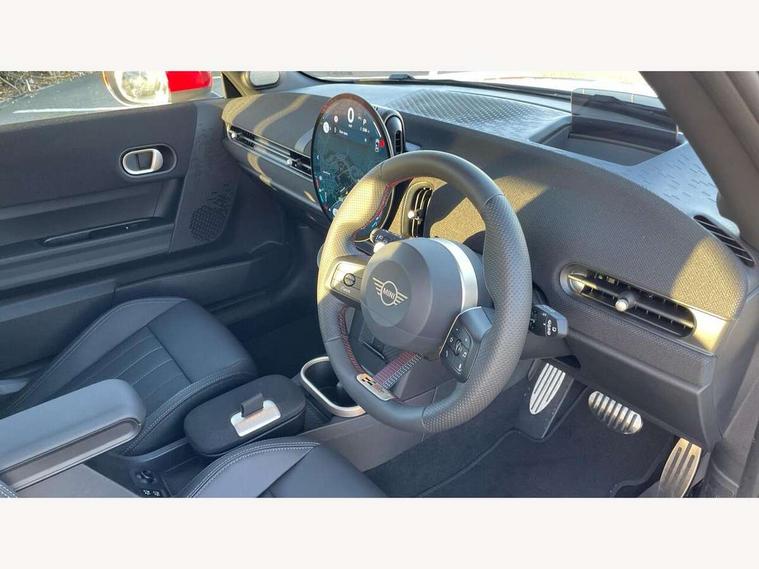 Central toggle bar, Circular OLED Screen, Compatible mobile phone bluetooth with audio streaming, Cruise control, Digital instrument cluster, Electro-mechanical speed dependant steering assistance, Emergency call service, Gaming controller with intelligent personal assistant voice update, JCW bespoke experience mode, Mini navigation system, On board computer, Service interval indicator, Tailgate, 7 speed sport transmission with double clutch, Adaptive suspension, JCW exhaust system, DAB Digital radio, Harman Kardon sound system, Personal eSim, Rear USB charger, Auto headlights, Electric adjustable heated door mirrors, Electric front windows, Front and rear apron, Heated rear window, Heated windscreen washer jets, High gloss black wheel arches, High gloss hexagonal patterned grille surround, JCW body kit, LED 3rd brake light, LED daytime running lights, LED indicator lights, LED rear lights, Rain sensor window wipers, Rear fog lights, Rear roof spoiler with airblades, Rear window wiper, 2 seat bench in second row, 2 zone automatic air conditioning, 60/40 rear seat bench, Ambient lighting, Black lower band in high gloss, Cupholders, Dark headliner, Floor mats, Front and rear head restraints, Front compact armrest, Heated steering wheel, Height adjustable passenger seat, Lidded storage box in Black/Red knit, Luggage compartment lighting, Partially perforated vescin steering wheel with red accent, black/red decorative strap, Single front passenger seat, Stainless steel pedals, Steering wheel paddle shift, Sunvisors with vanity mirrors, Driving assistant pack - Cooper Hatchback, Level 1 pack - Mini Hatchback, Park assistant pack - Cooper Hatchback, 3 point seatbelts on all four seats, 6 Airbags - front, side, head and seat belt tensioners, Anti-lock braking system (ABS), DSC - Dynamic Stability Control, Electronic parking brake, Front and rear disc brakes, Front ISOFIX (iSize), Front passenger airbag deactivation, JCW Sport Brakes, Red brake callipers with JCW badge, Traction control, Tyre pressure monitoring system, Alarm, Immobiliser, Remote central locking, Black/Red decorative dash strap, Tyre repair kit,