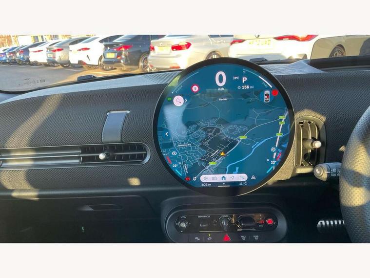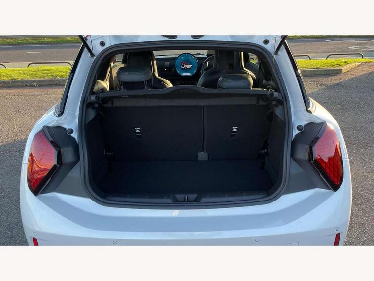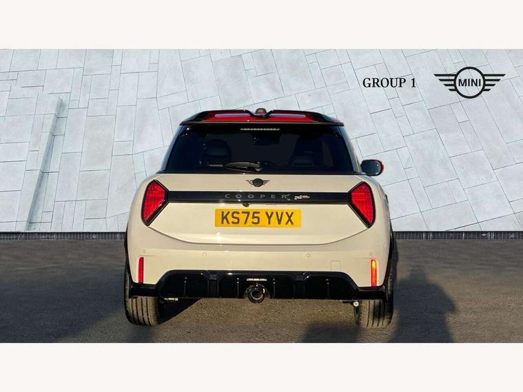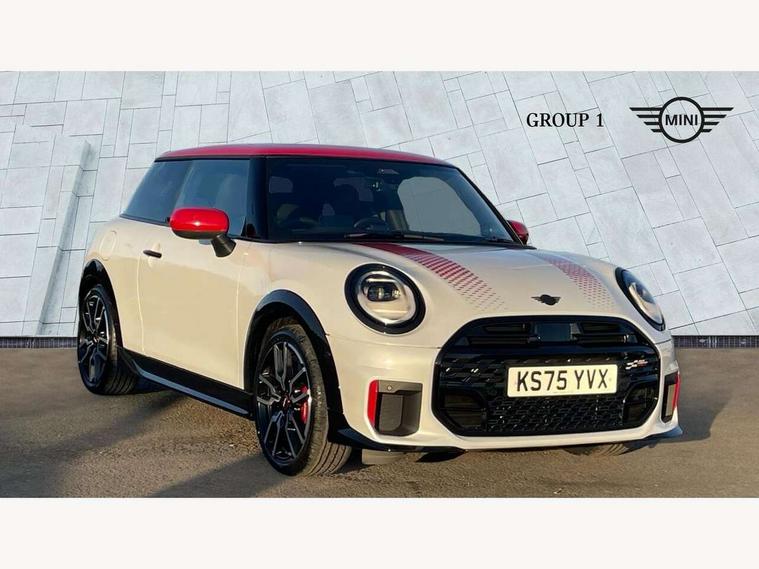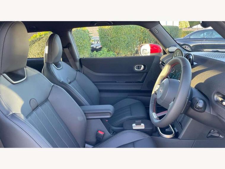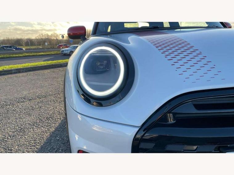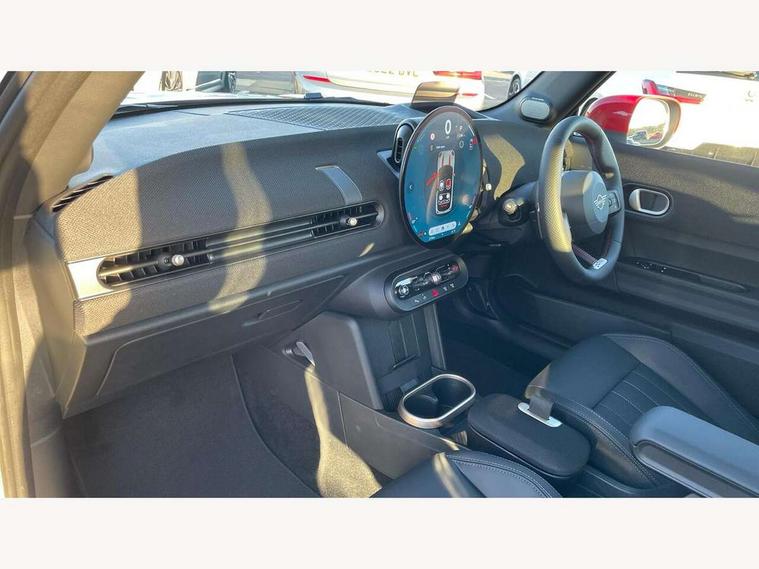 Central toggle bar, Circular OLED Screen, Compatible mobile phone bluetooth with audio streaming, Cruise control, Digital instrument cluster, Electro-mechanical speed dependant steering assistance, Emergency call service, Gaming controller with intelligent personal assistant voice update, JCW bespoke experience mode, Mini navigation system, On board computer, Service interval indicator, Tailgate, 7 speed sport transmission with double clutch, Adaptive suspension, JCW exhaust system, DAB Digital radio, Harman Kardon sound system, Personal eSim, Rear USB charger, Auto headlights, Electric adjustable heated door mirrors, Electric front windows, Front and rear apron, Heated rear window, Heated windscreen washer jets, High gloss black wheel arches, High gloss hexagonal patterned grille surround, JCW body kit, LED 3rd brake light, LED daytime running lights, LED indicator lights, LED rear lights, Rain sensor window wipers, Rear fog lights, Rear roof spoiler with airblades, Rear window wiper, 2 seat bench in second row, 2 zone automatic air conditioning, 60/40 rear seat bench, Ambient lighting, Black lower band in high gloss, Cupholders, Dark headliner, Floor mats, Front and rear head restraints, Front compact armrest, Heated steering wheel, Height adjustable passenger seat, Lidded storage box in Black/Red knit, Luggage compartment lighting, Partially perforated vescin steering wheel with red accent, black/red decorative strap, Single front passenger seat, Stainless steel pedals, Steering wheel paddle shift, Sunvisors with vanity mirrors, Driving assistant pack - Cooper Hatchback, Level 1 pack - Mini Hatchback, Park assistant pack - Cooper Hatchback, 3 point seatbelts on all four seats, 6 Airbags - front, side, head and seat belt tensioners, Anti-lock braking system (ABS), DSC - Dynamic Stability Control, Electronic parking brake, Front and rear disc brakes, Front ISOFIX (iSize), Front passenger airbag deactivation, JCW Sport Brakes, Red brake callipers with JCW badge, Traction control, Tyre pressure monitoring system, Alarm, Immobiliser, Remote central locking, Black/Red decorative dash strap, Tyre repair kit,