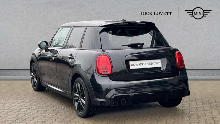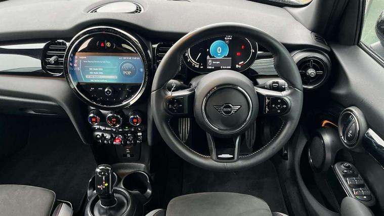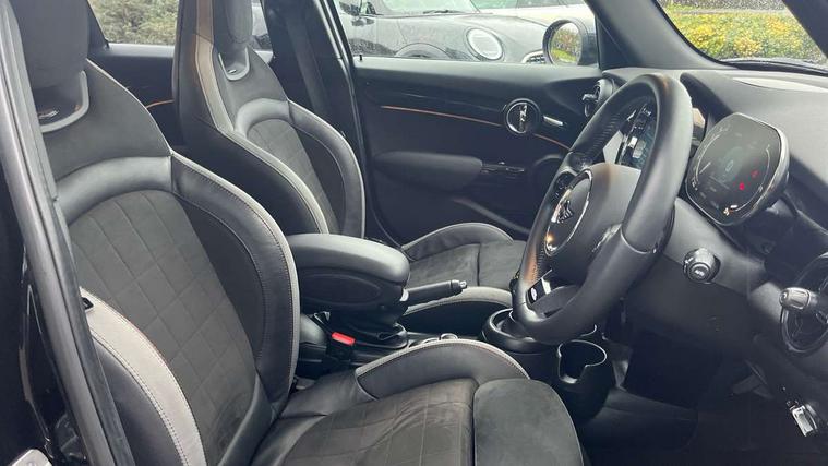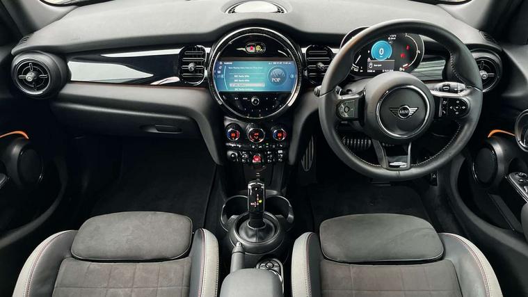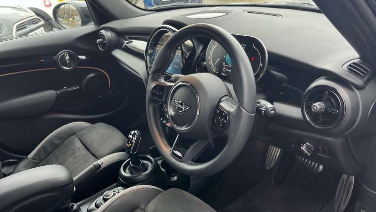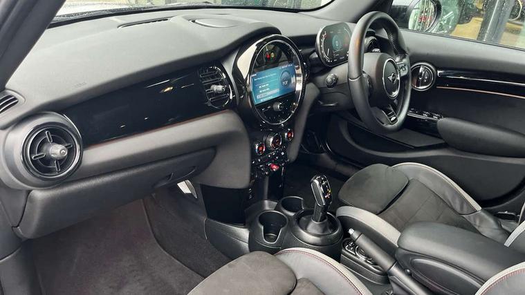 Apple CarPlay, Automatic start/stop function with brake energy recuperation, Compatible mobile phone bluetooth with audio streaming, Electro-mechanical speed dependant steering assistance, Flexible car sharing preparation, MINI Driving Modes - centre toggle switch to control driving setting (sport, mid and green), Mini E-call, MINI TeleServices, On board computer, Rear park distance control, Service interval indicator, Adaptive suspension, Double Vanos system, Fully variable valve control, Gear change indicator display, High precision injection, Performance Control, Steptronic transmission with double clutch, 8.8" touchscreen with LED ring, FM tuner and DAB digital radio, 3rd brake light, Automatic headlight activation switch, Body colour fuel filler cap, Chrome border high gloss black slats radiator grille, Dynamic brake lights, Electric front+rear windows, Exhaust tailpipe on left with chrome finisher, Heated rear window, Heated windscreen washer jets, JCW Aerodynamic kit - Front and rear bumpers with sporty JCW styling and part-painted side sills with MINI John Cooper Works door sill finishers, John Cooper Works rear spoiler, Metal door sill strips with MINI imprint, Model logo Cooper on right of tailgate, Rain sensor window wipers, Rear fog lights, Rear LED lights with union jack design, Rear side wing doors, Rear window wiper, Side scuttle panel with integrated indicator, Sun/heat protection glass, White indicator lenses, 12V Accessory socket in centre console, 3 seat bench in 2nd row, 4 lashing eyes in luggage compartment, 60/40 split folding rear seat, Anthracite headliner including grab handles and clothes hooks, Carbon black colour line - Knee roll and door armrest, Chrome interior highlights, Cupholders, Front and rear isofix with front passenger airbag deactivation, Front and rear velour floor mats, Glove compartment, Height and length steering column adjustment, Interior lighting with 12 different colours across the dashboard, underneath door bezel with illuminated laser-engraved design on central display, JCW Sport seats with integrated headrests, adjustable thigh support and John Cooper Works logo, Leatherette gearshift lever and handbrake gaiters, LED reading lights, vanity mirror lights, front foot well light and spotlight on front seats, Mechanical seat adjustment - forward/back & backrest for front seats and driver seat height adjust, Multifunction steering wheel, Single front passenger seat, Storage compartments in doors, Sunvisors with vanity mirrors, Walknappa leather steering wheel with grey seam and John Cooper Works badge on Piano Black lower steering wheel spoke, Piano black exterior pack - Mini Hatchback Cooper, 3 point seatbelts on all five seats, 6 Airbags - front, side, head and seat belt tensioners, Anti-lock braking system (ABS), Child locks on rear doors, DSC - Dynamic Stability Control, Front and rear disc brakes, Hill start assist, Single tone fanfare horn, Tyre pressure monitoring system, Alarm system with tilt sensor, monitoring doors, bonnet interior and tailgate, Electronic vehicle immobiliser, Start/stop toggle with keyless go, Piano black interior trim, Tool kit,
