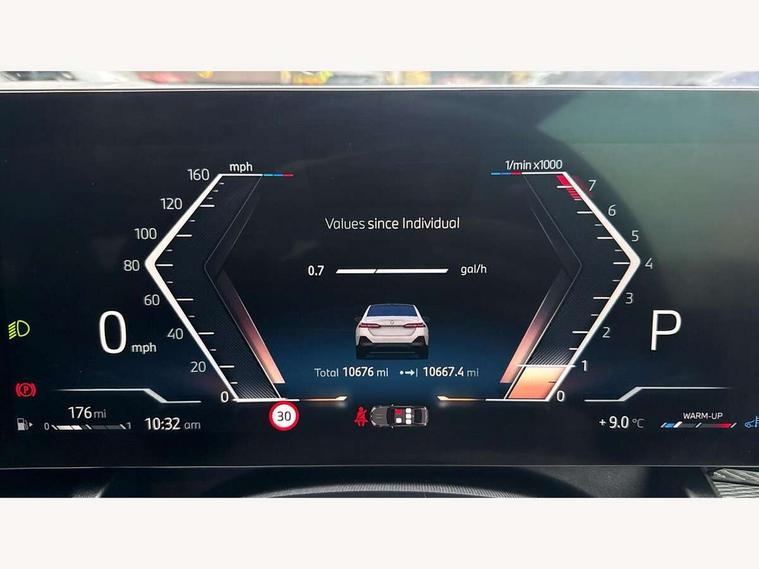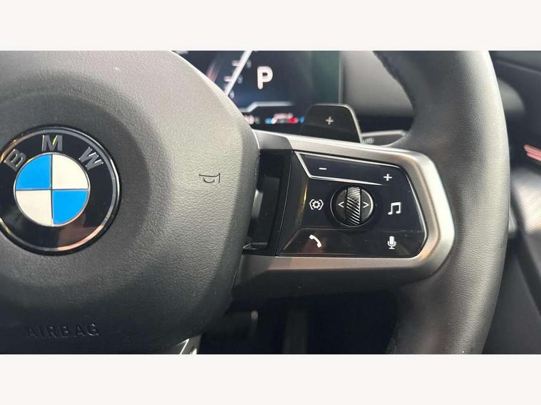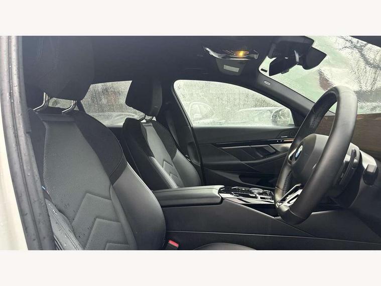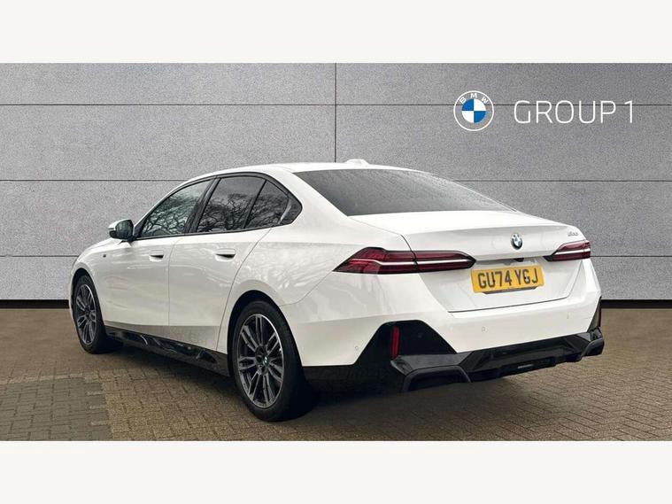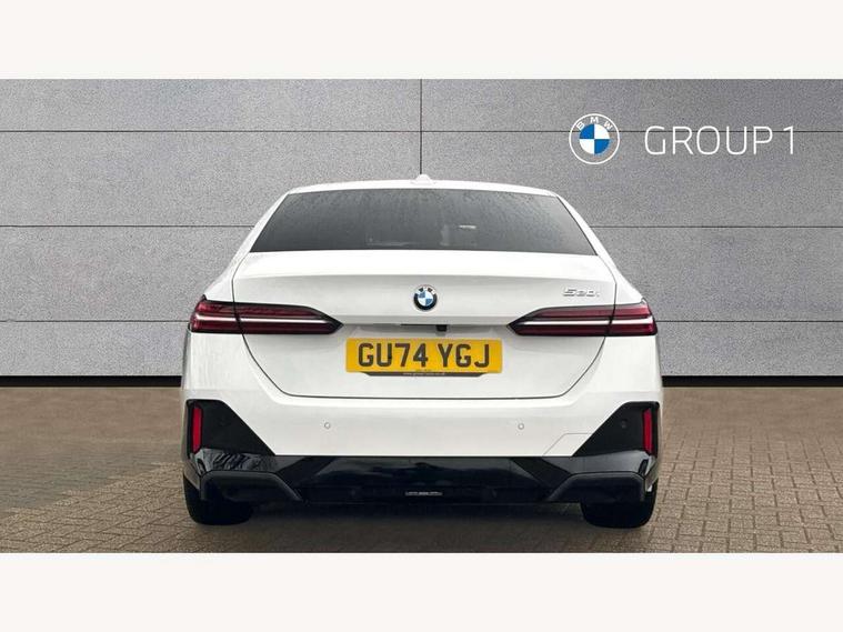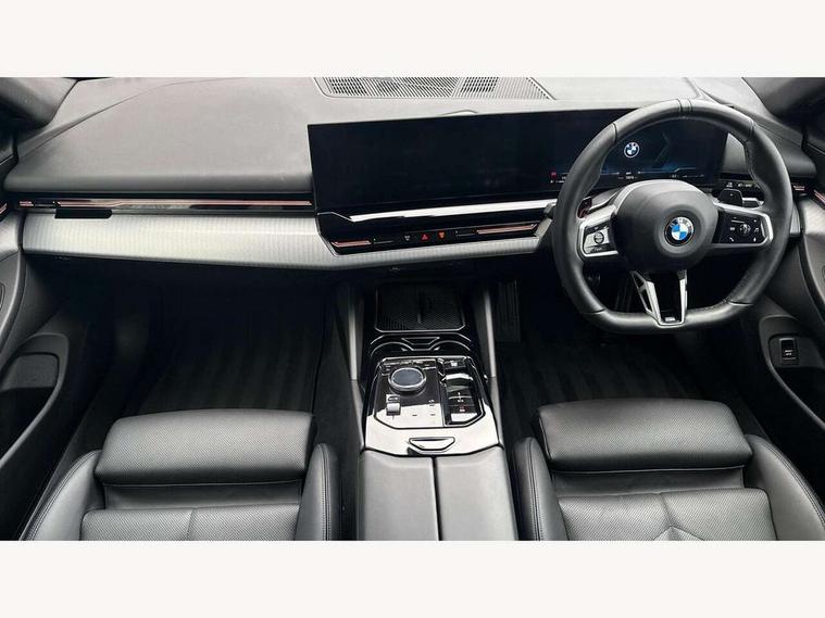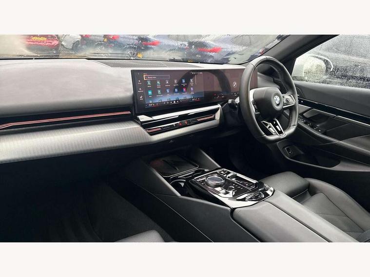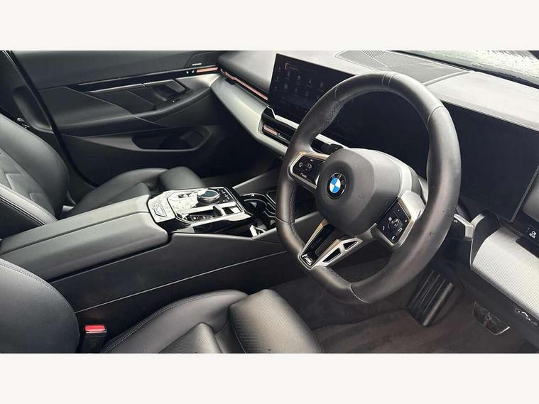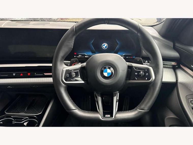 BMW ConnectedDrive online services, BMW legal emergency call, BMW Teleservices, Brake pad wear indicator, Cruise control with brake assist, Driving Assistant Plus Preparation, Front collision warning with brake intervention, Lane departure warning with active return, Left turn warning with brake function, Multifunctional instrument panel, Oil sensor for level and grade, On board computer inc. average speed, fuel consumption, liquid crystal Info display, journey computer, outside temperature display, personal profile, On-board diagnosis - OBD, PAS, Powered by Operating System 7.0, Run flat indicator, Service interval indicator, Speed limit Info with manual speed limit assist, Stop/start button, 8 speed automatic steptronic transmission with gearshift paddles, DAB tuner, Acoustic glazing, Adaptive LED Headlights, Automatic cornering lights, Automatic windscreen wipers and automatic headlight, BMW selective beam, Body colour door handles, Body coloured bumpers, Dynamic brake lights with LED technology, Electric adjustable door mirrors, Electric front and rear windows with fingertip open/close + anti-trap facility and comfort closing function, Follow me home headlight function, Headlight elements in blue, Heated windscreen washer jets, LED daytime running lights, LED third brake light, Light colour close to that of ordinary daylight, Optimum, homogeneous illumination of the road, Rear boot, Rear side wing doors, 2 zone automatic air conditioning, 3 seat bench in 2nd row, 3 spoke leather M steering wheel in BMW M specific design with M badge, Armrest - front and rear integrated door trim, centre console includes storage compartment, rear centre includes 2 cupholders, Child seat ISOFIX attachment with rear outer seats includes top tether, Electric adjustable front sports seats, Electric adjustable steering column, Electrically adjustable lumbar support for driver and front passenger, Heated driver and front passenger seats, M Anthracite headlining, M Sport pedal covers in stainless steel, Rear headrests, Single front passenger seat, Through loading system with 40/20/40 rear seat backrest split, Velour floormats, Wireless charging tray, Ambient lighting pack - 5 Series/I5, Connected package professional - 5 Series/I5, Driving assistance pack - 5 Series/I5, Expanded exterior mirror package - 5 series/I5, M high gloss shadow line pack - 5 Series/ I5, M Sport exterior styling pack - 5 Series/I5, 3 rear three point seatbelts, Active protection, Airbag deployment is controlled with respect to the intensity and scope, Anti-lock braking system (ABS), Brake assist, Brake energy regeneration, Cornering brake control (CBC), Crash sensor activating central locking release, hazard warning lights, fuel cut off and interior lighting, Driver and front passenger airbags, Driver central airbag, Driver/front passenger side airbags, DSC - Dynamic Stability Control, Dynamic brake control, Dynamic Traction Control - DTC, Electromechanical parking brake with automatic drive away release and auto hold function, Electronic brake force distribution, Engine drag torque control, Front and rear brake discs with interior ventilation, Front and rear curtain airbags, Front head restraints with anti-whiplash, Head airbags for first and second row seats, Hill start assist, Locking of doors after driving off, M Sport brakes in dark blue metallic painted brake callipers with M designation, Mechanical child proof lock on rear doors, PC iBrake PostCrash approach control warning with light braking function, Side impact protection, Trailer stability control, Two tone horn, Tyre pressure monitoring system, Warning triangle and first aid kit, Alarm system, Locking wheel bolts including wheel bolt adapter, Tyre repair kit,