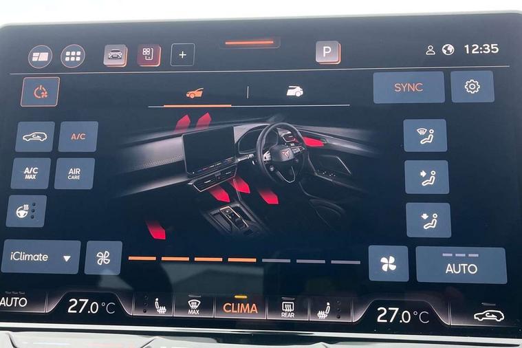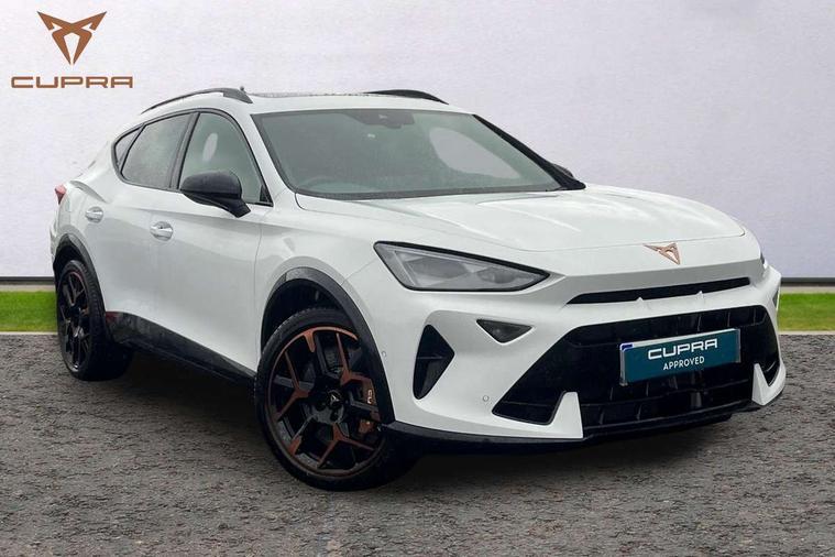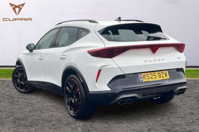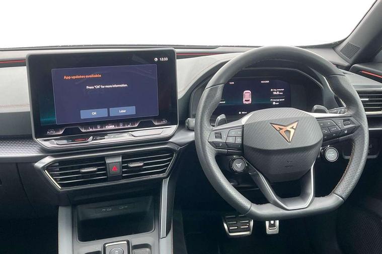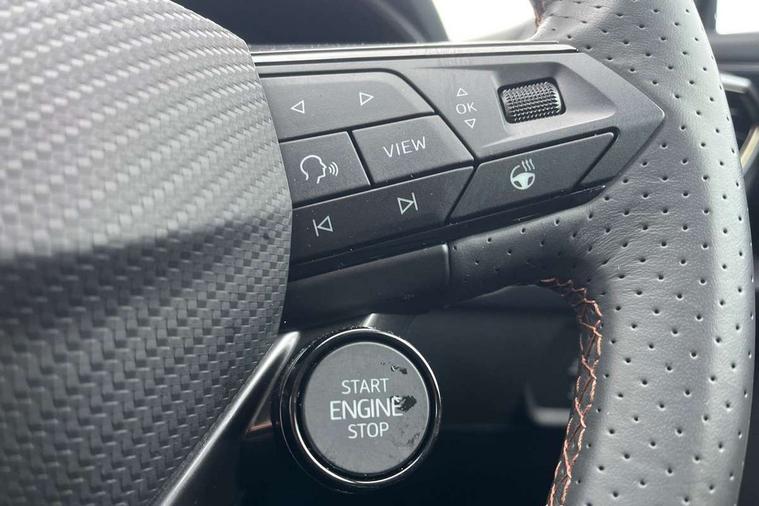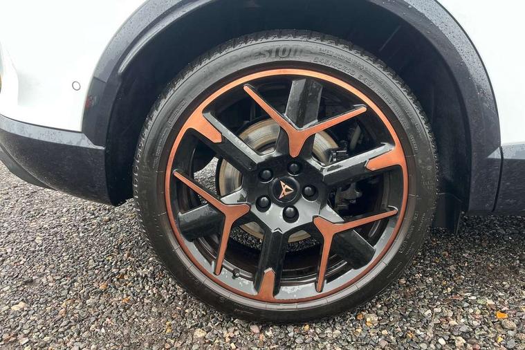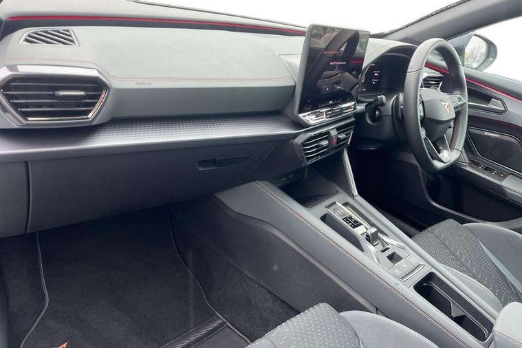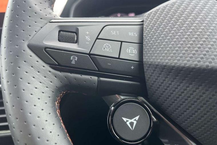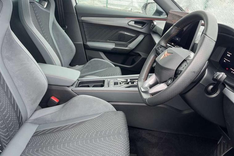 10.25" digital cockpit and configurable dashboard, Adaptive cruise control with follow-to-stop and speed limiter, Advanced driver alert system, Advanced lane assist with semi-automatic vehicle control in a medical emergency and traffic jam assist, Dynamic chassis control with driving profile selection (Comfort, Sport, CUPRA, Individual), Dynamic road sign display, Emergency steering support with turn assist, Forward collision warning with automatic braking, Full link phone integration, Intelligent park assist, RPM, trip computer, outside temp gauge, instrument light brightness, low fuel warning light, lights on reminder, gearshift indicator, Service interval indicator, Side and exit assist, Speed sensitive power steering, Start/stop system with regenerative braking, Top view camera, Virtual pedal and electric tailgate, Voice control system, Wired Android Auto, Wireless apple carplay, Wireless phone charger, Adaptive chassis control with continuous operation, CUPRA sport suspension, Electronic locking differential and dynamic traction support, 2 front and 2 rear USB type C sockets, Immersive by Sennheiser TM - 10 speakers, 1 central speaker, 1 subwoofer, Media system with navigation, 12.9" touchscreen display, voice control, DAB, steering wheel mounted controls, Auto dimming rear view mirror, Black roof spoiler, Body colour door handles, Body coloured bumpers, Dark grey wing mirror, Daytime running light with automatic headlight control and coming home feature, Door panel ambient lighting, Dynamic headlight range control, Electric front/rear windows, Electrically adjustable heated and folding door mirrors with memory function, Gloss black roof rails and window surrounds, High beam assist, LED 3rd brake light, LED front fog lamps with cornering function, LED Taillights with dynamic indicator, Matrix LED headlights with multifunction camera, Rain sensing wipers, Rear diffuser with twin exhaust pipe on each side, Rear fog lights, Rear side wing doors, Rear wash/wipe, Side skirts, Tinted rear windows, Welcome lights (within exterior mirror housing), 12V socket, 2 front and 2 rear reading lights, 3 seat bench in 2nd row, 60/40 split rear bench seat with armrest and mechanical seat release, Black headlining, Black interior roof lining, Cupra sports pedals, Dust/pollen filter, Electrically adjustable front seats with lumbar support and memory function, Front and rear head restraints, Front centre armrest, Heated front seats, Heated supersports multifunction leather steering wheel with satellite buttons and gear shift paddles, Height/reach adjust steering wheel, Illuminated aluminium doorsteps, Illuminated interior front door sills, Illuminated sunvisor with mirror, Isofix, Leather dashboard, door insert and side trim panel, LED smart wraparound lighting, PVC/Textile upholstery + cup bucket seats, Satellite steering wheel, Single front passenger seat, Three zone climate control with control panel in rear, Variable luggage/load compartment floor, 3 point seatbelts on all rear seats, ABS, Akebono brakes, Brake control system - ESC and brake booster, Child proof door locks, Driver and front passenger airbags with front passenger airbag de-activation, Driver and front passenger knee airbag, Electronic parking brake, Hill hold control, Performance brakes with front brembo calipers, Pre-crash front and rear seat belt tensioner, window closure and hazard lights, Public e-call, Seat belt reminder for front and rear seats, Side airbag for front and rear with curtain airbags, Tyre pressure monitoring system, Anti theft alarm system, KESSY Advanced - Keyless start, keyless entry with SAFELOCK, Locking wheel bolts, Copper and aluminium interior detailing, 19" Hailstorm forged machined R black and copper alloy wheels, Breakdown and tool kit,