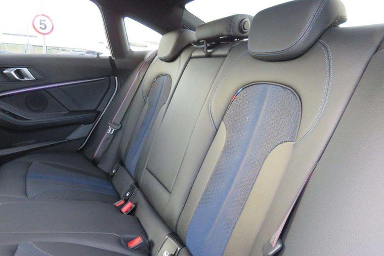 Active guard plus, Attentiveness assist, Auto start-stop, Bluetooth hands free facility with USB audio interface + WiFi interface for wireless connection of mobile terminal devices + audio streaming, BMW Intelligent Personal Assistant, BMW Live Cockpit Professional with 10.25" high resolution instrument and control display, BMW Online services, BMW operating system with 7.0 mid interface, BMW Teleservices, Check Control warning system for monitoring of lights and door/luggage compartment open warning, Cruise control with braking function, iDrive controller with touch function and 7 short cut favourite buttons on centre console, Integrated navigation data with map data via USB +features such as 3D landmarks and micro city models, Integrated owners handbook, Intelligent voice assistant, Lane departure warning system, M Sports steering, On board computer - average speed+fuel consumption, service interval, clock/date, odometer/trip meter, outside temperature display and ice warning, Optimum shift indicator, Personal Profile, Pull away assistant, Speed limiting function, Aluminium lightweight construction, Balancer shaft, Double VANOS, Drive performance control with ECO PRO comfort + sport mode, Dual clutch automatic transmission, Electronic differential lock, High precision injection, M Sport suspension with stiffer spring/damper set-up and vehicle lowered by 10mm + twin tube gasfilled shock absorbers and Anti roll bars, Performance Control, Petrol Particulate Filter, VALVETRONIC engine management, 2x USB Type C ports (for charging and data transfer), 4G LTE Connectivity with hard wied 4G network sim card, DAB digital radio, MP3 players and RDS double tuner, Automatically dimming rear view mirror, Body colour door handles, Body colour mirror caps, Chrome 'M' logo side designation, Chrome exhaust single tailpipe, round, Direction indicator side lights integrated exterior mirrors, Electric windows - front and rear, with open/close fingertip control and trap release, Exterior mirrors - electrically folding with anti-dazzle, Fading support, Follow me home headlights, Front and rear bumper system with replaceable deformation elements, Front door sill finishers in black plastic with M designation in metallic look, Heated, electrically adjustable exterior mirror aspheric on driver side, convex on passenger side, High gloss black B pillar finish, High gloss shadow line exterior trim, High level third brake light, LED daytime running lights, LED front fog lights, Lightweight engineering, Model designation on right side of tailgate, Preparation for high beam assistant, Rain sensor with automatic headlight activation, Rear boot, Rear fog lights, Rear side wing doors, Reversing light in rear light cluster, Welcome lighting, 12V power socket in centre console, 2 cupholders in front centre console, 3 rear seat head restraints, 3 rear seats, 3 spoke M sports design leather steering wheel finished in nappa leather with specific M badge, Anthracite finished floor mats with contrasting surround, Anthracite headlining, Automatic two zone climate control air conditioning, Child seat ISOFIX attachment for two outer rear seats and front passenger seat with anchorage points, Conditioned based service, Driver and front passenger seat heating, Front and rear door pockets including bottle trays, Front and rear side armrests integrated into door trim, Front Armrest foldable with integrated storage compartment, Front centre interior light over interior mirror and rear centre automatic interior light when door is opened/ignition switched off or via remote key, Front head restraints, Front passenger seat, Front sports seats with electric side bolster adjustment, Glove compartment, Glovebox with light, Luggage compartment lighting, Manually adjustment steering wheel column, Multi-function controls for steering wheel, Sun visors with vanity mirrors and insert tab, Through loading system with 40/20/40 split folding rear seat, Two lashing eyes, Additional interior lighting pack - 2 Series Gran Coupe, Connected pack professional - 2 Series Gran Coupe, Extended storage pack - 2 Series Gran Coupe, M Sport exterior styling aerodynamics pack - 2 Series Gran Coupe, 2 tone horn, Airbag - Front driver and passenger, front and rear head, front side, curtain head protection, manual deactivation of front passenger airbag possible, Anti lock braking system (ABS) with cornering brake control, BMW emergency call, Brake drying, Braking readiness, City braking function, Crash sensor activating of airbags, Unlocking doors, hazard warning lights, fuel cut off, interior lighting+activation of safety battery terminal clamp, Dynamic stability control + (DSC+), Dynamic Traction Control - DTC, Electrically operated hand brake, Rear brake discs, Rear child proof door locks, Seat belt security check for driver and front passenger, Seatbelt warning, Side impact protection, Three point seat belts on all seats including front belt stopper, pyrotechnic belt tensioners and belt force limiters, Trailer stability control, Tyre pressure monitoring system, Ventilated front disc brakes, Warning triangle and first aid kit, Central locking switch for all doors, fuel filler cap and luggage compartment, Deadlocking function system to all doors, Drive away locking system on all doors and luggage compartment, Locking wheel bolts, Start/Stop button (illuminated) in centre console with keyless engine start and Auto Start-Stop deactivation button, Thatcham Cat.1 alarm and immobiliser, Two remote control key with integrated key - open/close doors/fuel flap/tailgate +1 button for unlock compartment with M design high gloss black inlay, Contrast stitching on instrument panel, 18" Burnished M double spoke alloy wheels finished in orbit grey - style 819M, Reduced rolling resistance tyres,