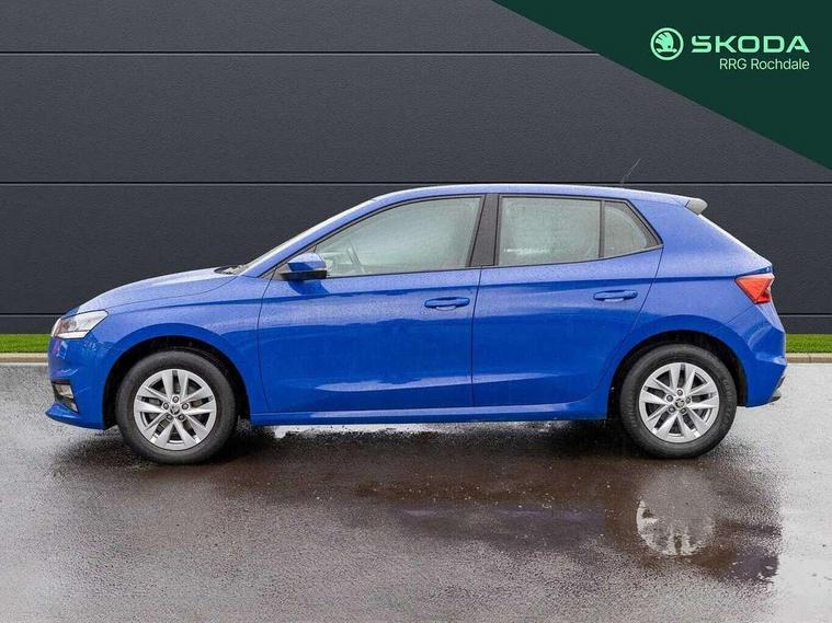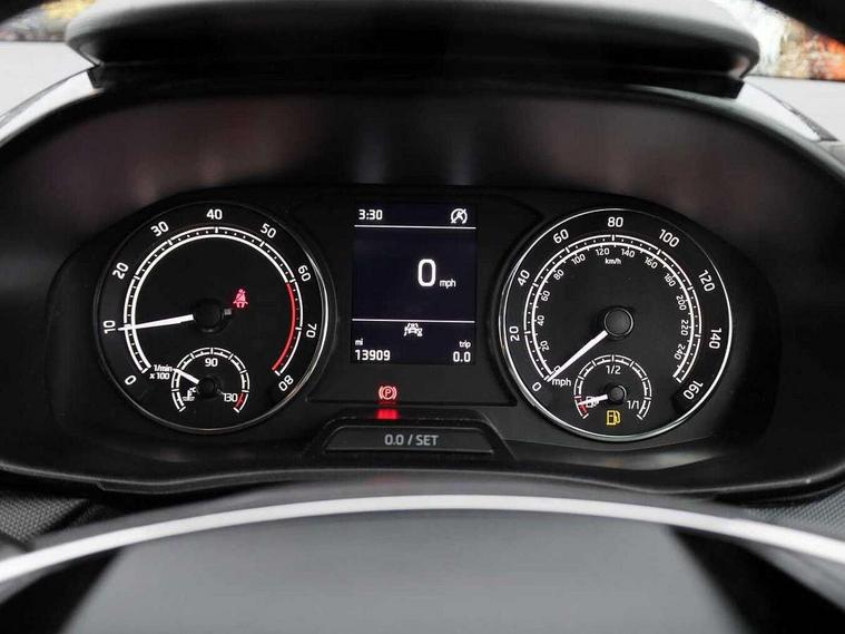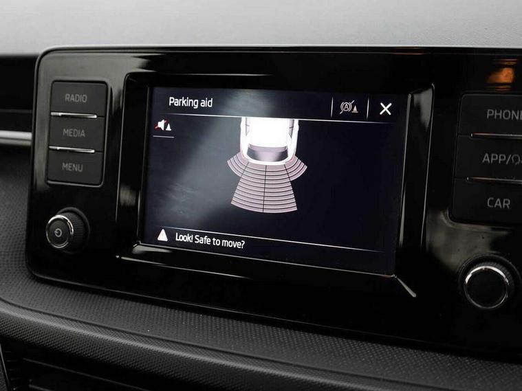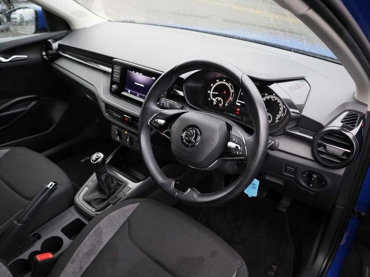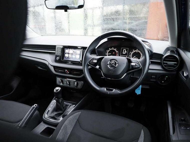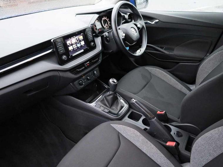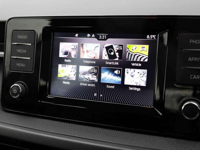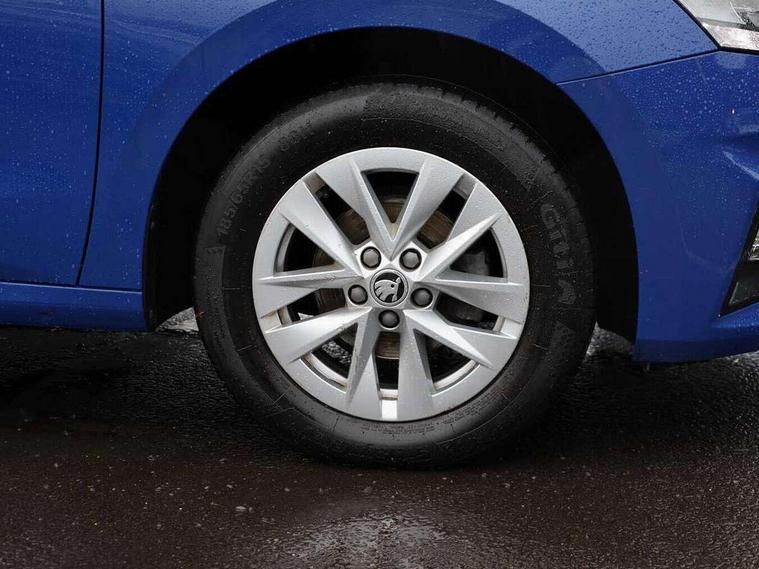 Bluetooth connection, Driver alert system - DAS, Electromechanical power steering, Exterior temperature gauge, Lane assist including road edge detection, Multifunction trip computer in black and white, Service interval indicator, SmartLink, Speed limiter, 2x USB-C in the front (for data transmission and charging), 4 speakers in front, Auxiliary socket for external MP3 player, DAB digital radio reception, Radio Swing with 6.5" colour display, Basic LED Headlights, Basic rear light, Body colour door mirrors, Body coloured bumpers, Dimming rear view mirror with black frame, Door mirror integrated indicators, Electrically adjustable and heated door mirrors, Electrically adjustable front windows with function auto up/down, Front fog lights, Front window wiper intermittent control, Headlight range control - Automatic, Ice scraper in fuel cap, LED daytime running lights with coming and leaving home feature, Mechanical adjustable rear windows, Rain sensor, Rear LED fog light, Rear side wing doors, Rear window wiper with washing nozzles, Roof mounted spoiler, SKODA tailgate lettering in chrome, Third brake light, 2 reading lights in front and 2 reading lights in rear, 2 spoke leather multifunction steering wheel, 3 rear headrests, Backrest split and folding, Central console with fixed cup holder and storage box, Chrome handbrake release button, Fabric upholstery, Gearshift knob/handle in leather, Grain satin black interior door handles, Hand brake lever handle in leather, Height adjustable front headrests, Height adjustable front seats, Height adjustable steering wheel, ISOFIX and TopTether anchorage points to the outer rear seats, ISOFIX and TopTether on the front passenger seat, Luggage compartment lighting, Manual air conditioning, Manually adjustable lumbar support in front seats, Pollen filter, Rear seat bench unsplit, Single front passenger seat, Storm grey headlining, Sun visors with mirror and airbag label on passenger side, Ticket holder, 3-point height adjustable front seats belts with pretensioner and force limiter, Automatic warning lights in case of crash, Driver and passengers airbag with switch off function, e-Call+, ESC including ABS, MSR, ASR, EDS, HBA and XDS, Front and rear seat belt warning, FRONT ASSIST (AEB City and AEB Inter Urban), Front side airbags, Head airbags, One tone horn, Pedestrian protection, Three rear 3-points safety seat belts with pretensioner and force limiter including stop function for outer rear seat belts, Tyre pressure monitoring system, Anti-theft alarm system including immobiliser, interior monitoring, backup horn, and towing protection, Central locking with radio remote control, interior controls, SAFE function and 2 foldable keys, Black painted air vents, Glossy black decorative trim, Grain satin black central console cover, Grain satin black lower decorative trim, Satin black door and side trim panel in front, Anti-theft wheel bolts protection, Super-low rolling resistance tyres,