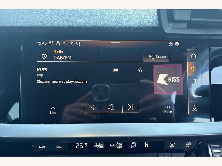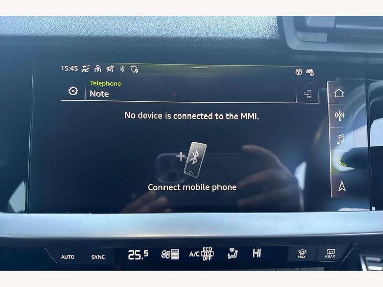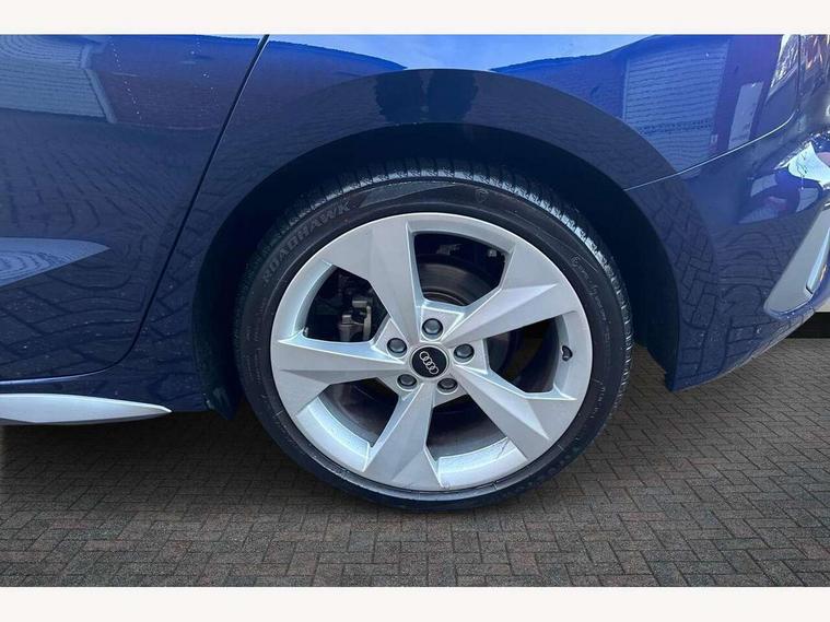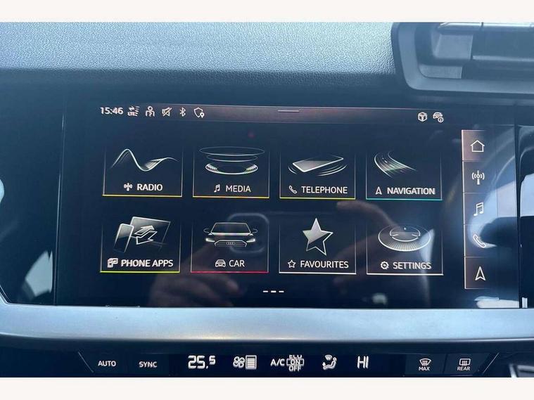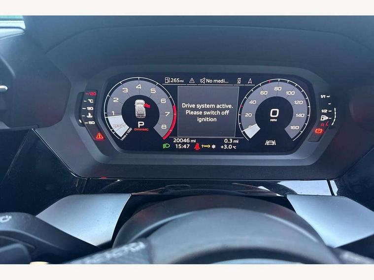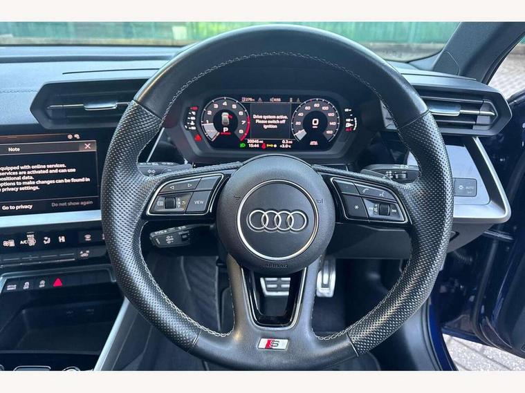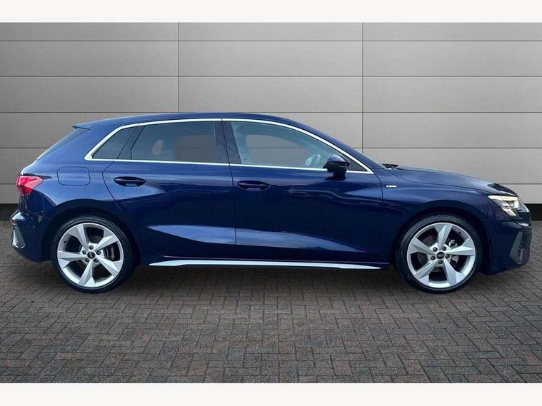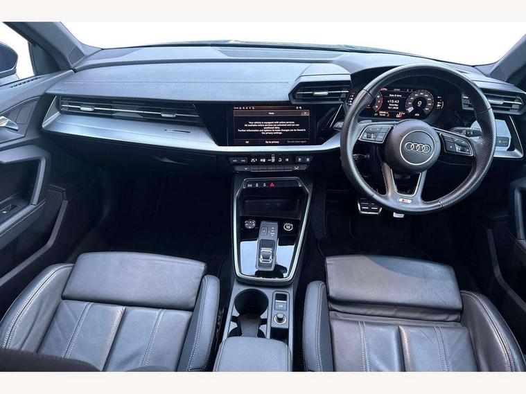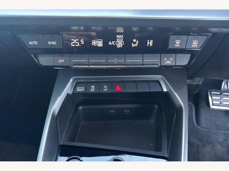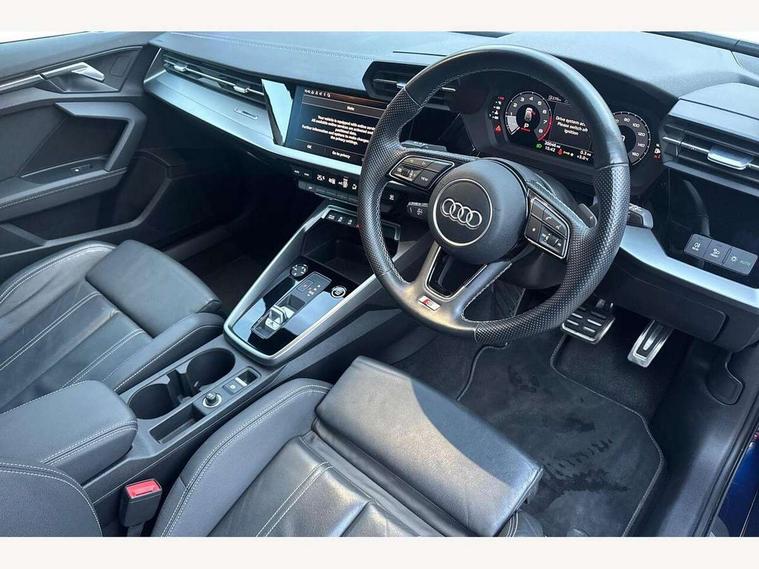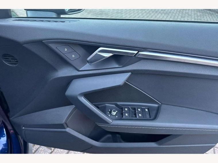 Audi drive select (Auto, Comfort, Dynamic, Efficiency and Individual), Audi smartphone interface, Audi Virtual Cockpit - 10.25" digital and colour instrument cluster, Automatic start/stop system with recuperation, Bluetooth interface, Collision avoidance assistant, e-Call (emergency call), Electromechanical power speed sensitive steering, Lane departure warning system, MMI Navigation Plus with high resolution 10.1" colour touch screen display, Service indicator, Trip computer, Voice control system with natural language interaction, Sports suspension, 2xUSB-C connection with data and charging functions, 6 passive loudspeakers, DAB Digital radio, 3rd brake light, Acoustic glass windscreen, Aluminium window trim, Auto dimming frameless rear view mirror, Body colour exterior mirrors, Electrically adjustable/heated/folding/dimming door mirrors with kerb view includes integrated LED indications + kerb view function for passenger side, Front electric windows, Illuminated aluminium inserts front door sills with S logo, LED daytime running lights, LED headlights with LED rear lights and dynamic rear indicators, Light and rain sensors, Privacy glass - dark tinted rear window, rear door and side windows, Rear electric windows, Rear side air outlets in grained matt black, Rear side wing doors, Rear wiper, S line bumpers, S roof spoiler, 12V socket and storage compartment in front centre console, 3 seat bench in 2nd row, 3 spoke leather multifunction steering wheel with paddle shift, 40/20/40 split folding rear seat bench with cupholder, Black cloth headlining, Dual zone electronic climate control, Front and rear centre armrest in leather, Front and rear headrests, Front/rear floor mats, Height and reach adjustable steering wheel, Illuminated vanity mirror, Interior lighting - glove compartment light and right hand side, Luggage compartment floor covering, Manual boot compartment lid, Manually adjustable front seats, Seat side bolsters, Single front passenger seat, Stainless steel pedals and front footrest in black, Twin leather upholstery with front sports seats S embossed logo, Aluminium interior elements pack - A3 Sportback, LED interior lighting pack - A3 Sportback, S line styling pack - A3 Sportback, 3x3 point rear seat belts, Audi pre sense front, Driver and front passenger airbag with passenger airbag deactivation, Electronic Stabilisation Control (ESC) including ABS, ASR and EDL, First aid kit with warning triangle and 2 safety vests, Front side airbags with head airbags and interaction airbag, Pre-sense front with pedestrian and cyclist detection, Seatbelt monitoring, Tyre pressure loss indicator, Anti theft alarm, Anti-theft wheel bolts, Electronically operated child lock, Immobiliser, Remote control central locking, Accent surfaces in the dashboard and centre console in platinum grey silk effect paint finish, Dark spectrum aluminium inlays,