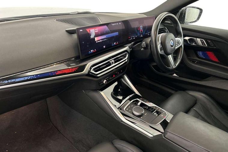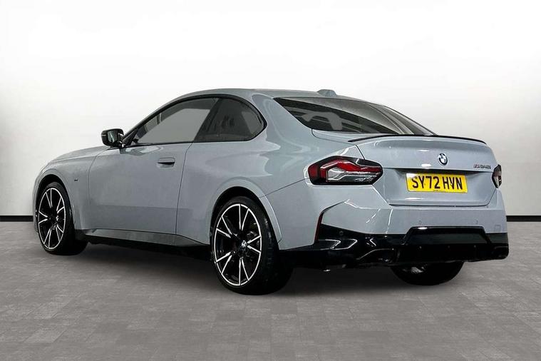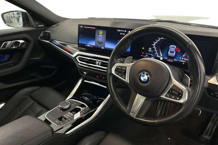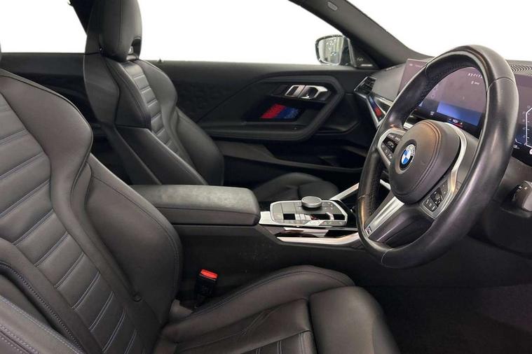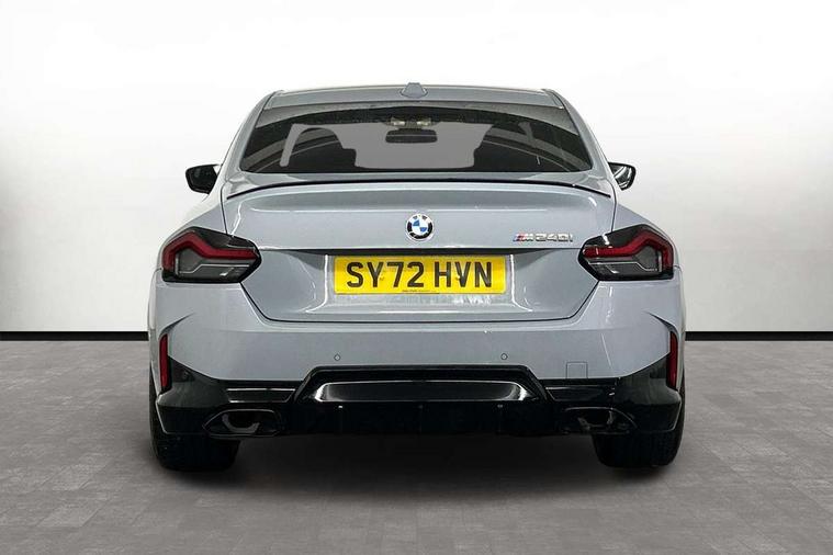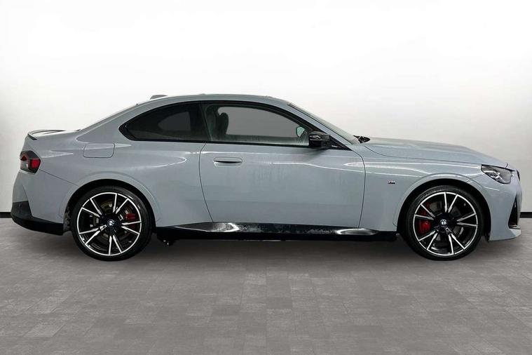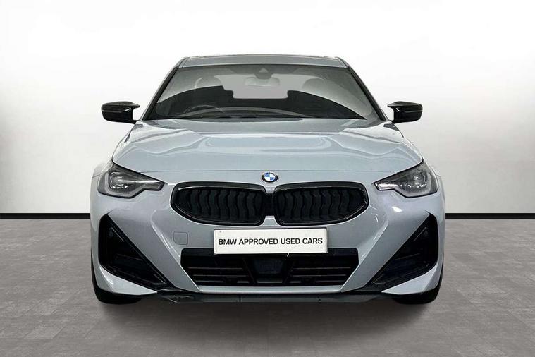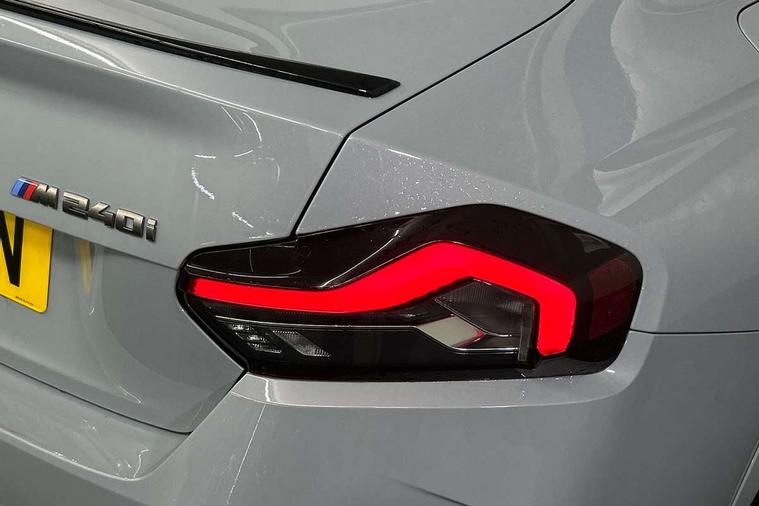 Attentiveness assist, Auto start-stop, Bluetooth, BMW ConnectedDrive online services, BMW Teleservices, Check Control warning system for monitoring of lights and door/luggage compartment open warning, Direct selection buttons, Drive off assistant, Driving experience switch with sport+ mode, Eco pro mode, Electric power steering, Front and rear parking sensors, Front/rear Parking distance control, iDrive controller with turn and press function, Integrated owners handbook, Intelligent functions, Live cockpit plus with nav function 12.3" instrument cluster and 14.9" centre display, Oil sensor for level and grade, Optimum shift indicator, Personal Profile, Touch operation on control display, Variable sport steering, Widescreen multi-media display, Aluminium lightweight construction, Balancer shaft, BMW TwinPower Turbo inline 6-cylinder petrol engine, Double VANOS, Drive performance control with ECO PRO comfort + sport mode, High precision injection, M Sport differential, Petrol Particulate Filter, Sport automatic steptronic transmission with gearshift paddles, manual gearshift time display, launch control, coasting idle ECO PRO/COMFORT modes, Twin scroll turbocharger with Valvetronic, xDrive with rear orientated application, DAB tuner, Acoustic windscreen wipers for reduced driving noise, Adaptive LED Headlights, Automatic windscreen wipers and automatic headlight, Automatically dimming rear view mirror, BMW individual lights shadow line, Body colour door handles flush with door surface, Body colour front and rear bumpers, Daytime running lights, Electric windows - front and rear, with open/close fingertip control and trap release, Exhaust tailpipes x2 - free form finisher in high gloss black in left and right, Exterior air inlets in front bumper with embellishers in high gloss black, Fading support, Flap controlled M Sport exhaust system, Front and rear bumper system with replaceable deformation elements, Front door sill finishers in black plastic with BMW designation, Front ornamental grille frame in high gloss black, Front windscreen wipers with integrated washer jets, Green tinted heat protection glazing, High beam assistant, High gloss black exterior M mirror caps, High gloss shadowline exterior trim in mirror triangle cover, mirror cover panel, mirror bezel and window border, High level third brake light, Indicators integrated int mirror housing, LED registration plate light, LED technology rear tail lights, brake lights and turn indicators, Lightweight engineering, M Sport spoiler - Gurney in body colour, Model designation and M badges in cerium grey, Model designation on right side of tailgate, Rear boot, Rear fog lights, Reversing light in rear light cluster, Shark fin antenna, Side frame decorative moulding black high gloss, Single part LED rear lights with smoked glass components, Sun protection glass, Trailer stabilisation logic, Visible VIN plate, xDrive designation on left tailgate, 12V power socket in front centre console with blanking plug, 2 cupholders in front centre console, 3 zone automatic air conditioning, Ambient lighting, Compartment in front of cupholder, Conditioned based service, Driver seat backrest width adjustment, Electric front seat adjustment with driver memory, Front and rear side armrests integrated into door trim, Front armrest, Front door pockets, Front head restraints, Front M Sport seats, Front passenger seat lumbar support, Heated front seats, Illuminated glove compartment with separate small compartment, Lumbar support for driver, M headliner Anthracite, M sport leather steering wheel, M240i badge in instrument cluster, Manually adjustment steering wheel column, Rear seat backrest with manual 40:20:40 split folding, Rear seat centre foldable armrest with integrated cup holder, Single front passenger seat, Storage compartment between rear seats, Storage tray and compartment with cover in centre console, Sun visors with vanity mirrors and insert tab, Through loading system with 40/20/40 split folding 2 rear seat in 2nd row, Two folding rear seat headrests, Velour floor mats, Vernasca leather upholstery, Additional storage compartment pack without USB - 2 Series Coupe, Connected pack professional - 2 Series Coupe, Interior and exterior mirror pack - 2 Series Coupe, M Sport exterior styling aerodynamics pack - 2 Series Coupe M240i, 2 tone horn, Anti lock braking system (ABS) with cornering brake control, Automatic Stability Control (ASC), BMW emergency call, Brake drying, Child seat ISOFIX attachment for the two outer rear seats, Crash sensor activating of airbags, Unlocking doors, hazard warning lights, fuel cut off, interior lighting+activation of safety battery terminal clamp, Deactivation of fuel pump in the event of a crash, Driver and front passenger airbags, Driver and front passenger side airbags, integrated in the door side seat backrest bolsters for all seat variants, Dynamic brake control, Dynamic stability control + (DSC+), Dynamic Traction Control - DTC, Electrically operated hand brake including automatic hold function and automatic release when driving off, Front and rear disc brakes, Front passenger airbag deactivation, Head airbags for all 4 outer seats, M seat belts, M Sport brake with red calipers, Manual deactivation of front passenger airbag, Seat belt security check for driver and front passenger, Seatbelt warning, Side impact protection, Three point seat belts on 4 seats including front belt stopper, pyrotechnic belt tensioners and belt force limiters, Tyre pressure sensor, Warning triangle and first aid kit, Alarm system (Thatcham 1) with remote control and electronic engine immobiliser, Central locking switch for all doors, fuel filler cap and luggage compartment, Deadlocking function system to all doors, Drive away locking system on all doors and luggage compartment, Locking wheel bolts, Start/Stop button (illuminated) in centre console with keyless engine start and Auto Start-Stop deactivation button, Two remote control key with