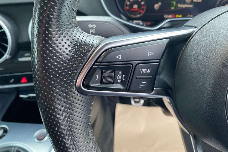 Audi active lane assist, Audi drive select, Audi virtual cockpit - 12.3" high-resolution LCD display with fully customisable instrument cluster, MMI touch panel, Mobile phone preparation with bluetooth interface, Progressive power assisted steering, Service interval indicator, Audi music interface, Auxiliary input socket, Bluetooth audio streaming, DAB Digital radio, MMI Radio with CD player and SD/XC card slot, Auto headlight range control, Automatic coming/leaving home lighting function, Body colour bumpers, Body colour door mirrors, Electric front windows, Headlight wash system, High gloss black front grille, LED daytime running lights, LED rear lights, Rain and light sensors, Rear diffuser, Retractable rear spoiler, S Line body styling, 3 spoke leather multifunction sports steering wheel, Aluminium door sill trims, Black headlining, Electric lumbar support, Front head restraints, Front passenger seat isofix location point, Height/reach adjust steering wheel, ISOFIX on outer rear seats, Perforated leather gearknob, Split folding rear seat, Top tether anchor plate for isofix child seat, 2 rear seatbelts, 3 point front seat belts, ABS, ASR traction control, Curtain airbags, Driver/Front Passenger airbags, EDL traction control, Electromechanical parking brake, ESP, First aid kit, Front passenger airbag deactivation, Front side airbags, Tyre pressure warning, Warning triangle, Anti theft alarm, Immobiliser, Keyless Start, Locking wheel bolts, Remote central locking, Matt brushed aluminium inlays, Tyre repair kit,