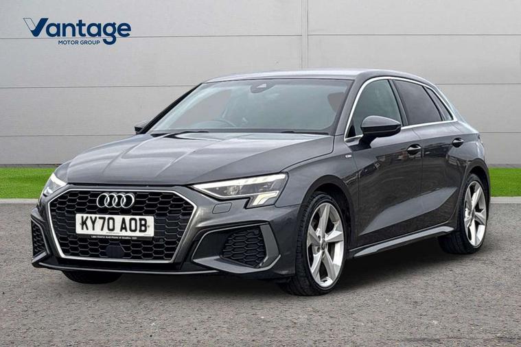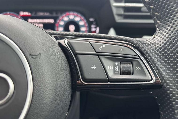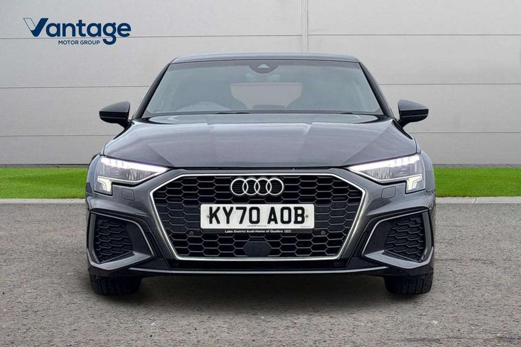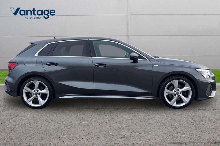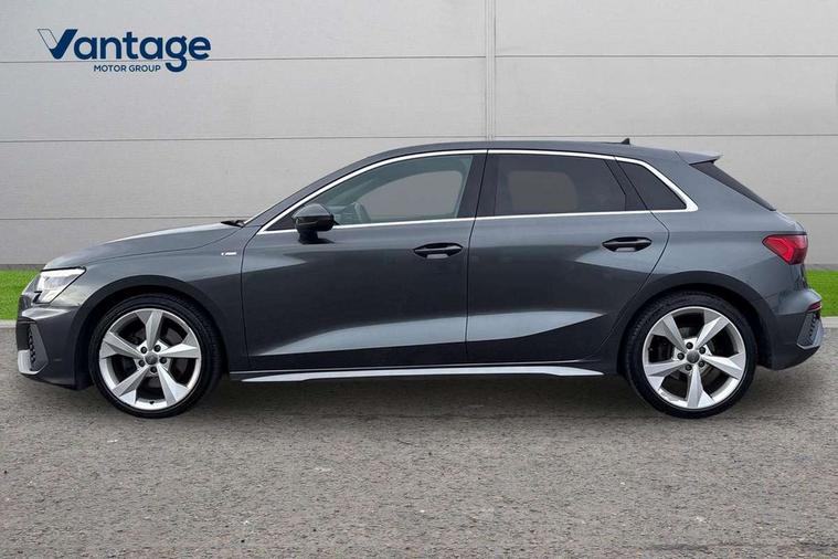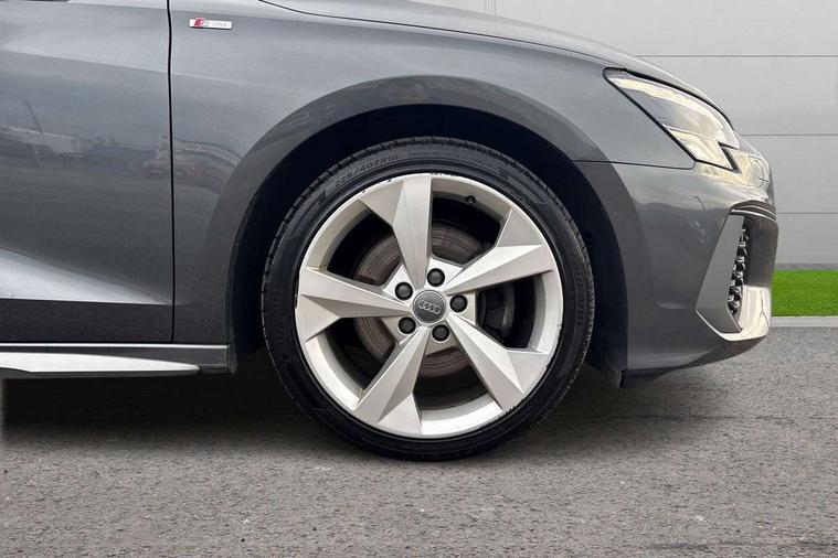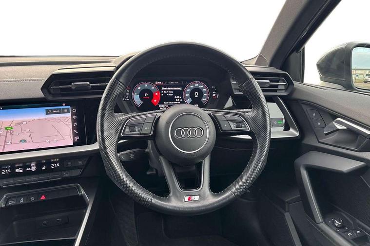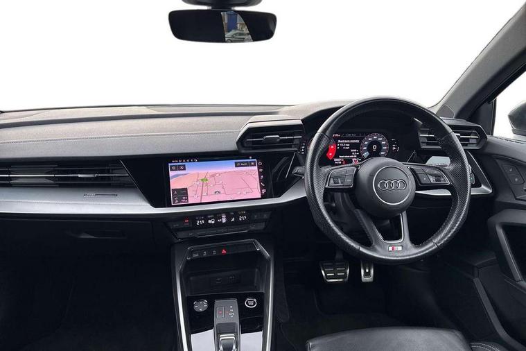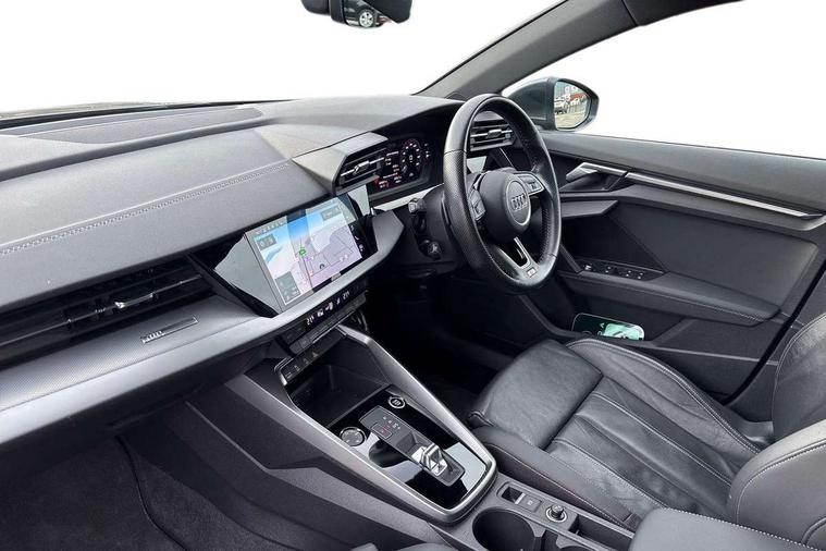 Audi connect emergency call and service, Audi drive select (Auto, Comfort, Dynamic, Efficiency and Individual), Audi smartphone interface, Audi Virtual Cockpit - 10.25" digital and colour instrument cluster, Automatic start/stop system with recuperation, Bluetooth interface, Collision avoidance assistant, Electromechanical power speed sensitive steering, Lane departure warning system, MMI Navigation Plus with high resolution 10.1" colour touch screen display, Service indicator, Trip computer, Voice control system with natural language interaction, 1xUSB-A and 1xUSB-C connection, 6 passive loudspeakers, DAB Digital radio, Acoustic glass windscreen, Aluminium window trim, Auto dimming frameless rear view mirror, Body colour exterior mirrors, Electrically adjustable/heated/folding/dimming door mirrors with kerb view includes integrated LED indications + kerb view function for passenger side, Front electric windows, Illuminated aluminium inserts front door sills with S logo, LED daytime running lights, Light and rain sensors, Privacy glass - dark tinted rear window, rear door and side windows, Rear electric windows, Rear side air outlets in grained matt black, Rear wiper, S line bumpers, S roof spoiler, 12V socket and storage compartment in front centre console, 40/20/40 split folding rear seat bench with cupholder, Black cloth headlining, Dual zone electronic climate control, Front and rear centre armrest in leather, Front and rear headrests, Front/rear floor mats, Height and reach adjustable steering wheel, Interior lighting - glove compartment light and right hand side, Luggage compartment floor covering, Manual boot compartment lid, Manually adjustable front seats, Seat side bolsters, Stainless steel pedals and front footrest, Twin leather upholstery with front sports seats S embossed logo, Aluminium interior elements pack - A3 Sportback, S line styling pack - A3 Sportback, 3x3 point rear seat belts, Driver and front passenger airbag with passenger airbag deactivation, Electronic Stabilisation Control (ESC) including ABS, ASR and EDL, First aid kit with warning triangle and 2 safety vests, Hill hold assist, Pre-sense front with pedestrian and cyclist detection, Seatbelt monitoring, Tyre pressure loss indicator, Anti theft alarm, Anti-theft wheel bolts, Electronically operated child lock, Immobiliser, Remote control central locking, Accent surfaces in the dashboard and centre console in platinum grey silk effect paint finish, Dark spectrum aluminium inlays,