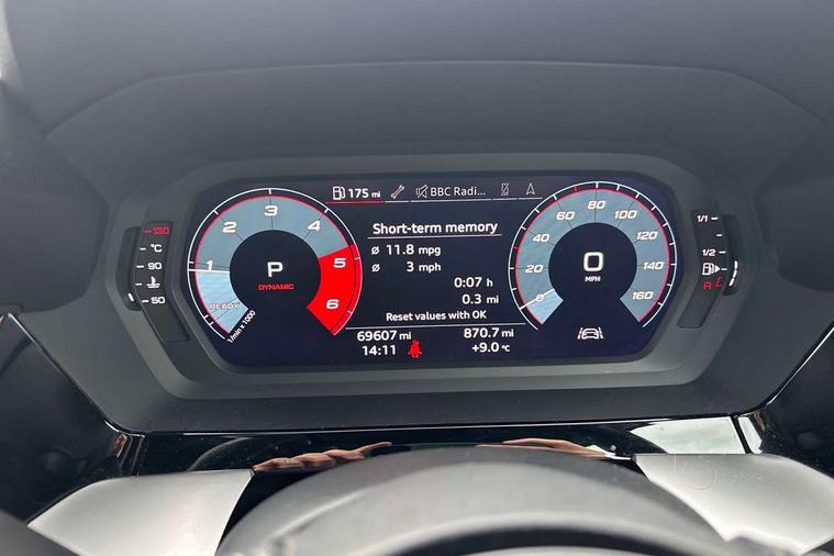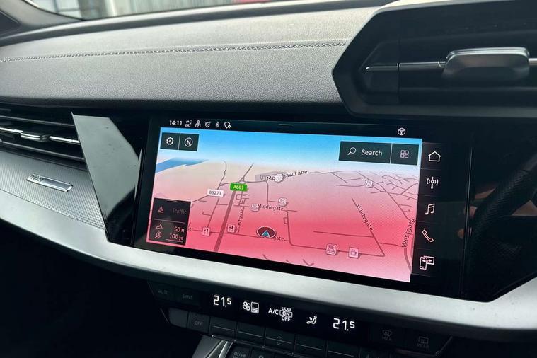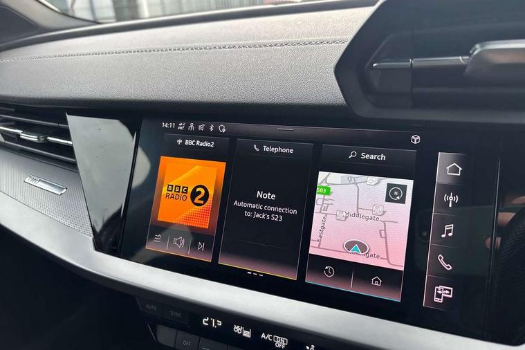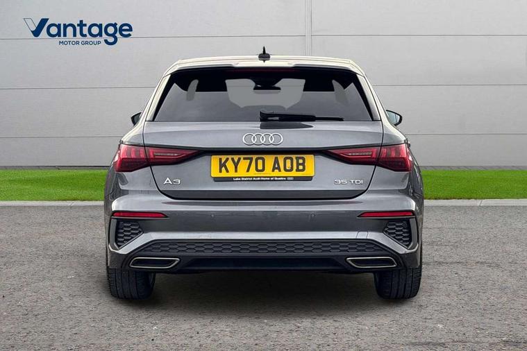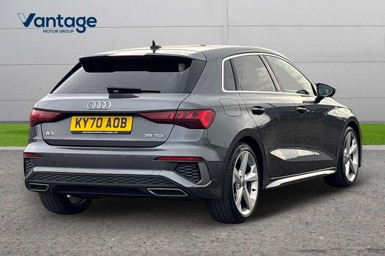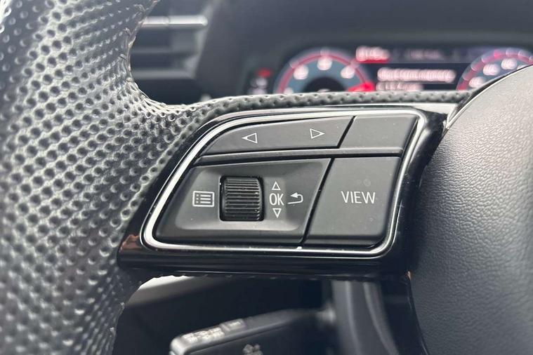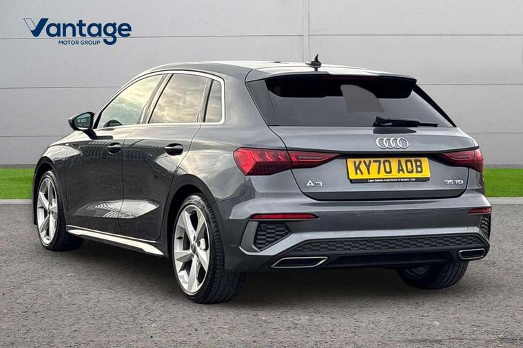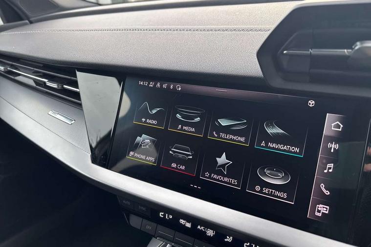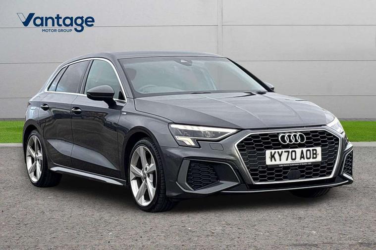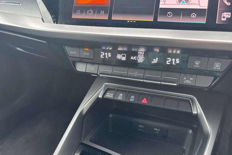 Audi connect emergency call and service, Audi drive select (Auto, Comfort, Dynamic, Efficiency and Individual), Audi smartphone interface, Audi Virtual Cockpit - 10.25" digital and colour instrument cluster, Automatic start/stop system with recuperation, Bluetooth interface, Collision avoidance assistant, Electromechanical power speed sensitive steering, Lane departure warning system, MMI Navigation Plus with high resolution 10.1" colour touch screen display, Service indicator, Trip computer, Voice control system with natural language interaction, 1xUSB-A and 1xUSB-C connection, 6 passive loudspeakers, DAB Digital radio, Acoustic glass windscreen, Aluminium window trim, Auto dimming frameless rear view mirror, Body colour exterior mirrors, Electrically adjustable/heated/folding/dimming door mirrors with kerb view includes integrated LED indications + kerb view function for passenger side, Front electric windows, Illuminated aluminium inserts front door sills with S logo, LED daytime running lights, Light and rain sensors, Privacy glass - dark tinted rear window, rear door and side windows, Rear electric windows, Rear side air outlets in grained matt black, Rear wiper, S line bumpers, S roof spoiler, 12V socket and storage compartment in front centre console, 40/20/40 split folding rear seat bench with cupholder, Black cloth headlining, Dual zone electronic climate control, Front and rear centre armrest in leather, Front and rear headrests, Front/rear floor mats, Height and reach adjustable steering wheel, Interior lighting - glove compartment light and right hand side, Luggage compartment floor covering, Manual boot compartment lid, Manually adjustable front seats, Seat side bolsters, Stainless steel pedals and front footrest, Twin leather upholstery with front sports seats S embossed logo, Aluminium interior elements pack - A3 Sportback, S line styling pack - A3 Sportback, 3x3 point rear seat belts, Driver and front passenger airbag with passenger airbag deactivation, Electronic Stabilisation Control (ESC) including ABS, ASR and EDL, First aid kit with warning triangle and 2 safety vests, Hill hold assist, Pre-sense front with pedestrian and cyclist detection, Seatbelt monitoring, Tyre pressure loss indicator, Anti theft alarm, Anti-theft wheel bolts, Electronically operated child lock, Immobiliser, Remote control central locking, Accent surfaces in the dashboard and centre console in platinum grey silk effect paint finish, Dark spectrum aluminium inlays,