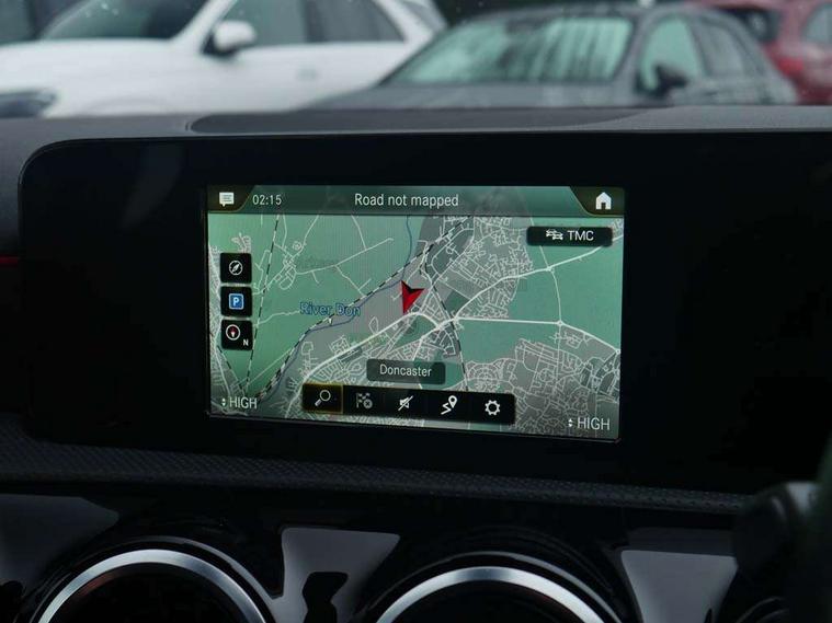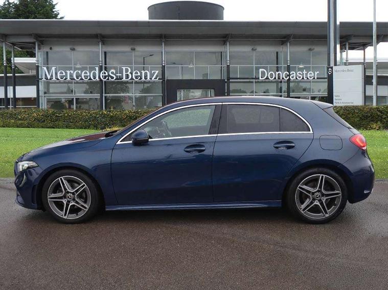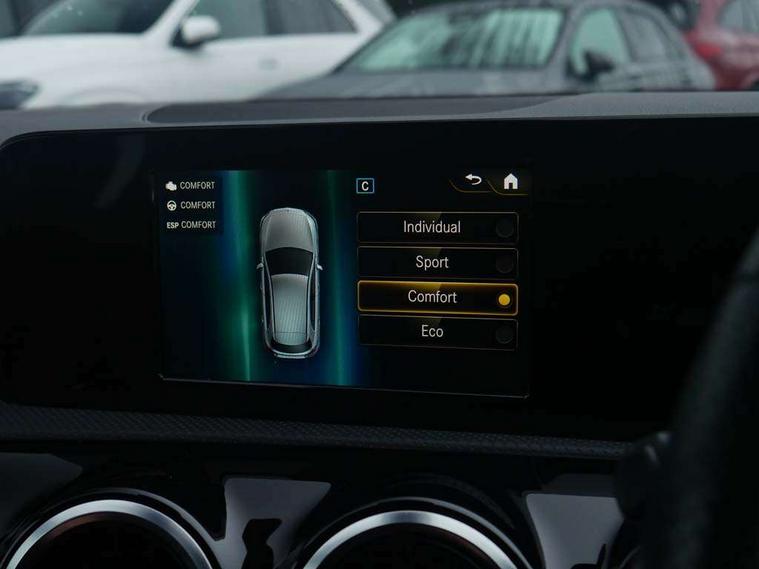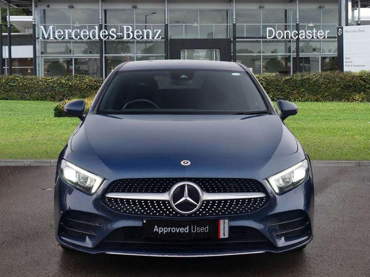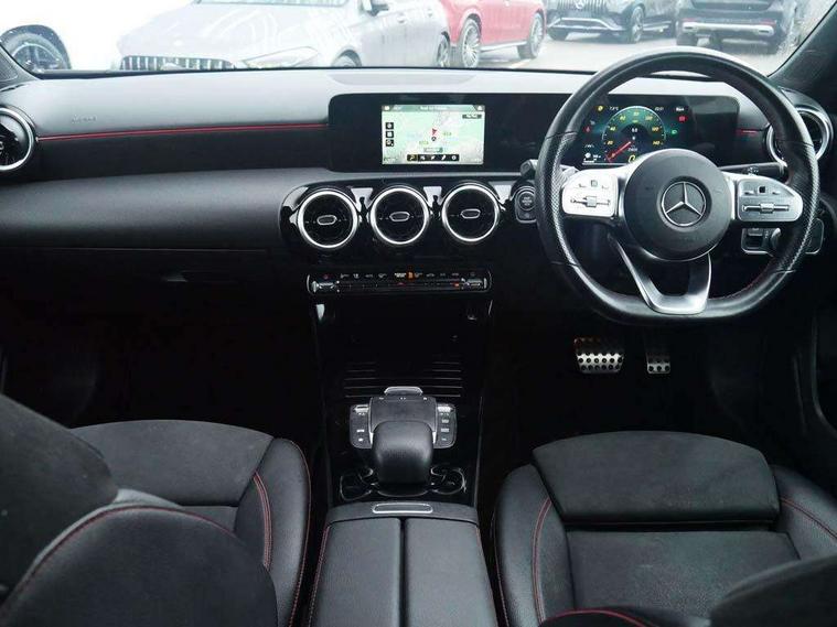 180 degree rear view camera with parking guidelines, 7" colour screen in instrument panel, 7" touchscreen media display, Attention assist, Brake pad wear indicator warning light, Car wash mode, Cruise control + speed limiter, Direct steering, Dual bluetooth interfaces, DYNAMIC SELECT with a choice of driving modes (ECO, Comfort, Sport and Individual), ECO start/stop function, Fluid level warning indicator for fuel, oil, coolant and washer fluid, Hard-disk navigation, Hey Mercedes Voice activation, Lamp failure indicator, Mercedes me connect including emergency call system, accident recovery, breakdown and maintenance management, Mercedes me remote services, Outside temperature gauge, Owners manual in English, Pre-installation for private car sharing, Preinstallation for Mercedes Benz link, Service indicator (ASSYST), Speed sensitive power steering, Trip computer, Lowered comfort suspension, Rear axle torsion beam, 2 USB ports (type C) in rear stowage compartment and one in front of center console, 6 speakers, DAB Digital radio, MBUX multimedia system with DAB digital radio and touchpad including satellite navigation, Mercedes-Benz sound system - 100W, 4 Electric Front and Rear windows, Adaptive brake lights, AMG bodystyling - Front apron with splitter in chrome, rear apron with chrome trim and chrome visible trim elements in tailpipe, Black weather strip, Body colour bumpers, Body colour door handles, Body colour side skirt, Body coloured door mirrors, Chrome beltline trim, Diamond radiator grille with chrome pins and silver louvre + chrome insert, Electric adjustable and heated door mirrors with integrated LED side indicators, Exhaust system - Twin visible tailpipes in polished stainless steel, Headlamp assist automatic headlamp activation, Heated glass rear windscreen + timer control, LED high performance headlamps with integrated LED daytime running lights, LED tail lamp, LED third brake light, Privacy glass, Radio aerial, Rain sensing windscreen wipers with two sensitivity settings, Rear fog lights, Rear wiper, Window line trim strip in chrome, 3 Spoke flat bottom leather multi function steering wheel with perforated leather in grip area, 40:20:40 split folding rear seats, Artico man-made leather/Microfibre Dinamica upholstery with red contrast stitching, Auto Mercedes-Benz child seat recognition sensor, Black air vents with surround in silver chrome, Black roof lining, Brushed stainless steel sports pedals with rubber studs, Controller on centre console with chrome surround, Floor mats with stitched edging and AMG lettering, Front centre armrest with storage compartment, Front door sills with Mercedes Benz lettering, Front seat backs luggage nets, Front seat cushion length adjustment, Galvanished gear shift paddles on steering wheel, Heated front seats, Height/reach adjustable steering column, Interior mirror with reading lamps in black and frameless, Manual height adjustable front seats, Rear head restraints, Seat occupancy sensor for front passenger seat, Sports seats with integrated headrests, Stowage compartment in centre console with retractable cover, Sunvisors with illuminated vanity mirrors, Touchpad on center console, Twin front cupholders, Two zone thermotronic luxury automatic climate control, Light and sight pack - A Class, Seat comfort pack - A Class, 3 rear 3 point seatbelts, ABS with Brake Assist, Active bonnet, Active brake assist includes forward collision warning system with autonomous braking, Adaptive brake assist with hold function and hill start assist, Black seatbelts, Childproof locks manually operated for rear doors and electrically operated for rear power windows, Crash responsive emergency lighting, Driver and passenger head and side airbags, Drivers knee airbag, Dual stage driver/passenger airbags, Electronic parking brake, ESP curve dynamic assist, ESP with ASR, Front and rear seatbelt reminder, Front brake callipers with Mercedes Benz lettering, ISOFIX and top tether child seat fixing points in two outer rear seats, Tyre pressure monitoring system, Warning triangle and first aid kit, Window airbags, Alarm system/interior protection/immobiliser, Keyless Go, Remote central locking and crash sensor with emergency opening function, Urban guard vehicle protection system with immobiliser and interior protection, Dinamica microfibre trim in black, 18" AMG 5 twin spoke light alloy wheels in titanium grey with highsheen finish, Summer tyres, Tirefit sealant kit,