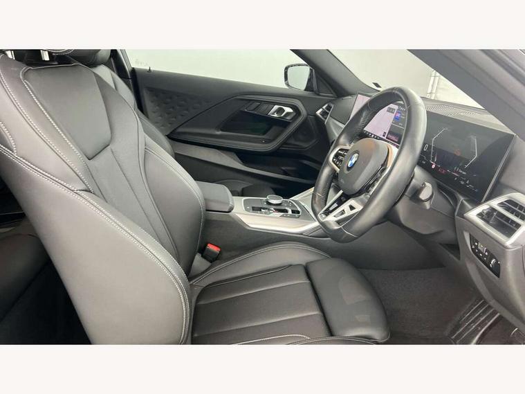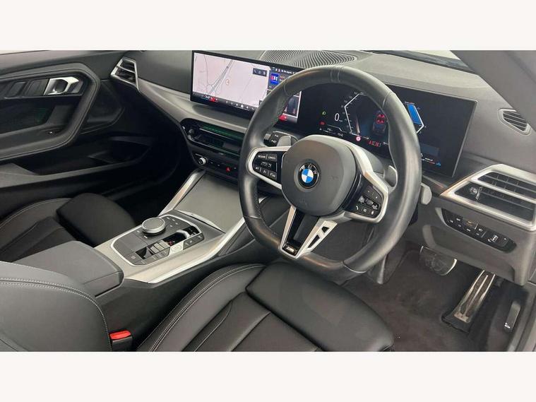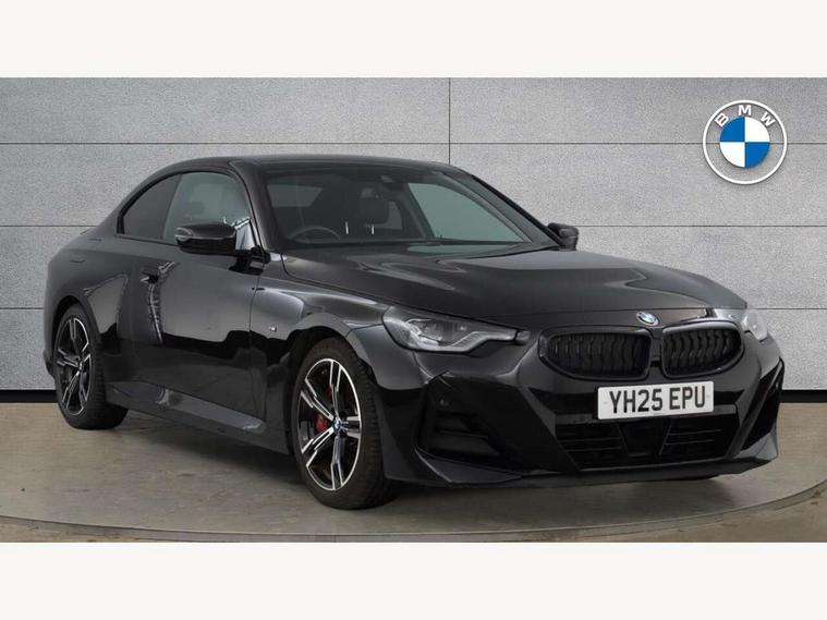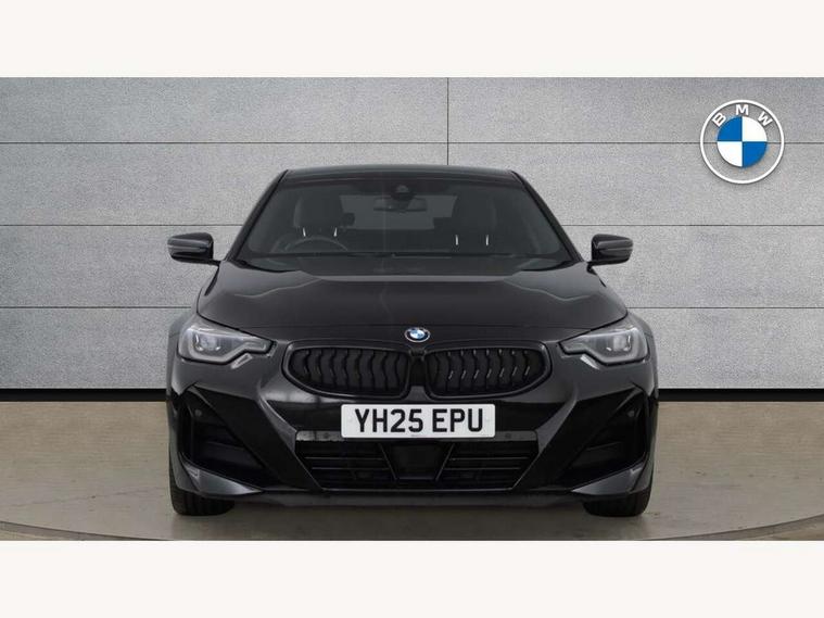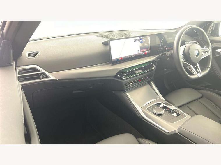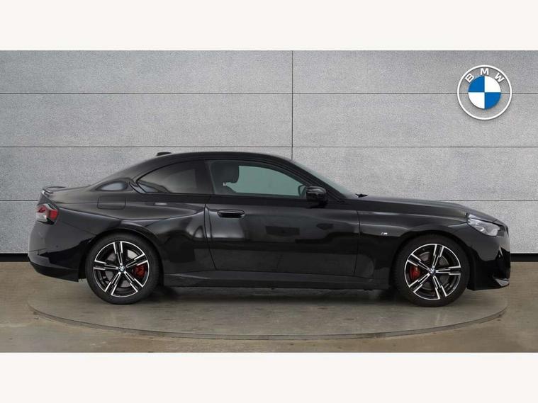 2 USB connections for charging and transferring data, Active guard plus, Attentiveness assist, Bluetooth with USB, BMW ConnectedDrive online services, BMW Intelligent Personal Assistant, BMW Live cockpit plus, BMW operating system 8 with variable, configurable widgets display information in real time, BMW Teleservices, Check Control warning system for monitoring of lights and door/luggage compartment open warning, Control Infotainment, Direct selection buttons, Drive off assistant, Eco pro mode, Electric power steering, eSim with 5G connectivity, Front and rear parking sensors, iDrive controller with turn and press function, Integrated owners handbook, Intelligent functions, Oil sensor for level and grade, Optimum shift indicator, Personal Profile, Smartphone integration, Touch operation on control display, Variable sport steering, Widescreen multi-media display, WiFi interface for wireless connection of mobile terminal devices, Aluminium lightweight construction, Balancer shaft, BMW TwinPower Turbo four-cylinder petrol engine, Double VANOS, Drive performance control with ECO PRO comfort + sport mode, Electronic differential lock, High precision injection, M sport suspension, Petrol Particulate Filter, Steptronic transmission with gearshift paddles, Twin scroll turbocharger with Valvetronic, DAB tuner, Acoustic windscreen wipers for reduced driving noise, Automatic windscreen wipers and automatic headlight, Body colour door handles flush with door surface, Body colour door mirrors, Body colour front and rear bumpers, Daytime running lights, Electric windows - front and rear, with open/close fingertip control and trap release, Exhaust tailpipes x2 - 90mm in left and right, Fading support, Front and rear bumper system with replaceable deformation elements, Front door sill finishers in black plastic with BMW designation, Front windscreen wipers with integrated washer jets, Green tinted heat protection glazing, High beam assistant, High gloss black sill, bumper trim sides and diffuser insert, High level third brake light, Indicators integrated int mirror housing, Interior rear-view mirror with automatic anti-dazzle function, LED registration plate light, LED technology rear tail lights, brake lights and turn indicators, Lightweight engineering, M high gloss shadowline, One piece kidney grille with hight gloss chrome surround, Rear boot, Rear fog lights, Reversing light in rear light cluster, Shark fin antenna, Single part LED rear lights with smoked glass components, Trailer stabilisation logic, Visible VIN plate, 12V power socket in front centre console with blanking plug, 2 cupholders in front centre console, 2 zone automatic air conditioning, Ambient lighting, Compartment in front of cupholder, Conditioned based service, English handbook, Folding rear seat head rests, Front and rear side armrests integrated into door trim, Front armrest, Front door pockets, Front head restraints, Heated front seats, Illuminated glove compartment with separate small compartment, M headliner Anthracite, M sport leather steering wheel, Manually adjustment steering wheel column, Rear seat backrest with manual 40:20:40 split folding, Rear seat centre foldable armrest with integrated cup holder, Single front passenger seat, Storage compartment between rear seats, Storage tray and compartment with cover in centre console, Sun visors with vanity mirrors and insert tab, Through loading system with 40/20/40 split folding 2 rear seat in 2nd row, Velour floor mats, Additional storage compartment pack without USB - 2 Series Coupe, Connected pack professional - 2 Series Coupe, 2 tone horn, Anti lock braking system (ABS) with cornering brake control, Automatic Stability Control (ASC), BMW emergency call, Brake drying, Child seat ISOFIX attachment for the two outer rear seats, Crash sensor activating of airbags, Unlocking doors, hazard warning lights, interior light, safety battery terminal, Deactivation of fuel pump in the event of a crash, Driver and front passenger airbags, Driver and front passenger side airbags, integrated in the door side seat backrest bolsters for all seat variants, Dynamic brake control, Dynamic stability control + (DSC+), Dynamic Traction Control - DTC, Electrically operated hand brake including automatic hold function and automatic release when driving off, Front and rear disc brakes, Front centre airbag between driver and front passenger seats, Front passenger airbag deactivation, Head airbags for all 4 outer seats, PC iBrake (Post crash approach control warning with light braking function), Seat belt security check for driver and front passenger, Seatbelt warning, Side impact protection, Three point seat belts on 4 seats including front belt stopper, pyrotechnic belt tensioners and belt force limiters, Tyre pressure monitoring system, Warning triangle and first aid kit, Alarm system (Thatcham 1) with remote control and electronic engine immobiliser, Central locking switch for all doors, fuel filler cap and luggage compartment, Deadlocking function system to all doors, Drive away locking system on all doors and luggage compartment, Locking wheel bolts, Start/Stop button (illuminated) in centre console with keyless engine start and Auto Start-Stop deactivation button, Two remote control key with integrated key - one button for open and close doors/fuel flap/tailgate and separate button for unlock luggage compartment, Electrically powered 12V compressor, Reduced rolling resistance tyres, Tyre repair kit,