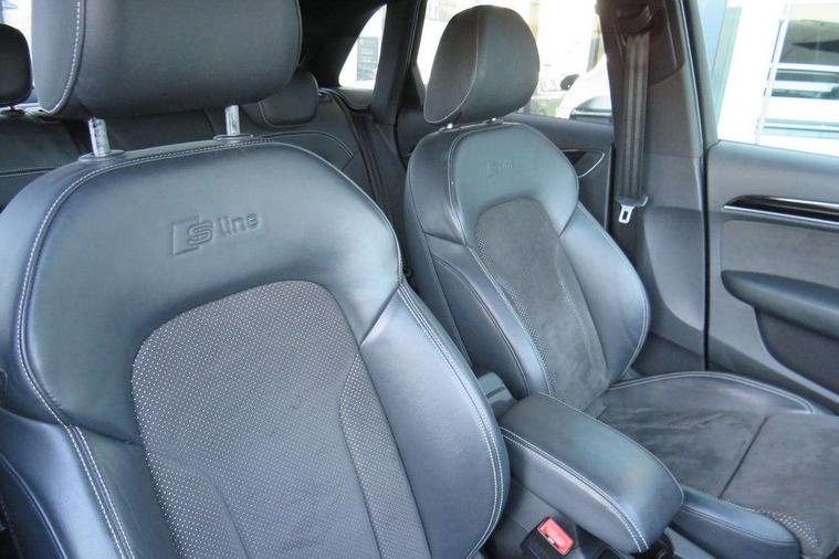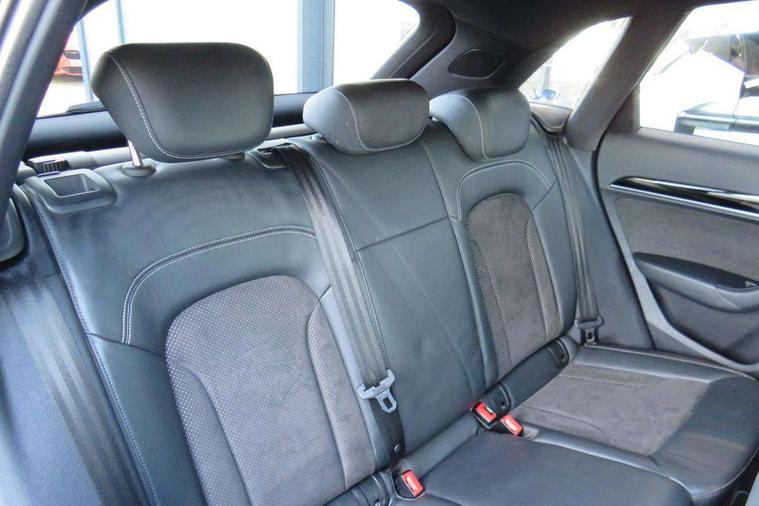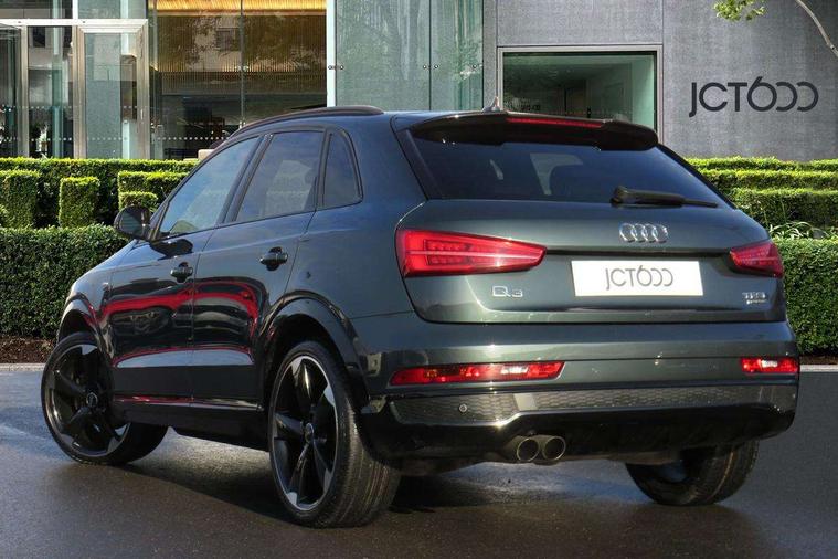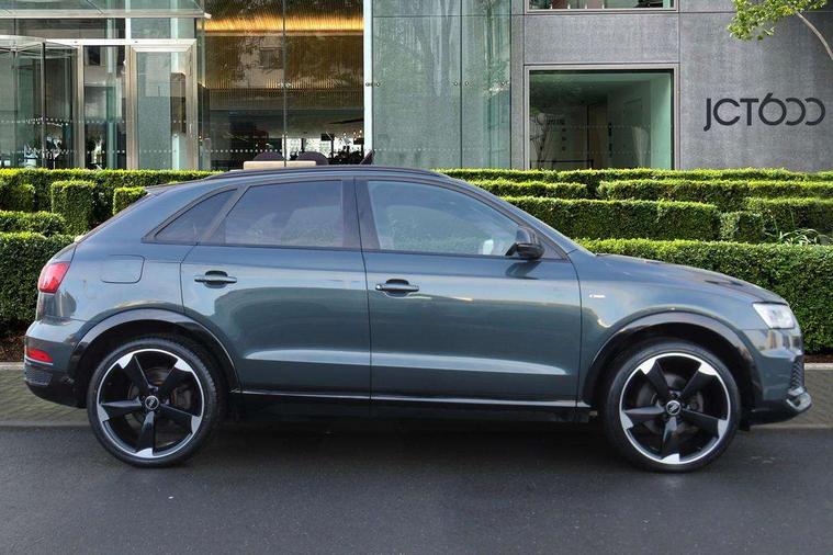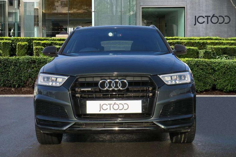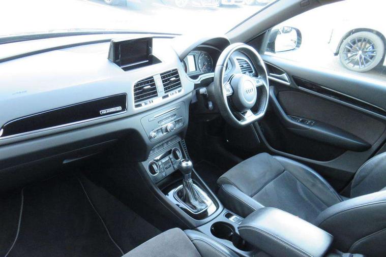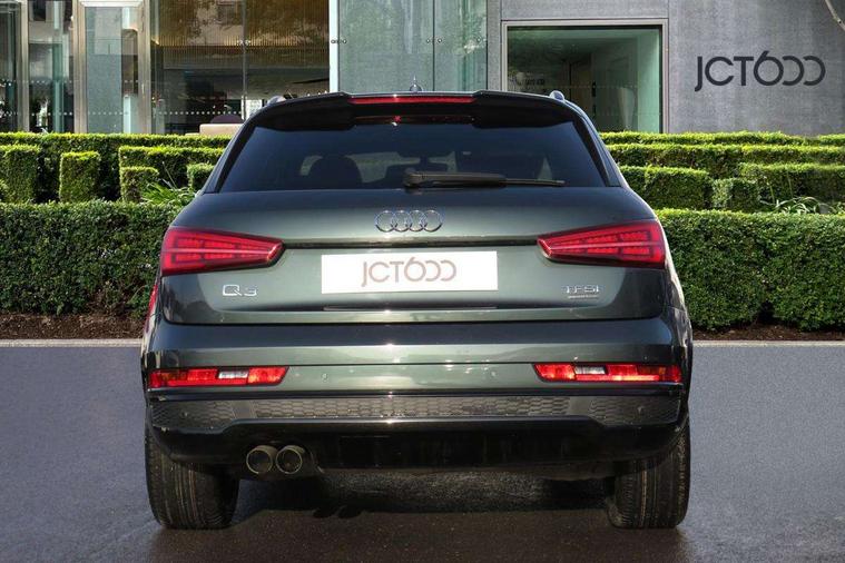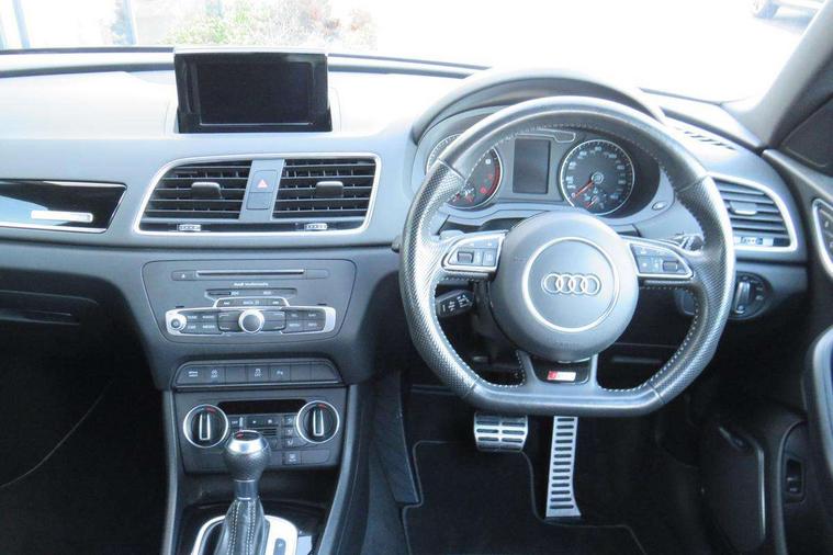 6.5" colour display screen, Audi drive select, Cruise control, Electro-mechanical PAS, Low washer fluid indicator, MMI - Multi Media Interface control system, On board computer, Remote electric boot opening/closing, Service interval indicator, Voice control system, Sports suspension, Audi music interface, BOSE sound system, DAB digital radio module, Acoustic windscreen, Aluminium window surround, Auto dimming rear view mirror, Black exhaust tailpipes, Black high gloss door mirrors, Black roof rails, Coming home function, Door mirror integrated indicators, Front and rear electric windows, Front fog lights, Front lip spoiler, Heated windscreen washer jets, High Gloss Black Contrast Bumpers, High Gloss Black rear spoiler, LED daytime running lights, LED headlights with headlight washers, LED rear lights, Light and rain sensor for auto activation of lights and windscreen wipers, Loading sill protector in stainless steel, Privacy glass, Rear diffuser with platinum insert, Rear wiper, S Line body styling, Sunband for windscreen, 12V socket in rear centre console, 3 spoke flat bottom multi-function perforated leather steering wheel with contrast stitching and aluminium gearshift paddles, Aluminium door sill trims, Aluminium gear knob, Black cloth headlining, Door sill trim strips, Dual zone climate control, Electric front lumbar adjustment, Front and rear headrests, Front and rear velour floor mats, Front centre armrest with storage compartment and angle adjustment, Front sports seats, Height/reach adjust steering wheel, ISOFIX on front passenger and rear outer seats, Jack and tool kit, Retractable luggage cover, Reversible boot floor, Split fold rear seat, Stainless steel pedals, Storage compartment and 12V socket, Under floor storage in luggage area, Audi Exclusive black styling pack - Q3, LED interior light pack - Q3, 3x3 point rear seatbelts, ABS+Electronic Brake force Distribution, Curtain airbags, Driver and passenger airbags, Driver and passenger side airbags, EDL + ASR, Electrically operated child locks on rear doors, Electromechanical parking brake, ESP, First aid kit, Front passenger airbag deactivation, Head airbags, Seatbelt warning light, Tyre pressure monitoring system, Warning triangle, Locking wheel bolts, Remote central locking, Thatcham category 1 alarm + immobiliser, Piano black finish inlay,