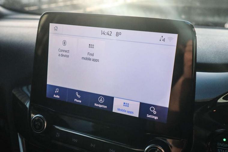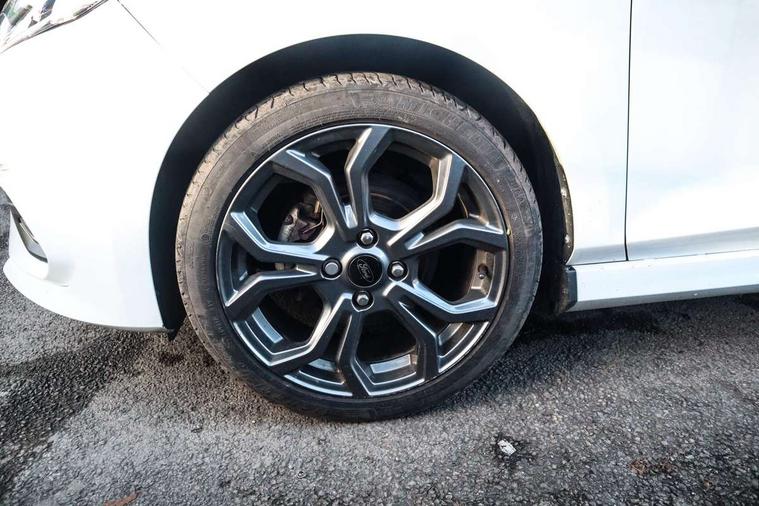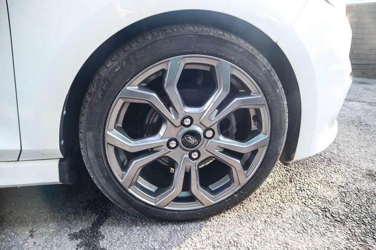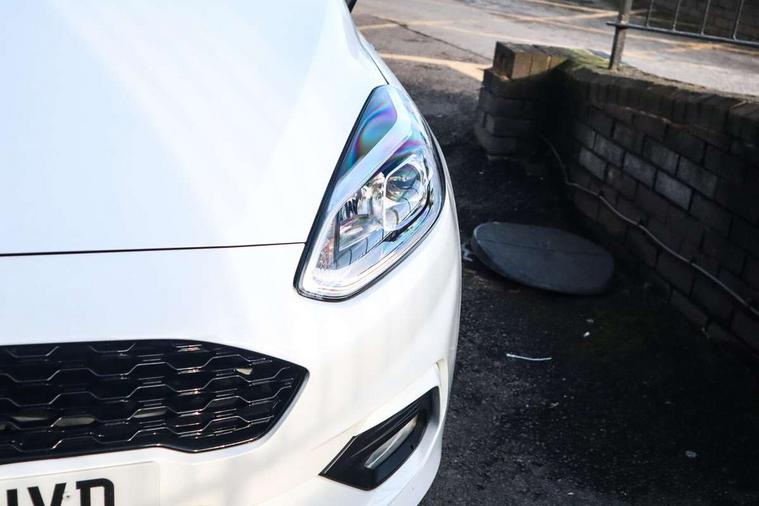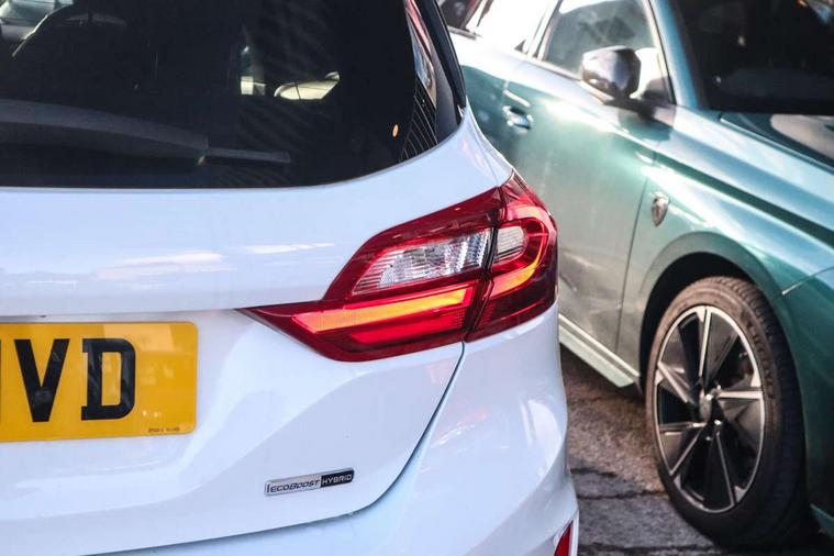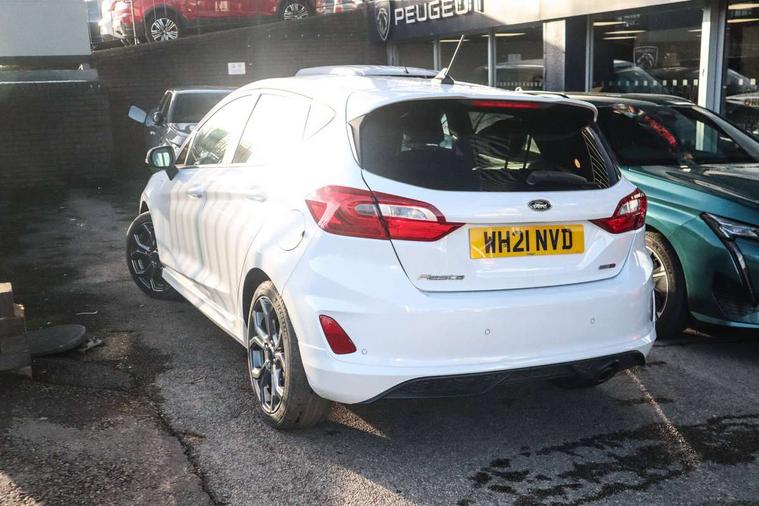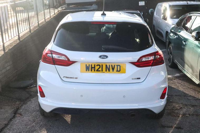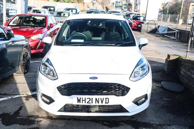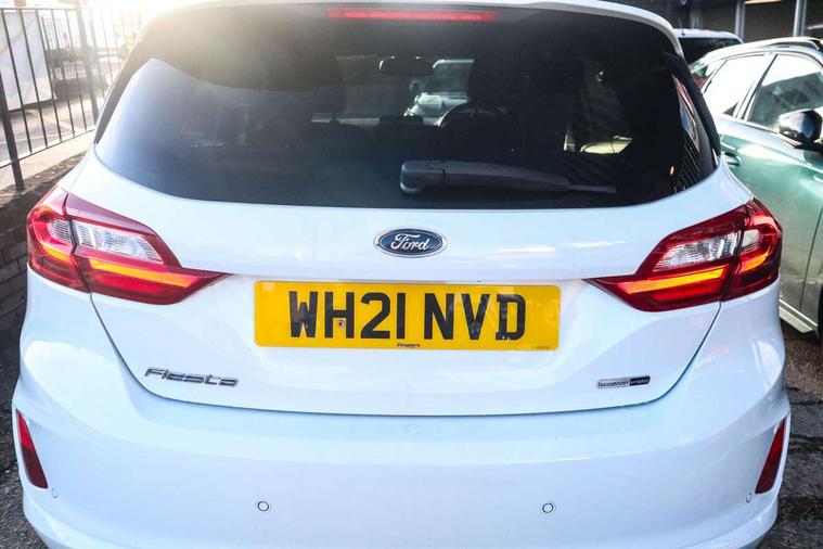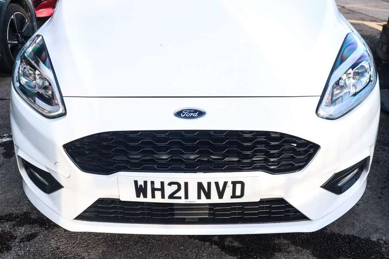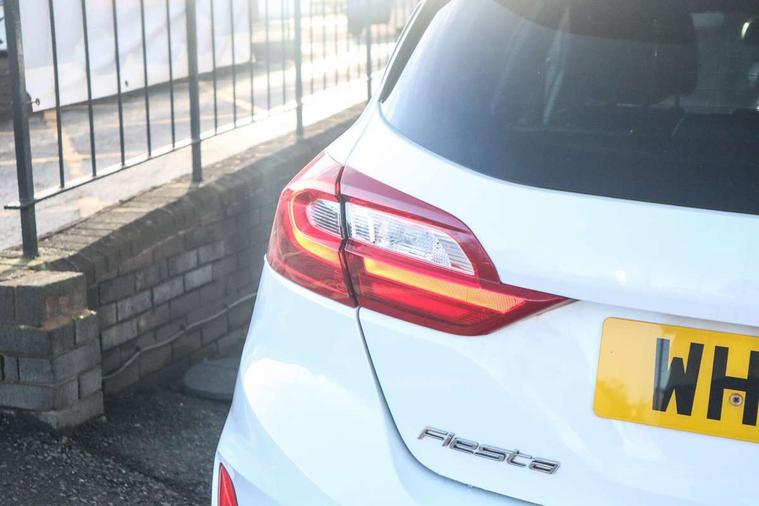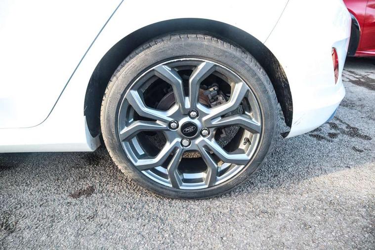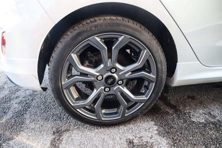 Bluetooth system, Electric power steering, Ford easy fuel, Ford SYNC 3 Navigation system incl 8" touchscreen, 7 speakers, FordPass connect, Apple carplay, android auto, voice control and emergency assistance, Rear parking distance sensors, Selectable drive modes (Normal, Sport, Track), Trip computer, Sports suspension, 2 USB ports, Auxiliary input socket, DAB Digital radio, Steering wheel mounted controls, Body colour bumpers, Body colour door handles, Body colour large rear spoiler, Body coloured electrically operated and heated door mirrors with side indicators, Cornering front fog lights, Electric front windows/one touch facility, Electric rear windows, LED Night signature to rear lights, Quickclear heated windscreen, Rain sensing wipers and auto dimming rear view mirror, Rear privacy glass, Rear wiper, Unique ST-Line upper grille & full bodystyling kit with ST-Line wing badges, 3 spoke flat bottomed leather steering wheel, 60/40 split folding rear seat, Adjustable head restraints, Black headlining, Boot carpet, Centre console with opening armrest, 2x cupholders, 12v and USB, Chrome inner door handles, Cloth upholstery, Footwell illumination, Front floor mats in velour, Front map reading lights, Front seat and rear pockets, Illuminated glovebox, Leather gaiter, Load area light, Manual 2 way passenger seat adjust, Manual 4-way driver seat adjust, Manual air conditioning, Overhead console with sunglasses holder, Pollen filter, Rake/reach adjustable steering wheel, Sensico wrapped steering wheel, Sports front seats, NCAP Pack - Fiesta, 3 point seatbelts on all rear seats, ABS+EBA, Curtain airbags, Driver and passenger airbags, Drivers knee airbag, Electronic stability control with hill start assist, Front passenger airbag deactivation, Front side airbags, Seatbelt warning, Two tone horn, Tyre pressure monitoring system, Keyless start with 'Ford Power' starter button, MyKey system, Remote central locking & engine immobiliser, Thatcham Cat.1 alarm, 17" 5 spoke alloy wheels with rock metallic finish,