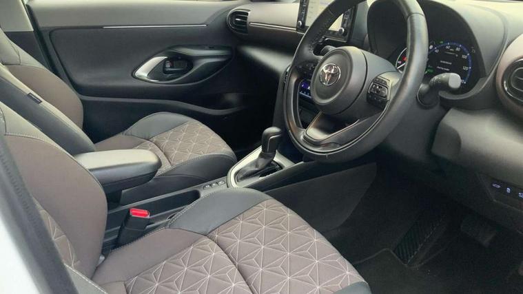 10.5" Multimedia display screen, 10.5" Toyota smart connect+ with navi multimedia system with wireless Smartphone integration incl Apple CarPlay, 360 degree panoramic view monitor, 7" Multi information display screen, Adaptive cruise control, multi info switches on steering wheel, Adjustable speed limiter, Advanced parking assist, Blind spot monitoring, Bluetooth connectivity, Color multi-information display, Digital speedometer, Digital tachometer, Drive mode selector, Driver attention alert system, Dynamic guide lines on reversing camera, eCall emergency system, Electric power steering, Emergency driving stop system, Full range intelligent adaptive cruise control, Hybrid system indicator, Intelligent front and rear parking sensors with clearance sonar and automatic braking, Intersection turn assist, Key reminder warning, Lane change assist, Lane departure warning, Lane trace assist, My T Connected services, Power tailgate, Pre-collision system enhanced with emergency steering assist, Rear cross traffic alert with brake assist, Remote boot door release in cabin, Road sign assist - RSA, Safe exit assist, Telephone switch on steering wheel, Wireless Mobile Phone Charger, Steering assisted vehicle stability control, 6 speakers, DAB Digital radio, Front USB Type-C connector, Front USB-C device charger, 3rd brake light, Acoustic windscreen glass, Anti-jam protection on power windows, Auto dimming rear view mirror, Auto high beam [AHB] with on/off switch, Auto intermittent windscreen wipers, Automatic headlights, Automatic headlights cut-off, Automatically retractable door mirrors, Black door moulding, Black lower front grille, Black protection moulding on side doors, Black roof rails, Black wheel arch mouldings, Body colour door handles, Body colour front bumper, Body colour rear bumper, Electric adjustable heated door mirrors, Follow me home headlights, Front and rear electric windows with auto up/down function, Gloss black upper front grille, Headlight cut off reminder, Indicators integrated on door mirrors, Intermittent rear wiper, Kick activated power back door, LED daytime running lights guide, LED front fog lights, LED front light guide, LED Indicators, LED projector headlights, LED rear lights with sequential indicators, Manual headlight levelling, Meshed shape upper front grille, Noise reduction layer on windscreen, Privacy glass, Rain sensor, Rear side wing doors, Rear spoiler, Rear window defogger, Shark fin antenna, 12v power outlet - front, 12V power point in boot, 2x Rear coat hooks, 3 seat bench in 2nd row, 3 spoke leather steering wheel, 40/60 split deckboard, 40:20:40 split folding rear bench seat, Adjustable rear headrests, Adjustable speed limiter switch on steering wheel, Boot light, Central armrest, Driver and front passenger personal lights, Driver and front passenger Whiplash injury Lesseing seats, Driver and passenger seatback pockets, Dual zone automatic air conditioning, Fabric door trim, Front console box, Front cup holders, Front door pockets, Front head restraints, Front sport seats, Front/rear assist grips, Gear shift indicator, Grey roof lining, Heated driver and passenger seats, Heated steering wheel, Height adjustable driver's seat, Height adjustable front passenger seat, Hooks for luggage holding belts, ISOFIX child restraint system, Lane departure alert switch on steering control, Leather gearshift, LED centre room light, Light on driver and passenger sun visor, Manual telescopic and tilting steering wheel, Mirror on driver and passenger sun visor, Nanoe-X air purifier, Partial synthetic leather upholstery, Pollen air filter, Power adjustable lumbar support on driver seat, Rear cup holders, Rear door pockets, Rear head restraints, Remote air-conditioning system, Single compartment glovebox, Single front passenger seat, Soft tonneau cover, Storage box under boot floor, Voice recognition switch on steering wheel, White ambient lighting in centre console, White ambient lighting in footwell, White ambient lighting on front doors, Yaris cross floor mats, Tech pack - Yaris Cross, 3x3 point rear seat belts, ABS+EBD+Brake assist, Downhill Assist Control (DAC), Driver and passenger central airbags, Driver and passenger front airbags, Driver and passenger side airbags, Electronic parking brake, Emergency brake light system (EBS), Front seat belt reminder, Hill start assist control (HAC), Passenger airbag on/off switch, Pre-collision system with pedestrian and cyclist detection, Rear door child safety locks, Rear passenger side airbags, Rear seat belt reminder, Traction control, Tyre pressure warning system, Immobiliser, Intrusion alarm, Keyless smart entry with push button start, Power door locks, Power passenger window lock, Remote door lock, Gloss black side air vent surrounds, Tyre repair kit,