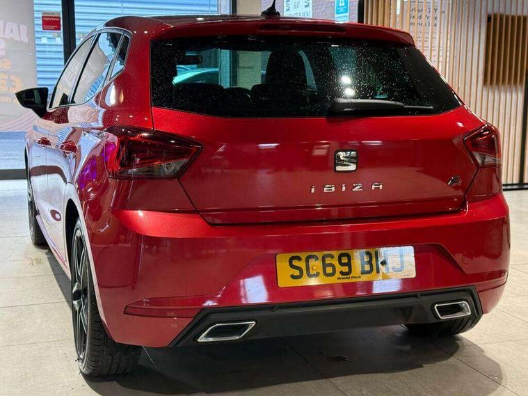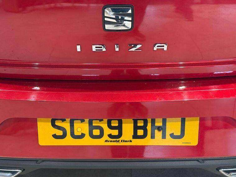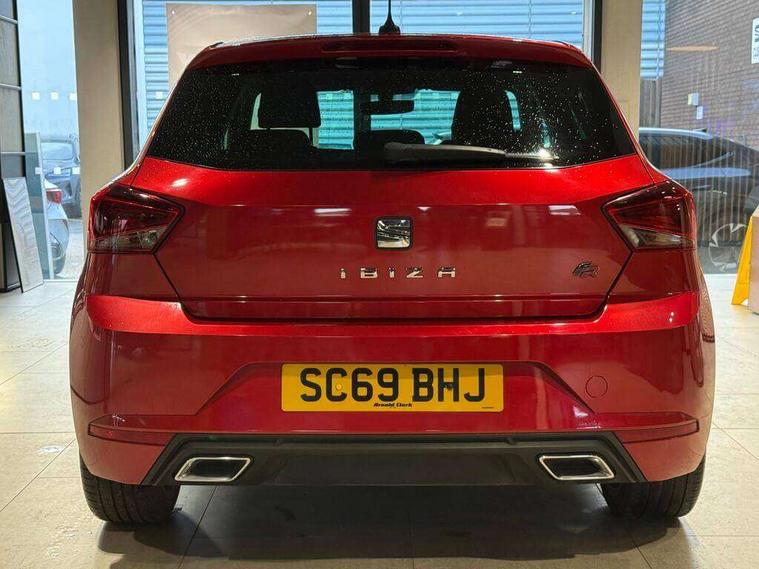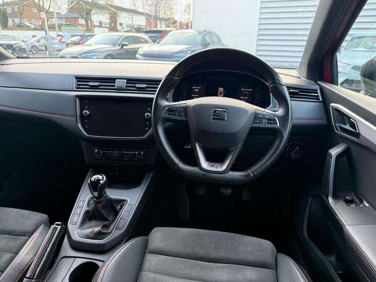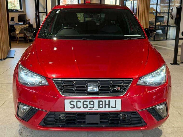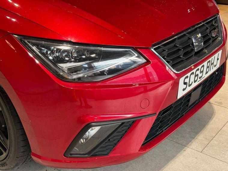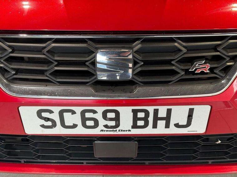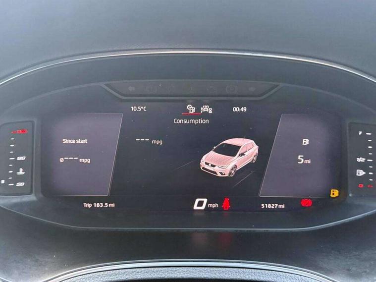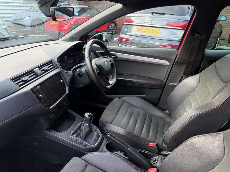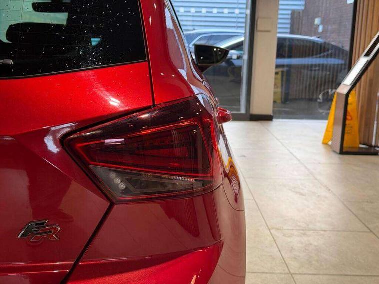 'Lights On' Reminder warning buzzer, Bluetooth Handsfree Phone Connection, Cruise control, Digital clock, Digital cockpit, Full Link Smartphone Integration with Mirror Link, Apple Car Play, Google Android Auto, Low fuel warning light, Outside temperature gauge, Power Steering, Satellite navigation system with 3D mapping, 8" touch screen, voice control and additional USB port, SEAT Drive profile, SEAT logo boot release, Trip computer, Sports suspension, 6 speakers, Auxiliary input socket, CD player, Digital Audio Broadcast (DAB) Tuner, Radio/MP3 player, SD card slot, SEAT USB media cable, Steering wheel mounted controls, USB port, Anti theft roof antenna, Auto dimming rear view mirror, Automatic headlights, Automatic rain sensing wipers, Body colour bumpers, Body colour door handles, Brilliant black door mirrors, Chrome front grille frame, Chrome grille, Coming/leaving home lighting function, Cornering front fog lights, Dark tinted rear windows, Electric folding door mirrors, Electric front windows, Electric headlight adjustment, Electrically adjustable and heated door mirrors, Exclusive FR rear bumper, Full LED headlights, LED daytime running lights, LED tail lights, Rear fog lights, Twin exhaust pipes, 3 rear headrests, 60/40 split folding rear seat, Door and steering wheel ice metal decorative inserts, Driver's sunvisor with ticket holder/vanity mirror, Dual zone climate control, Dust/pollen filter, Flat bottomed perforated leather steering wheel with red stitching and FR logo, Front courtesy lights, Front cupholders x 2, Front reading lights, Gear shift indicator, Glovebox, Height adjustable driver's seat, Height adjustable front/rear head restraints, Height adjustable passenger seat, Height/reach adjust steering wheel, Illuminated boot, Instrument lighting with brightness control, Leather handbrake, Microsuede cloth upholstery, Multi-colour ambient interior lighting, Passenger sunvisor, Rear top tether child seat ISOFIX attachment, Sports seats, Full LED headlight pack - Ibiza, 3 point seatbelts on all 3 rear seats, ABS, Active front headrests, Child locks on rear doors, Curtain airbags, Driver/Front Passenger airbags, ESP+EBA, Front assist (AEB), Front passenger airbag deactivation, Front side airbags, Hill hold control, Multi-Collision braking, Seatbelt warning, Tiredness recognition system, Tyre pressure monitoring system, Electronic engine immobiliser, Locking wheel bolts, Remote central locking + deadlocks, Volumetric alarm with back up horn, Leather dashboard, 18" Performance machined bi-colour alloy wheels,
