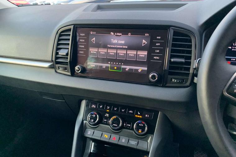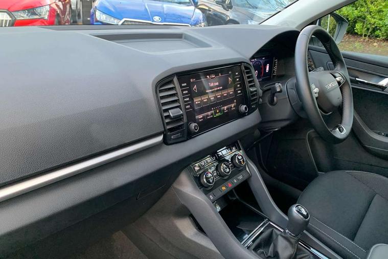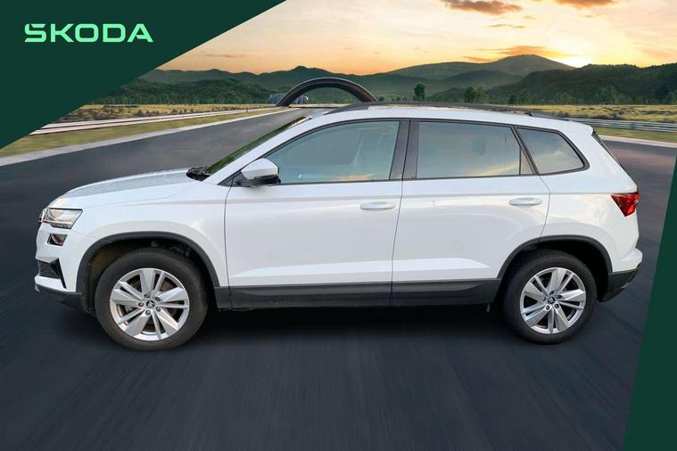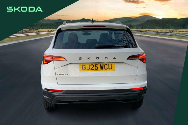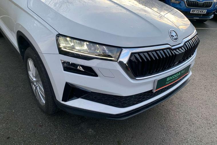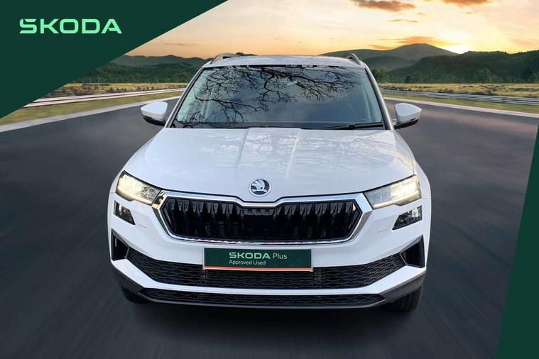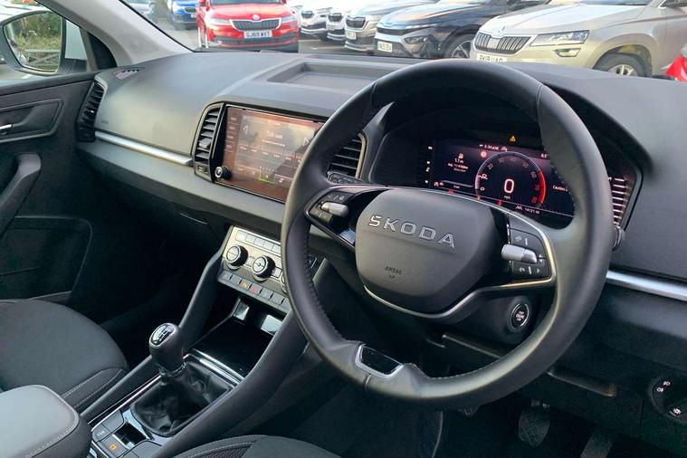 Advanced driver attention and drowsiness monitor, Amundsen navigation system with 8" touchscreen display and integrated WLAN and web radio, Electro-mechanical PAS, Emergency services call system, Lane assist, Outside temperature gauge, Sensor for driver assistance systems, Service interval indicator, SmartLink wireless for Apple and wired for Android, Start/stop system with regenerative braking, Traffic sign recognition, USB C Port x 2 in front centre console, Virtual Cockpit - 10.25" digital display, Wireless smartphone charging, 8 Speakers, DAB radio with Bluetooth, USB connection, Acoustic glass, Aero front windscreen wipers with intermittent function, Auto dimming rear view mirror with light and rain sensors, Black electric window control buttons, Body colour door mirrors and handles, Electric front and rear windows with child proof lock, Electrically adjustable heated folding and auto dimming door mirrors, Front fog lights, Headlight range control, Heated rear windscreen, LED daytime running lights, LED Headlights, LED rear lights with high functionality welcome effect and dynamic indicators, Light assistant (coming/leaving home/tunnel light), Plastic scuff plates in door apertures, Privacy glass, Rear side wing doors, Rear window wiper with washer system and intermittent control, Safety reflectors on front doors, Third brake light, Unique dark chrome design logo on alloy wheels, 1.5 litre bottle holders in driver and front passenger door panels, 12V socket in boot, 12v socket in front centre armrest with storage compartment and rear air vents, 2 spoke leather heated multifunction steering wheel, 2 x Tablet holder, 3 rear height adjustable headrests, 3 seat bench in 2nd row, 4 foldable roof handles with rear coat hooks, Black floor carpet, Cargo elements in boot, Chrome inner door handles, Driver/front passenger reading lights, Foldable hooks in the boot, Folding tables on the front seat backrests, Front head restraints, Height adjustable driver and passenger seat, Height adjustable front three point seats belts with tensioners, Height/reach adjust steering wheel, Ice scraper, Illuminated glovebox, Illuminated luggage compartment, Interior noise suppression, Isofix child seat preparation for front passenger seat, Isofix child seat preparation outer rear, Loft fabric upholstery, Manual lumbar support for front seats, Pearl grey interior ceiling, Pen holder, Pollen filter, Rear boot cover, Rear package tray, Rear reading lights, Rubbish bin door, Safety vest holder, Single front passenger seat, Skoda lettering on steering wheel, Storage box in upper central dashboard closed, Sunvisors with illuminated vanity mirrors, Textile floor mats, Ticket holder, Umbrella under passenger seat, Under passenger seat storage compartment, Non Smokers pack, Parking pack - Karoq, Winter pack with heated front seats - Karoq, Automatic door unlocking in case of crash, Automatic fuel cut off in case of crash, Driver airbag, Electronic parking brake with auto hold function, Emergency rear braking signal, ESC (incl. ABS+MSR+ASR+EDS+HBA+DSR+RBS+MKB), Front assist, Front side airbags, Head airbags, Hill hold control, Knee airbags, Passenger airbag with switch-off function, Pedestrian monitor, Seatbelt reminder signalisation and pretensioner for all seats, Three point seatbelts rear, Two tone horn, Tyre pressure monitor, Alarm with interior monitoring, back up horn and tilt sensor with safe function, Electronic engine immobiliser, Keyless entry and start/stop, Remote central locking with 2 remote folding keys, Anodized cross door decor, Black centre console, Chrome framed air vents, Satin black dashboard, Satin black door trim, Anti-theft wheel bolts protection, Breakdown and tool kit,
